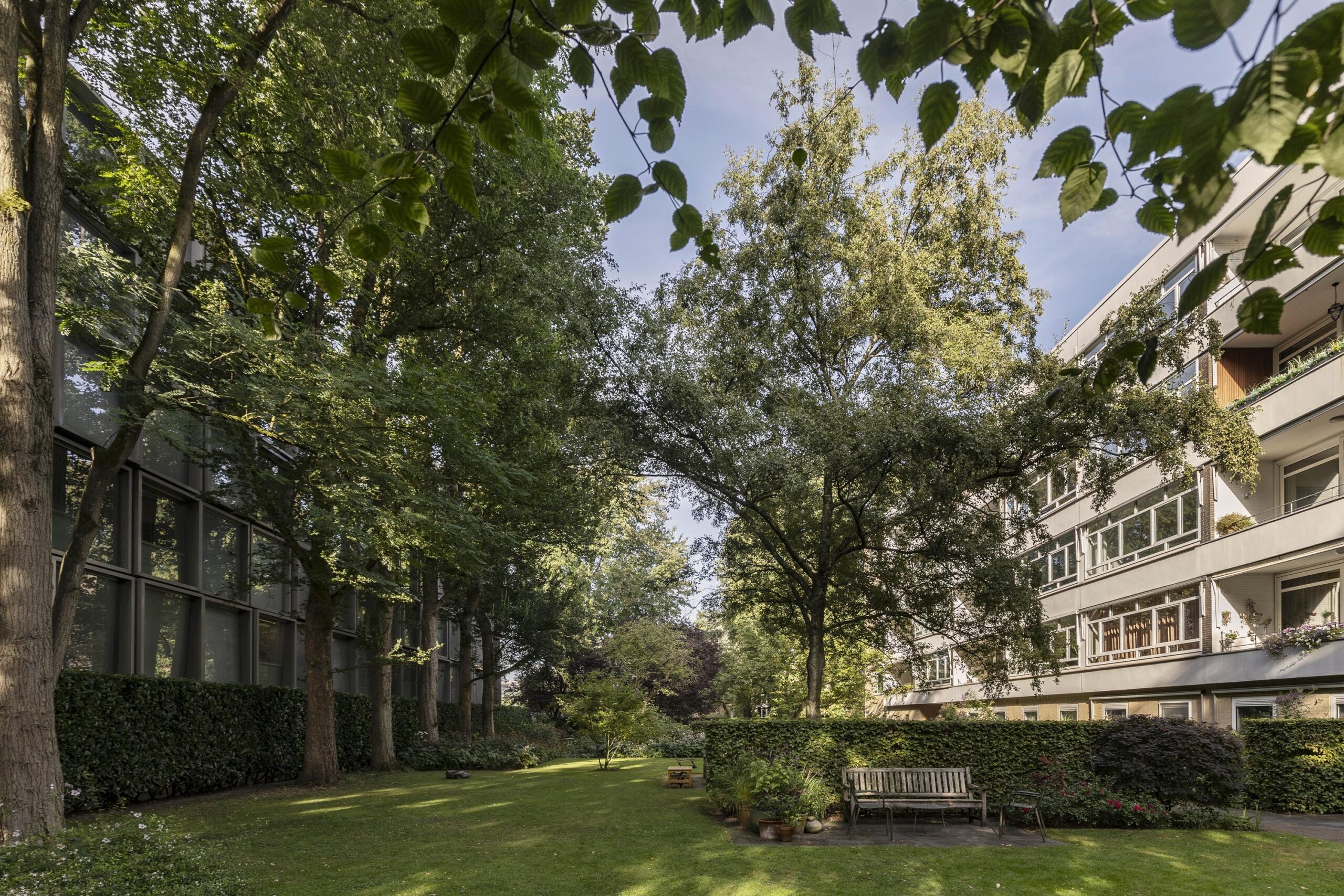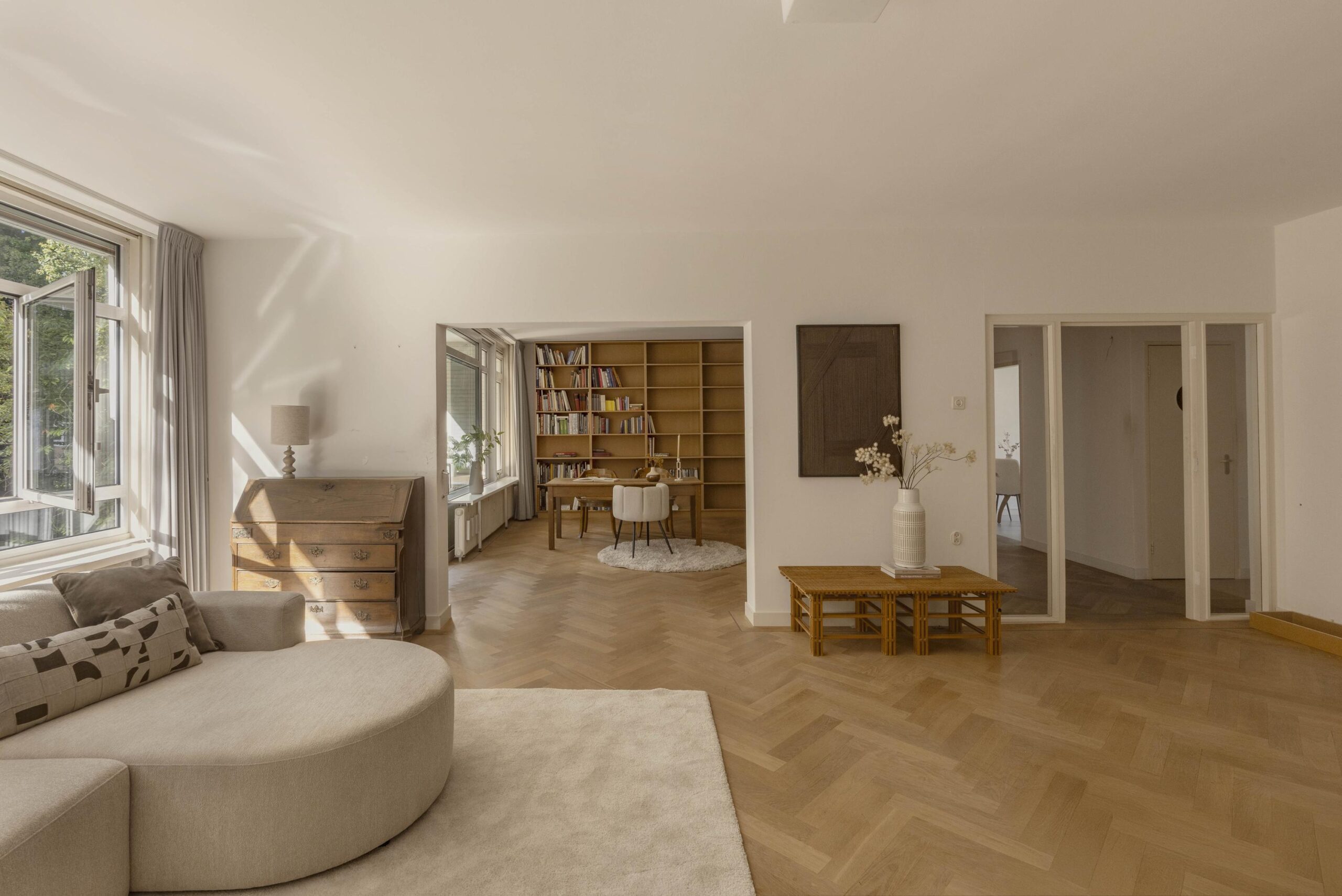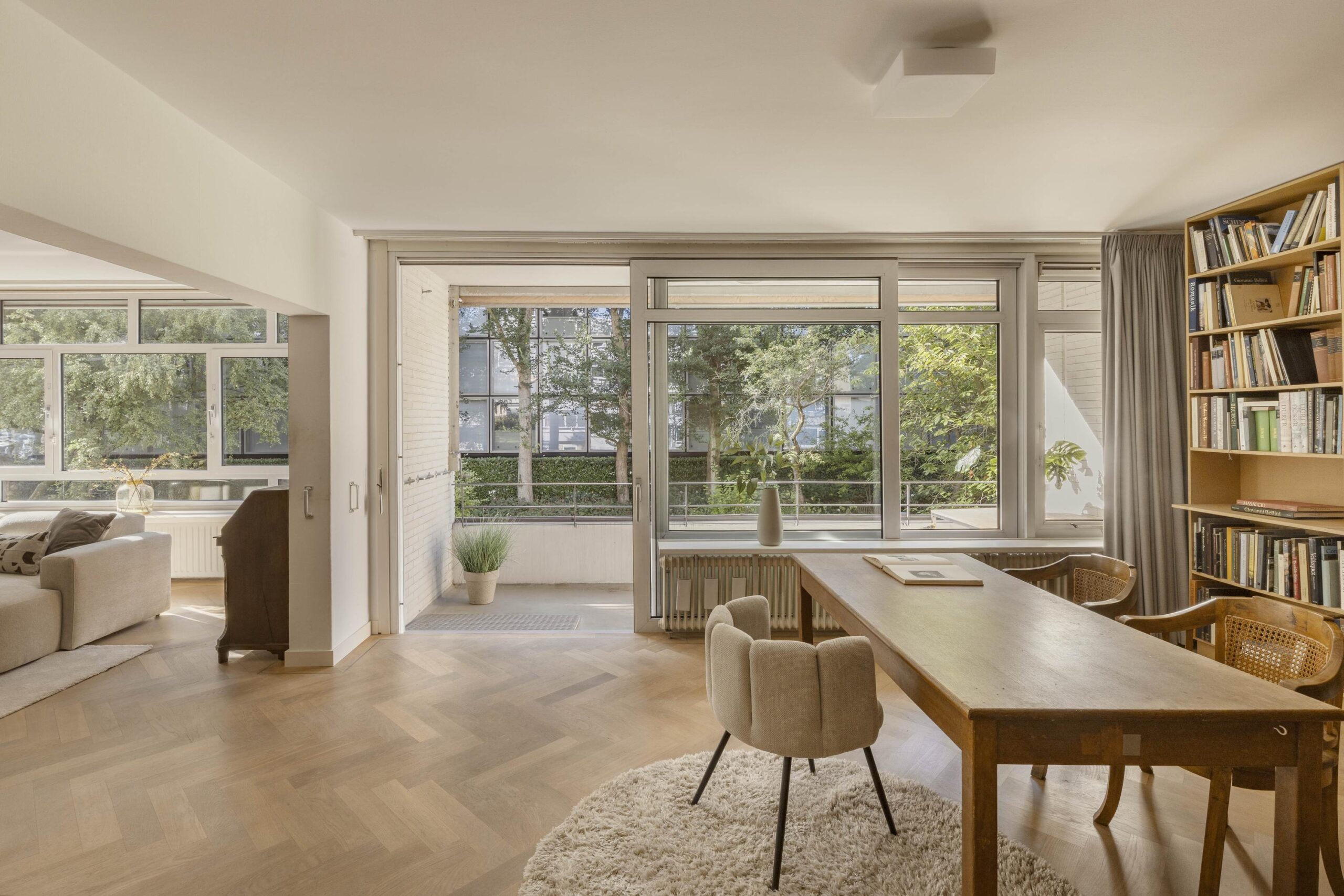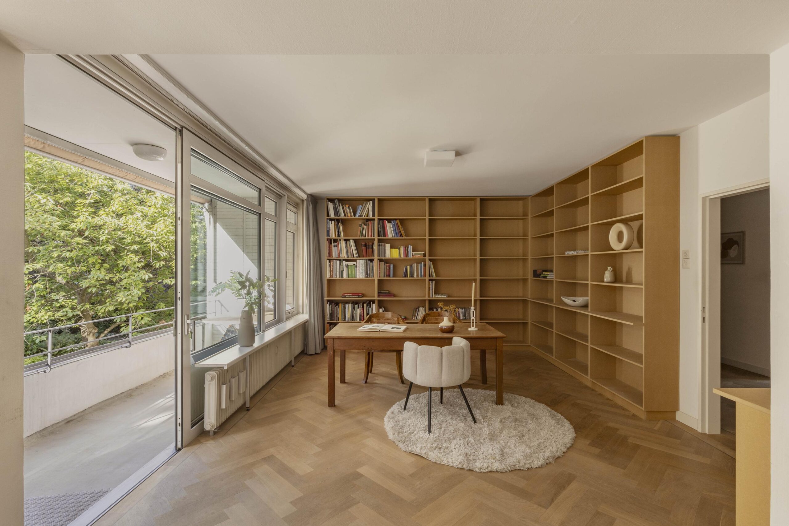 At the front is the spacious living room with an adjoining room, separated by an open passage. This space is well suited as a study or as an extension of the living room and has direct access to the south-facing balcony. The glass facades across the full width provide generous natural light and views of the green inner garden.