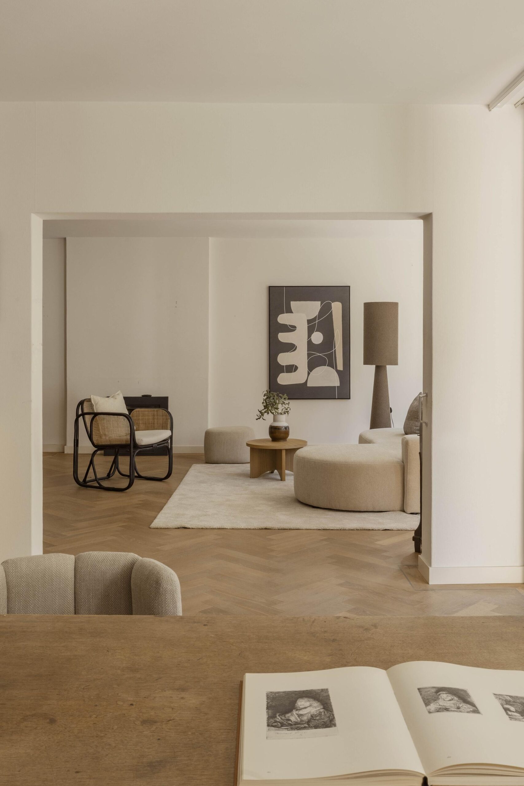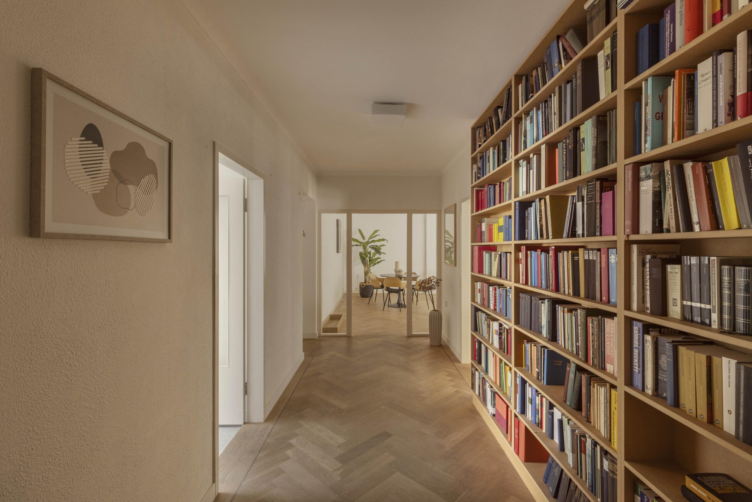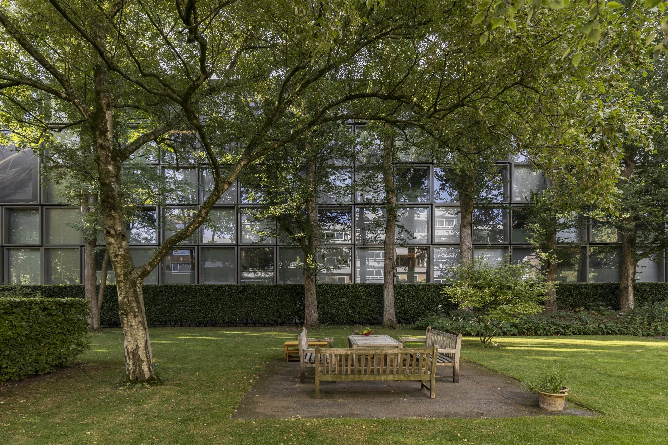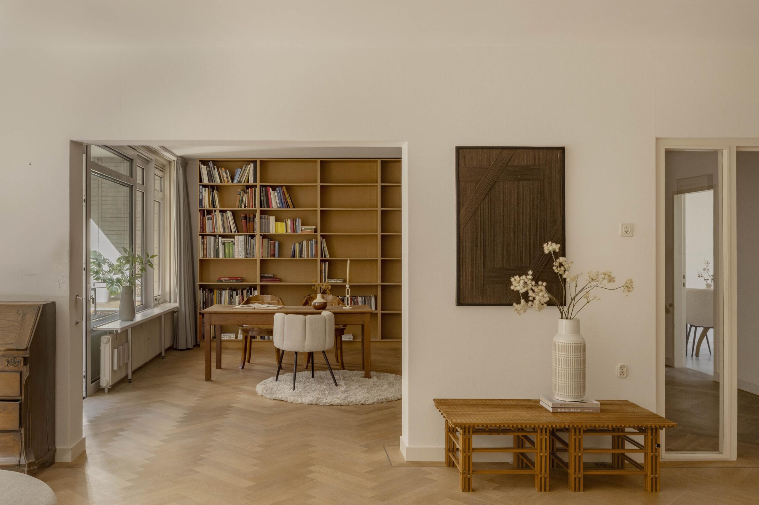 At the front is the spacious living room with an adjoining room, separated by an open passage. This space is well suited as a study or as an extension of the living room and has direct access to the south-facing balcony. The glass facades across the full width provide generous natural light and views of the green inner garden.
