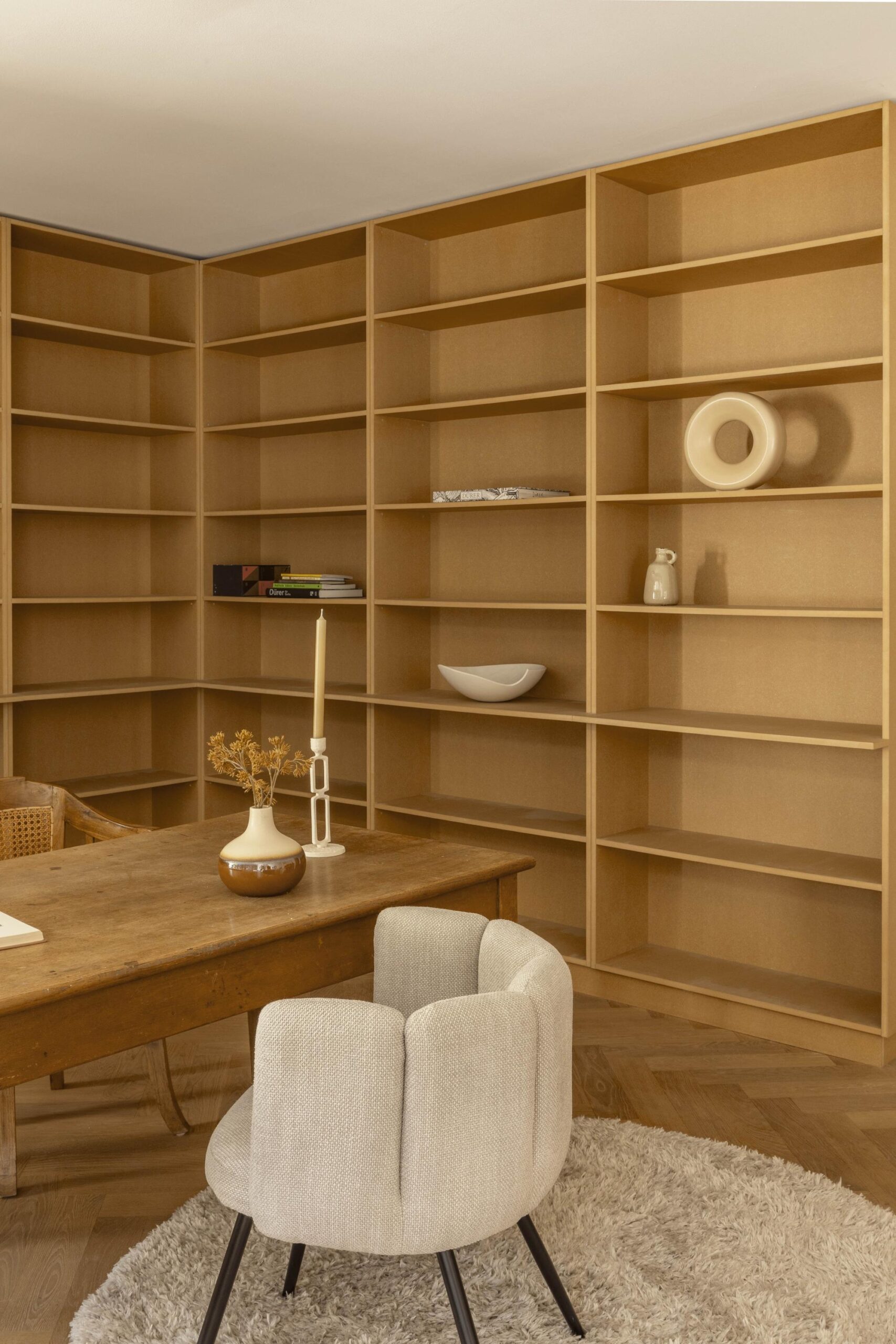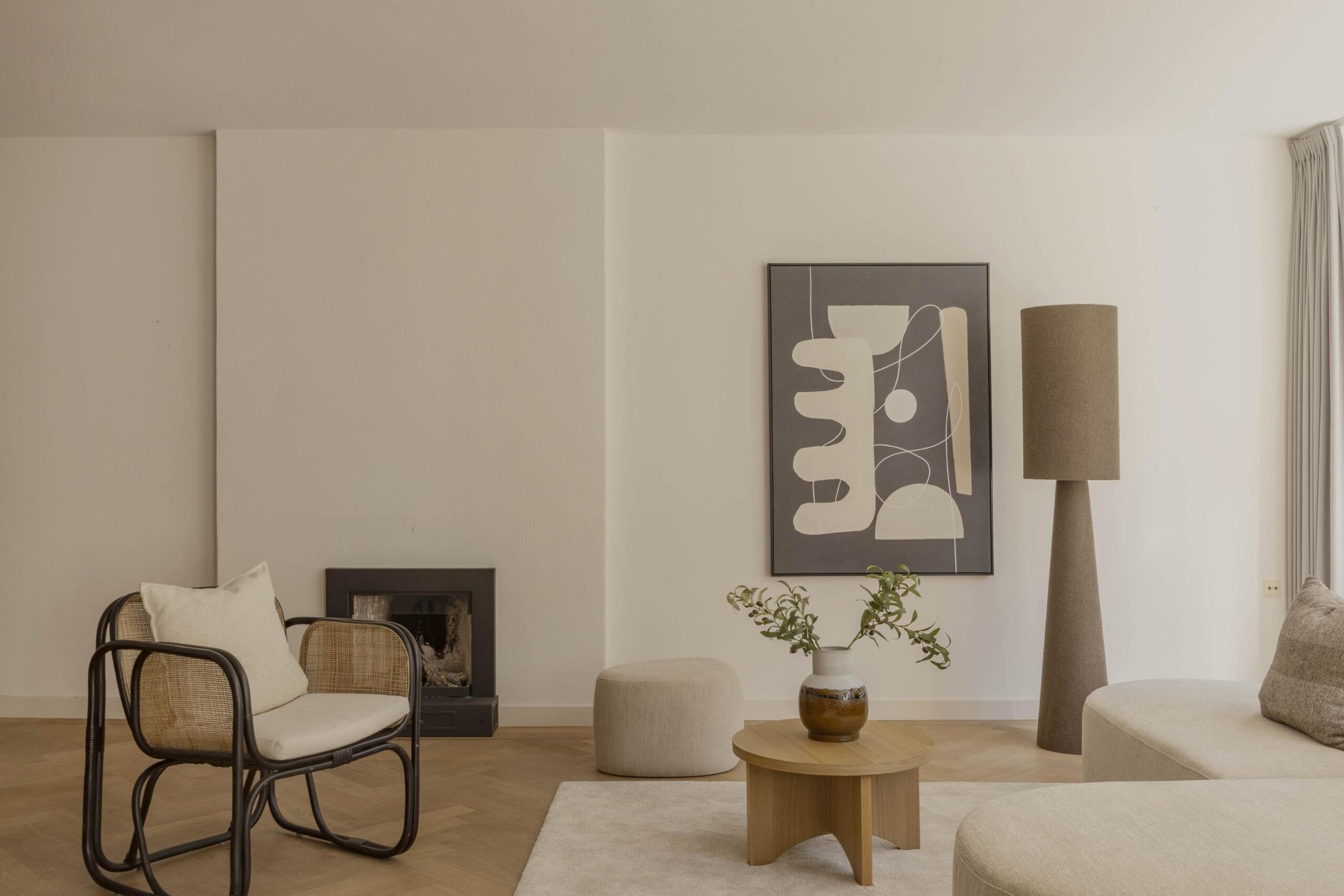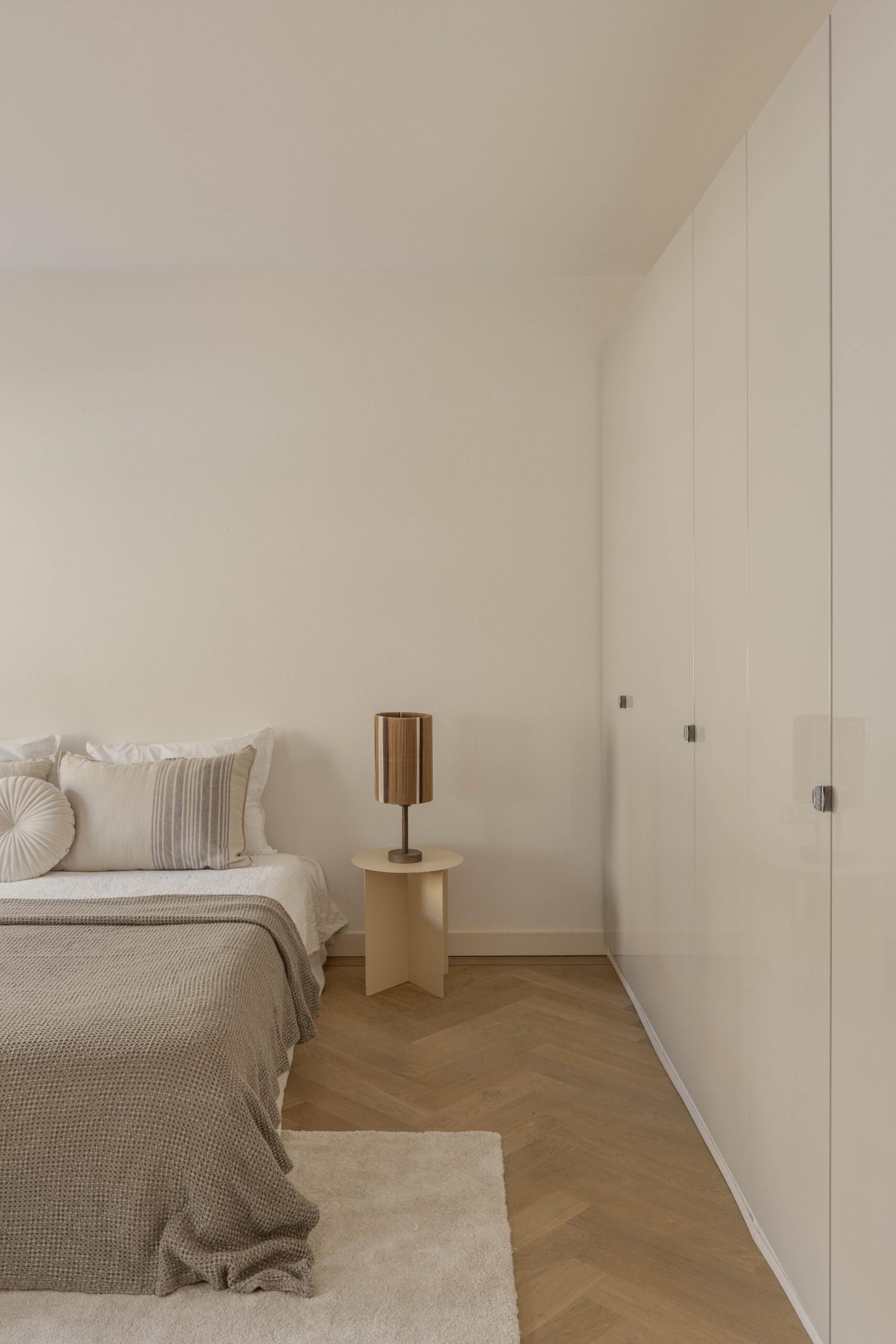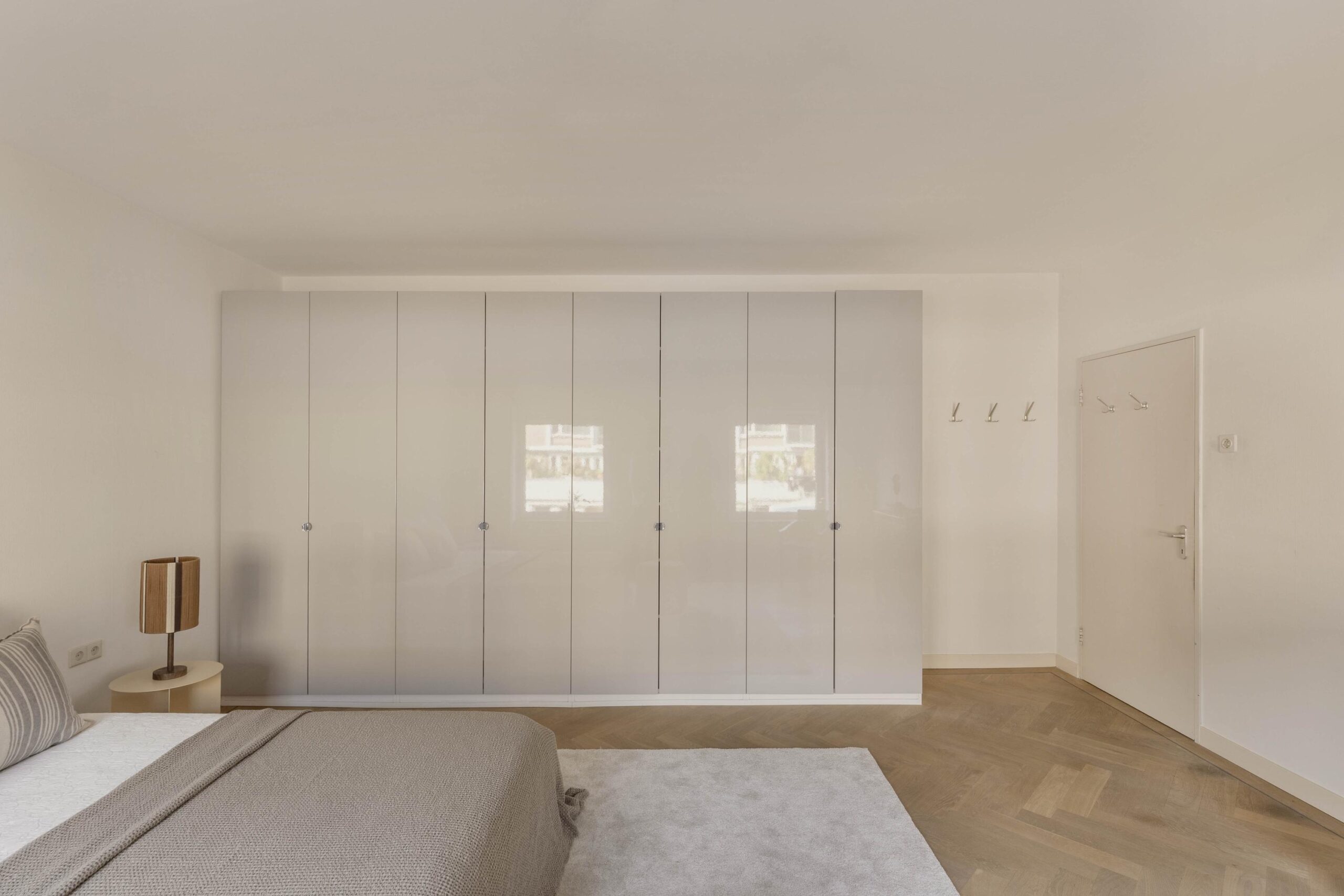At the front is the spacious living room with an adjoining room, separated by an open passage. This space is well suited as a study or as an extension of the living room and has direct access to the south-facing balcony. The glass facades across the full width provide generous natural light and views of the green inner garden.