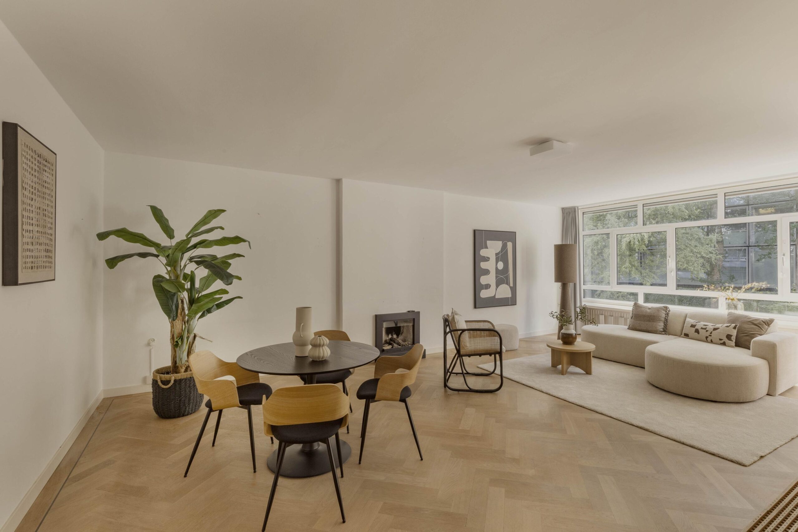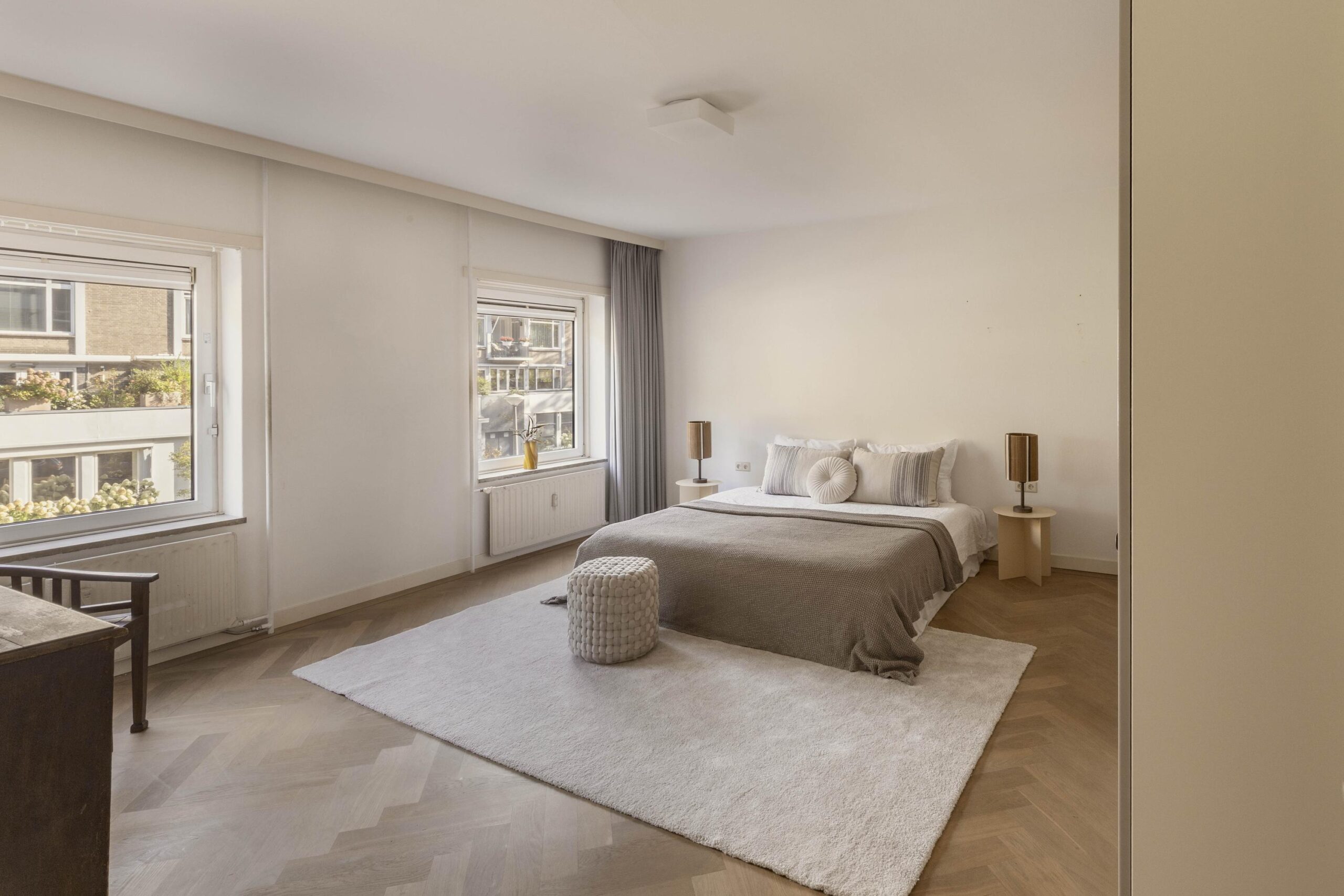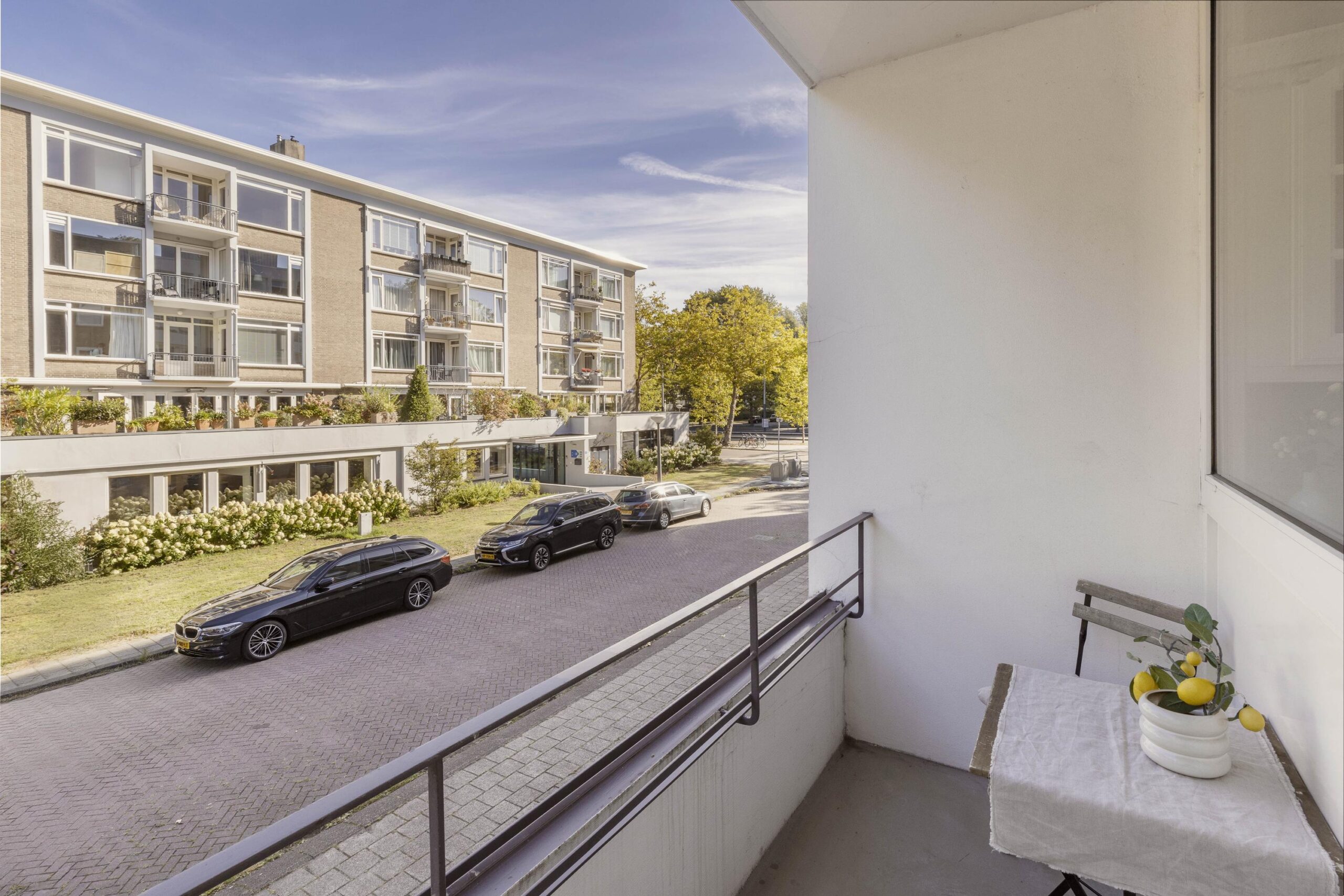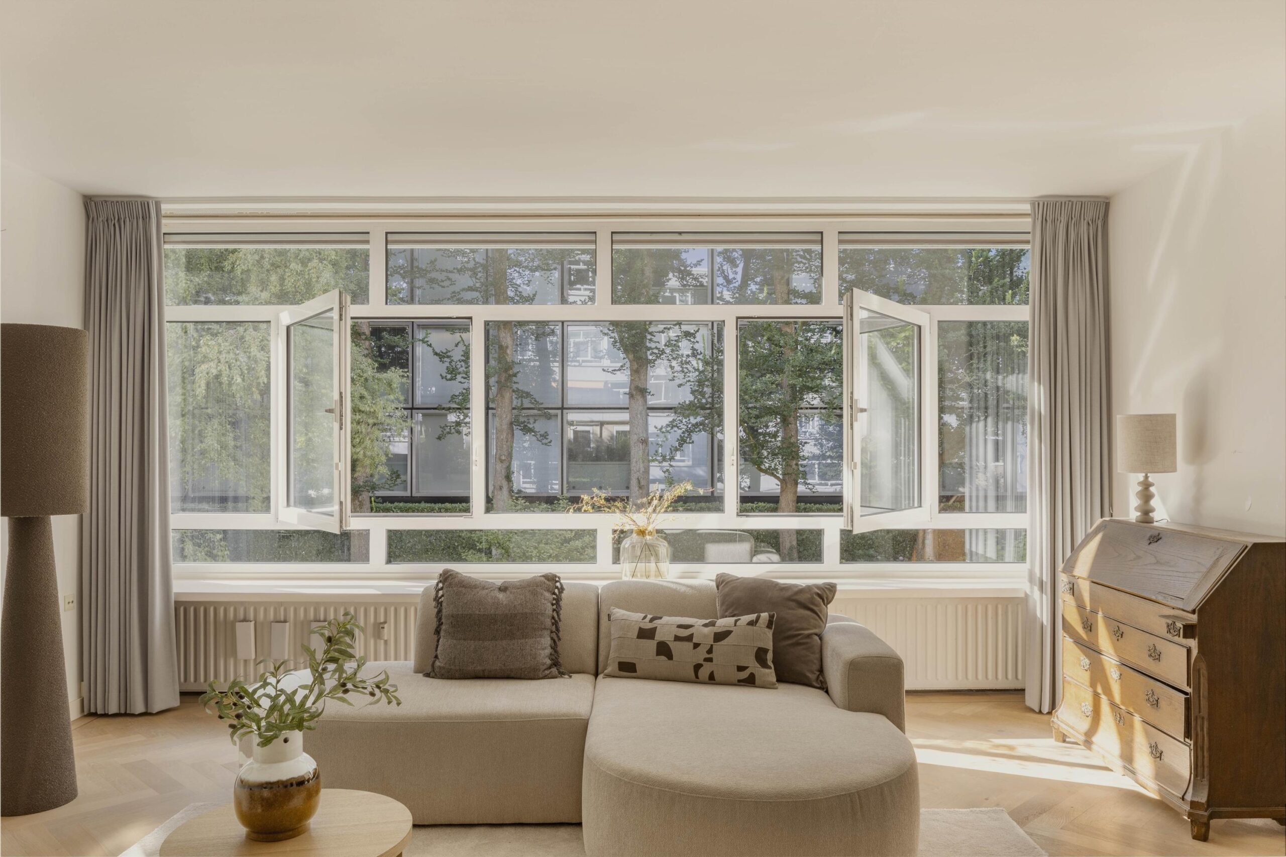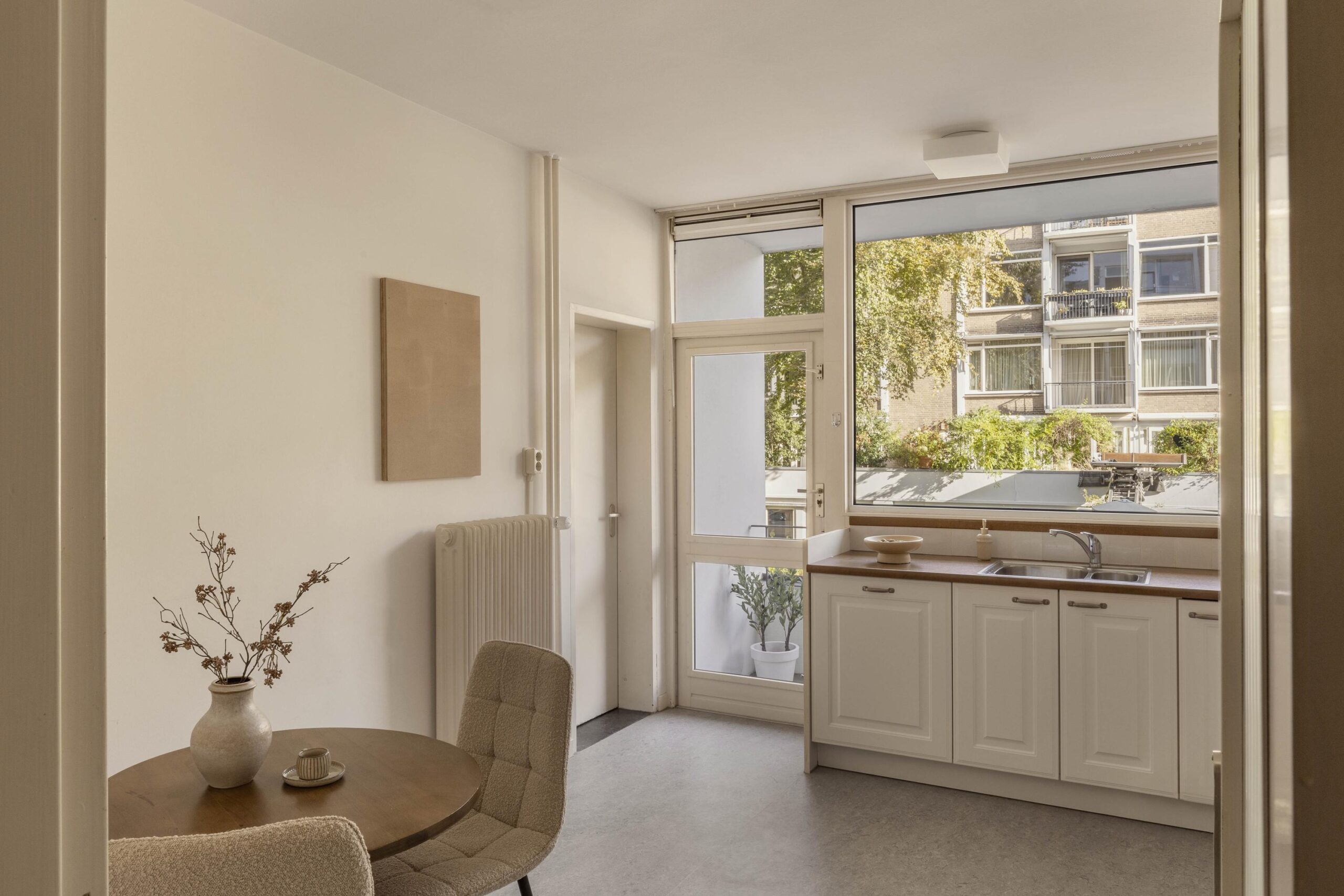 Well laid-out apartment of approximately 131 m² on the first floor of a quietly situated complex in Oud-Zuid, with 2 bedrooms, 2 balconies and an elevator. The property consists of a spacious living room with adjoining dining room, a separate kitchen with utility room and has access to a large communal garden.