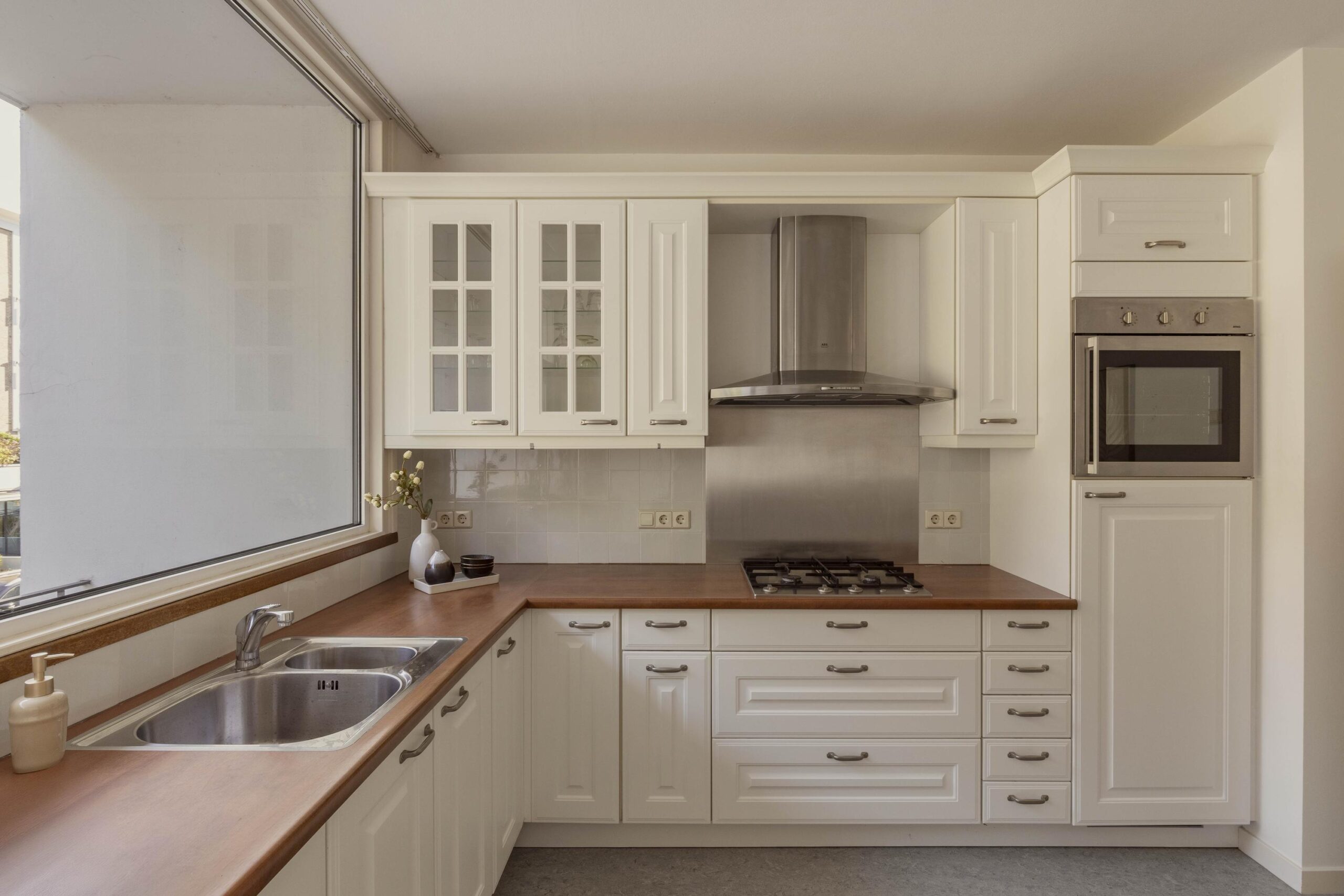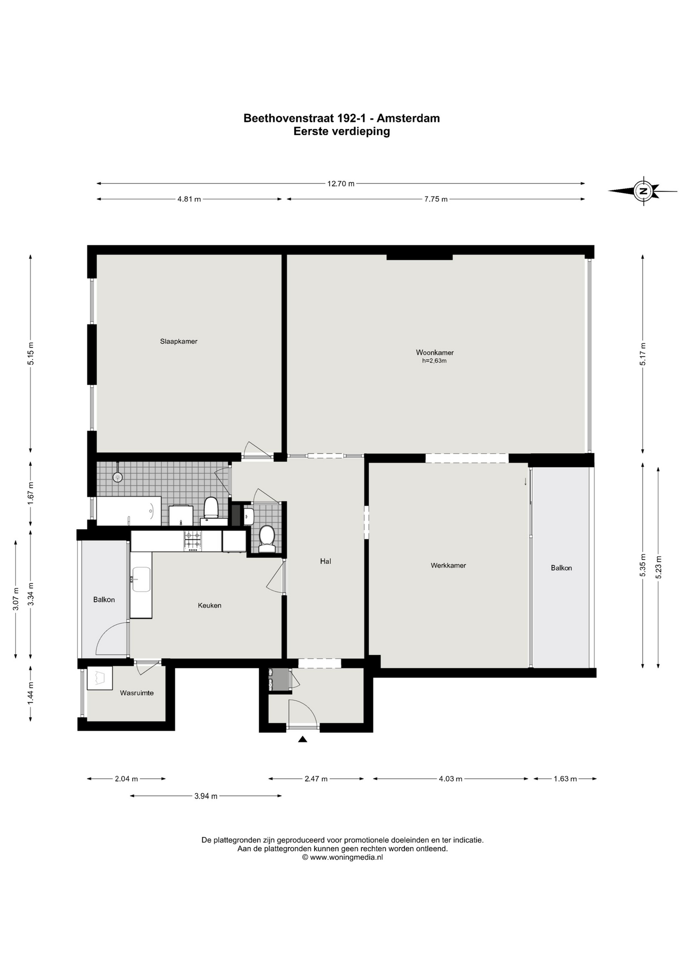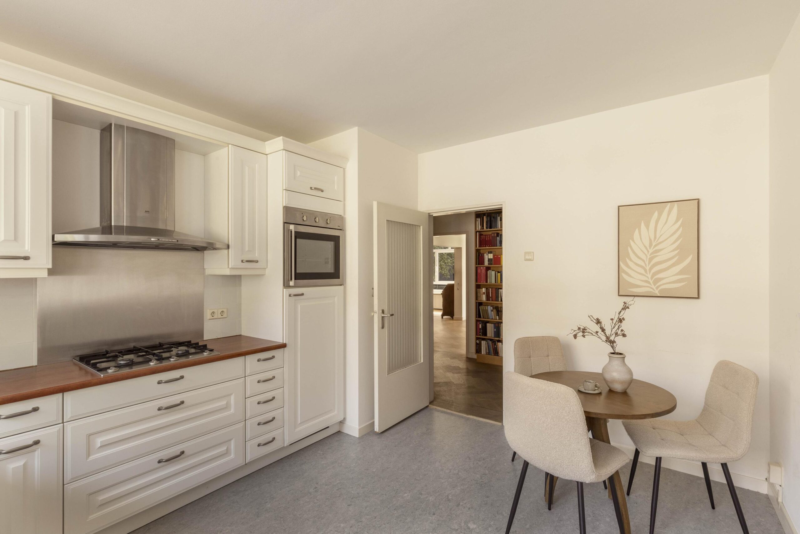 At the rear is the kitchen located, equipped with built-in appliances and ample cupboard space. From here there is access to a second balcony in the morning sun. An adjacent utility room offers additional storage space and room for laundry appliances.