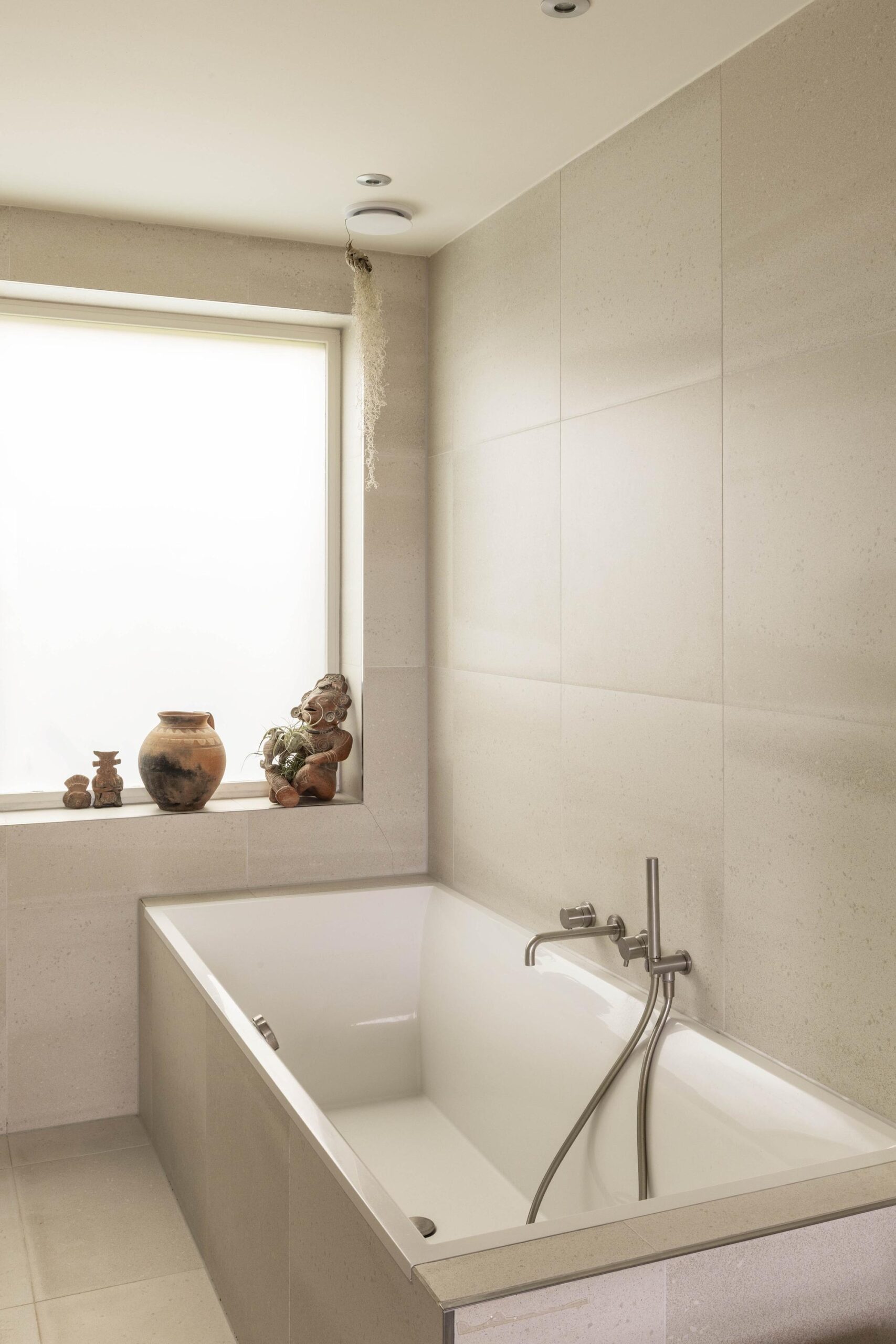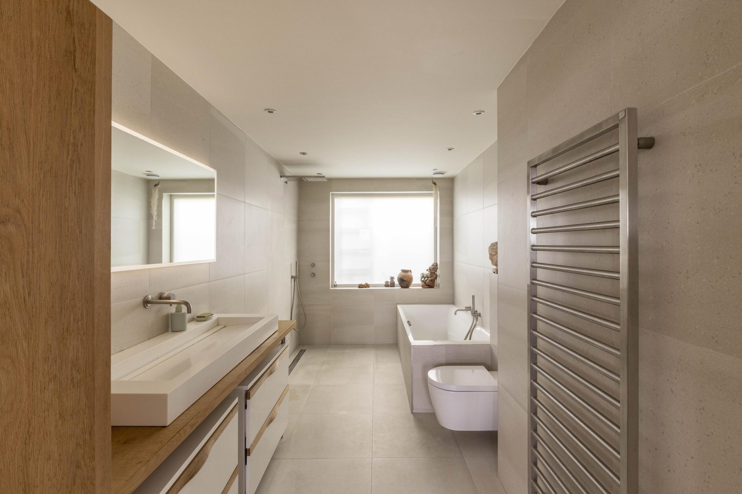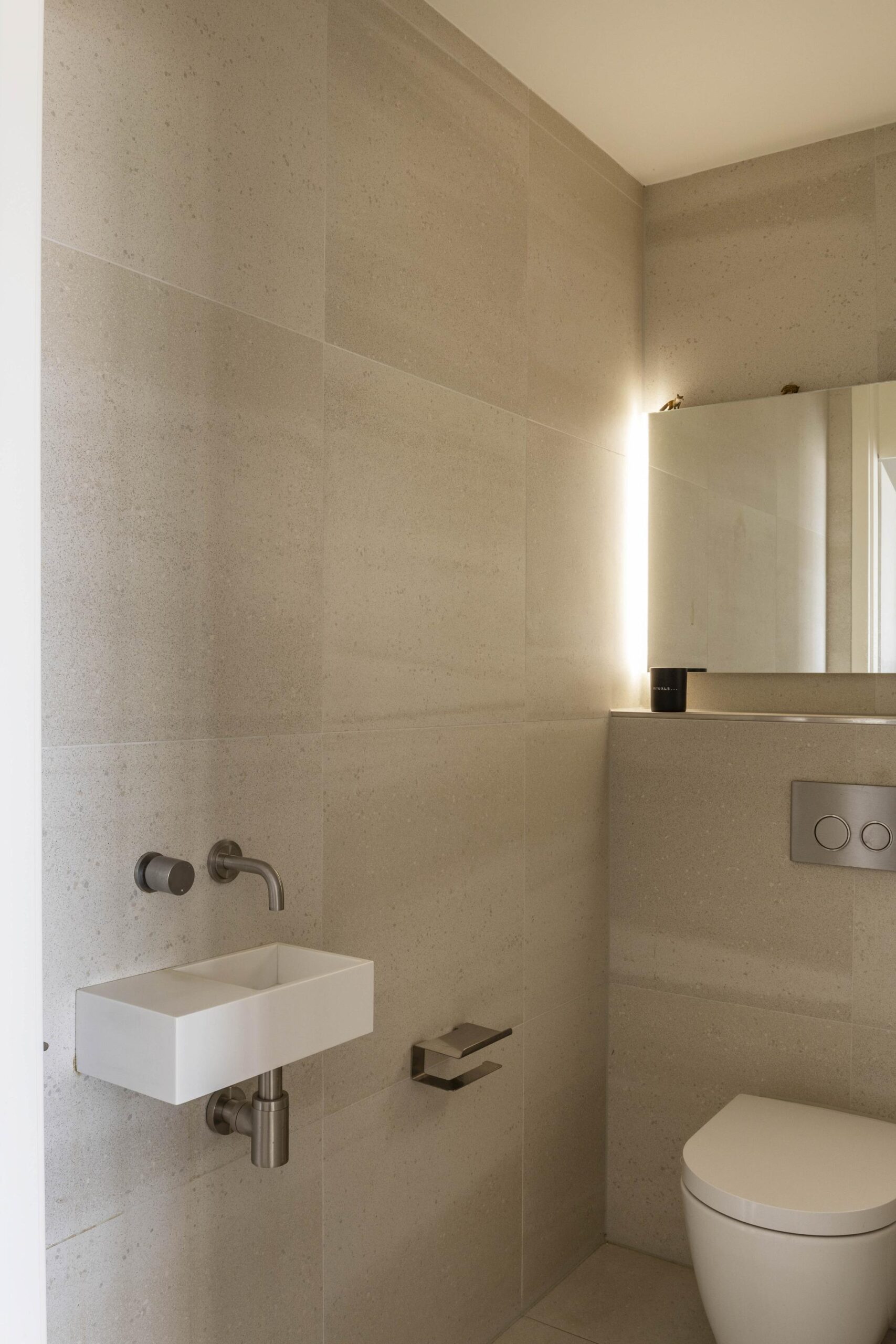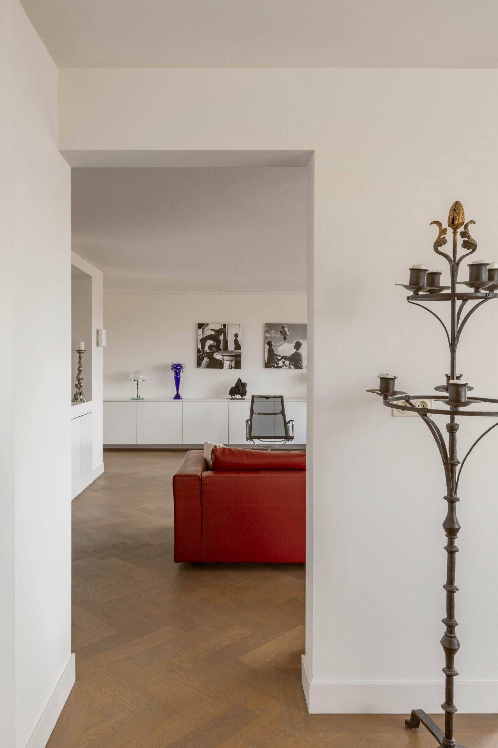 In the right wing there are 3 (bed)rooms. The master bedroom provides access to the balcony through French doors. The modern bathrooms are equipped with a bathtub, walk-in shower, double sink, and toilet. Adjacent is a second (bed)room with steel doors, currently used as a study and library space.
