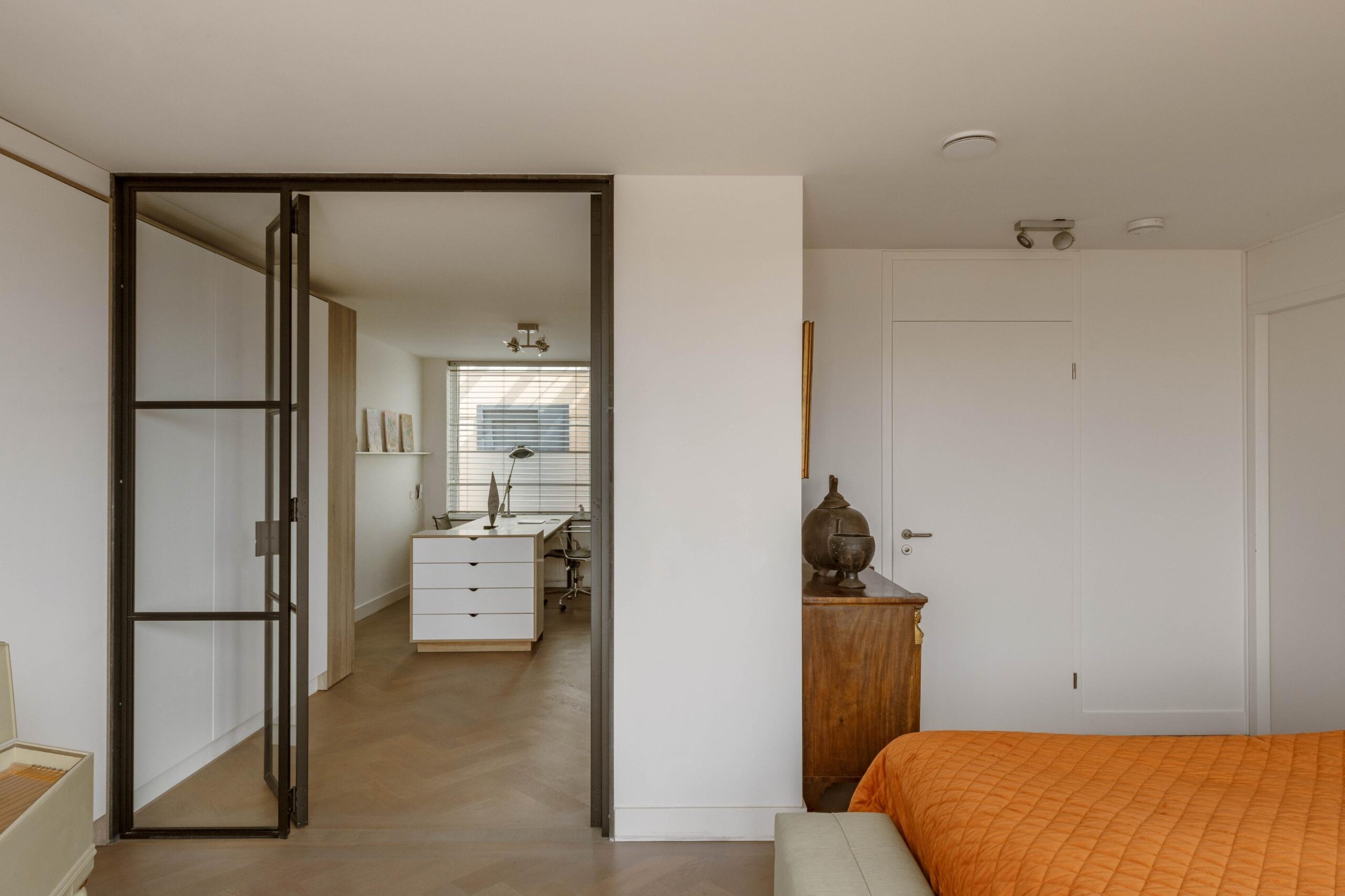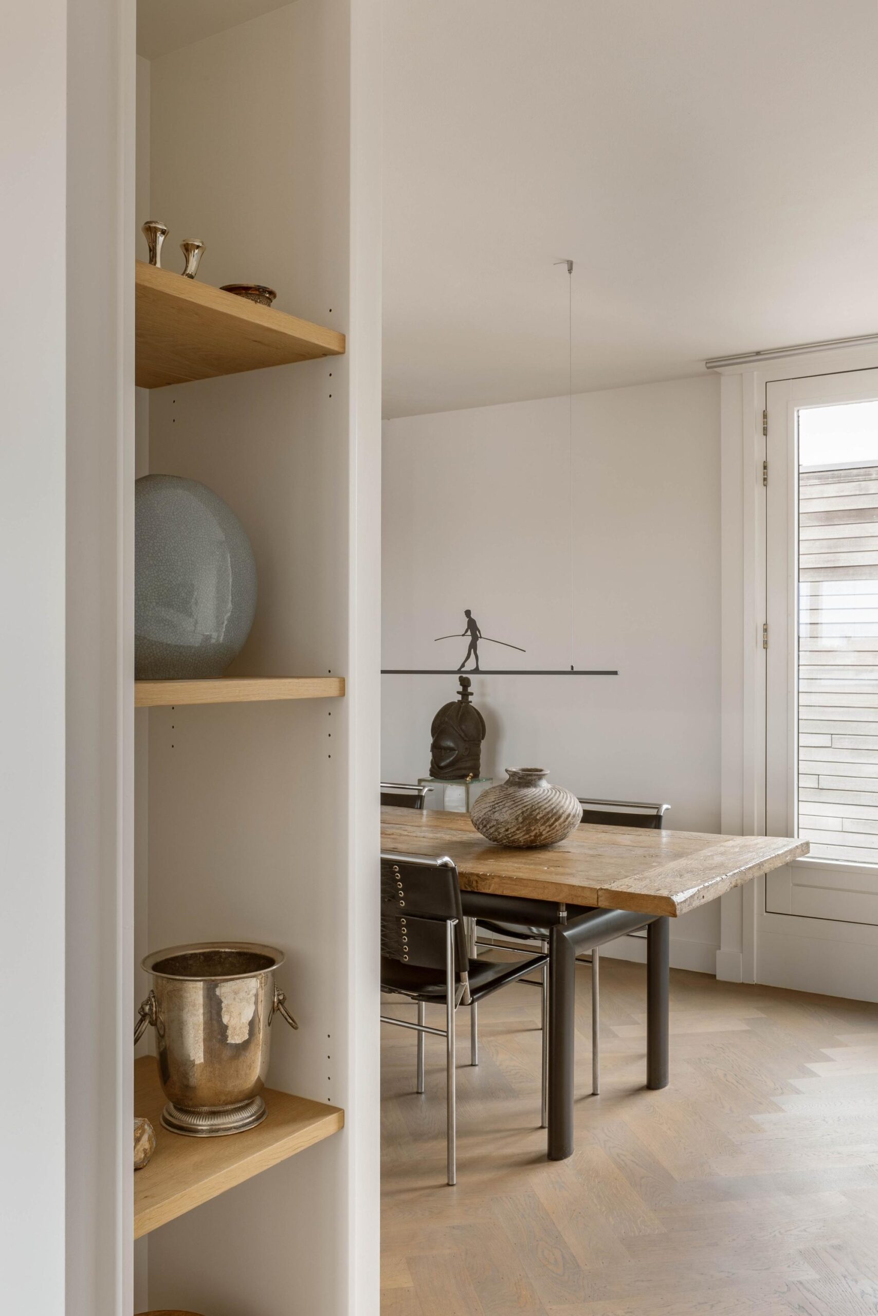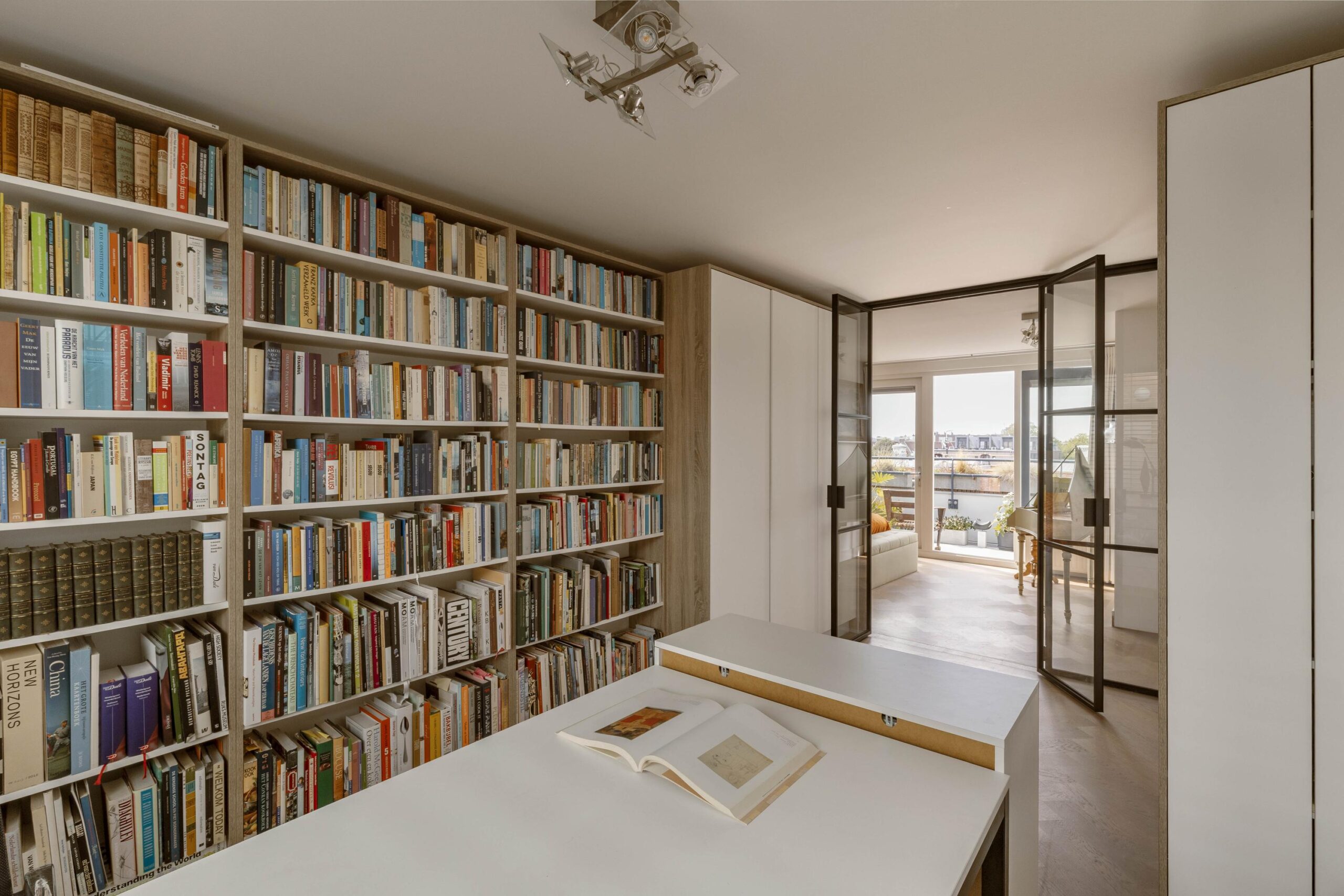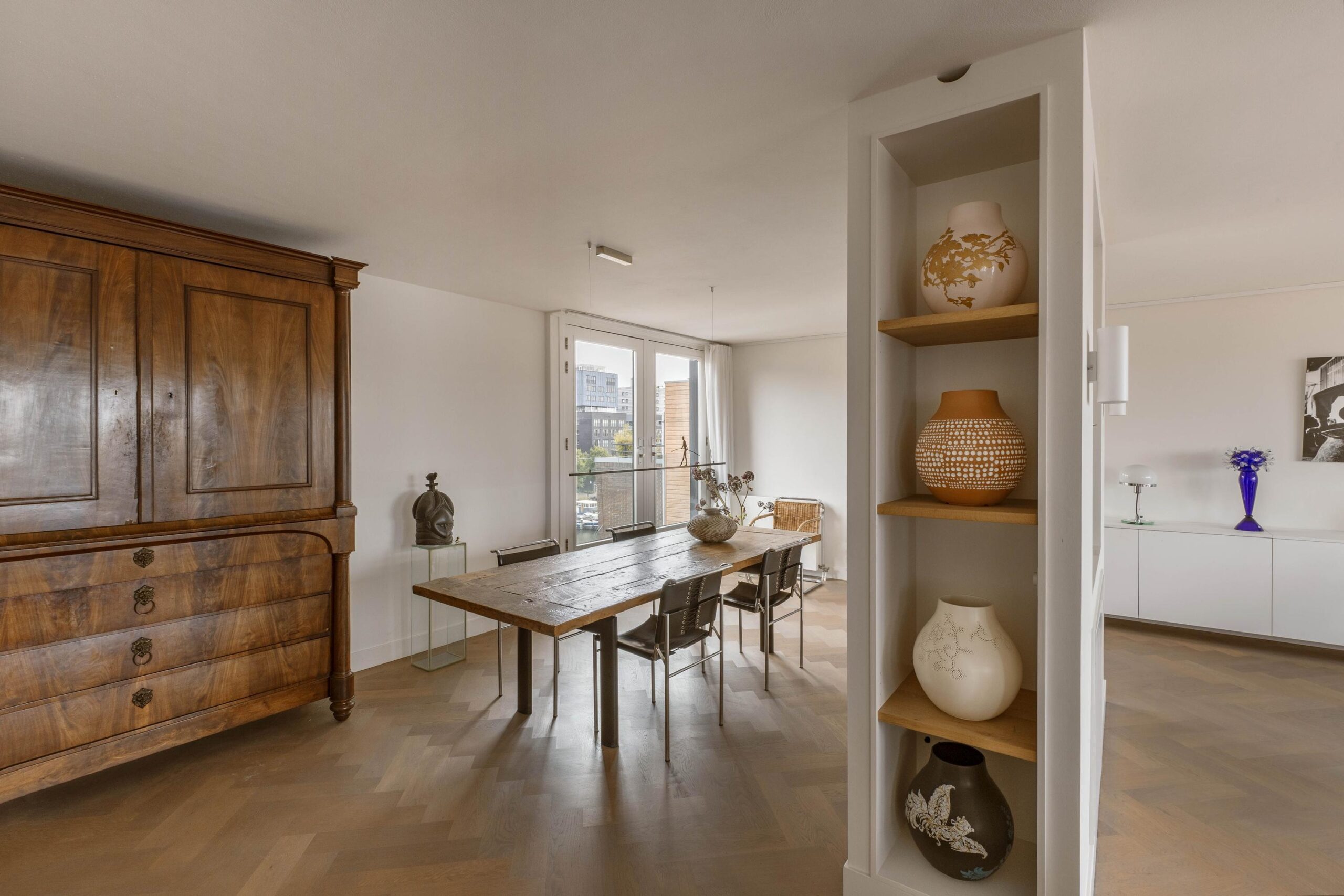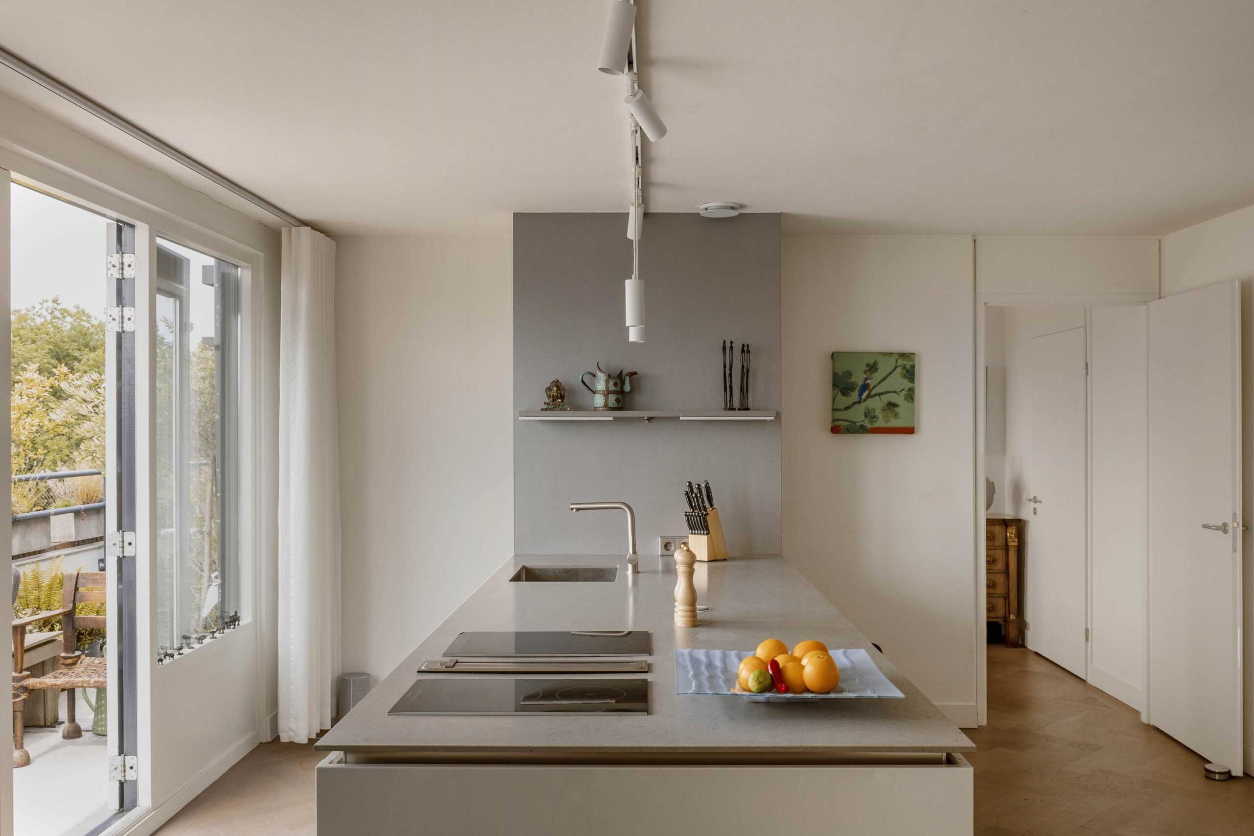 The large living area is characterized by the generous windows that provide an abundance of light and a beautiful view over the city. The open kitchen with cooking island forms a spatial whole together with the living area and offers direct access to the terrace with afternoon and evening sun. From the dining area there is a view of the water of the Westerdok.