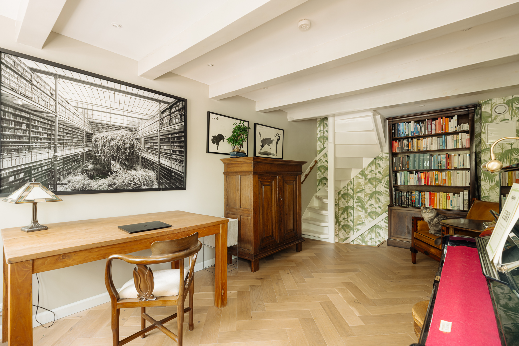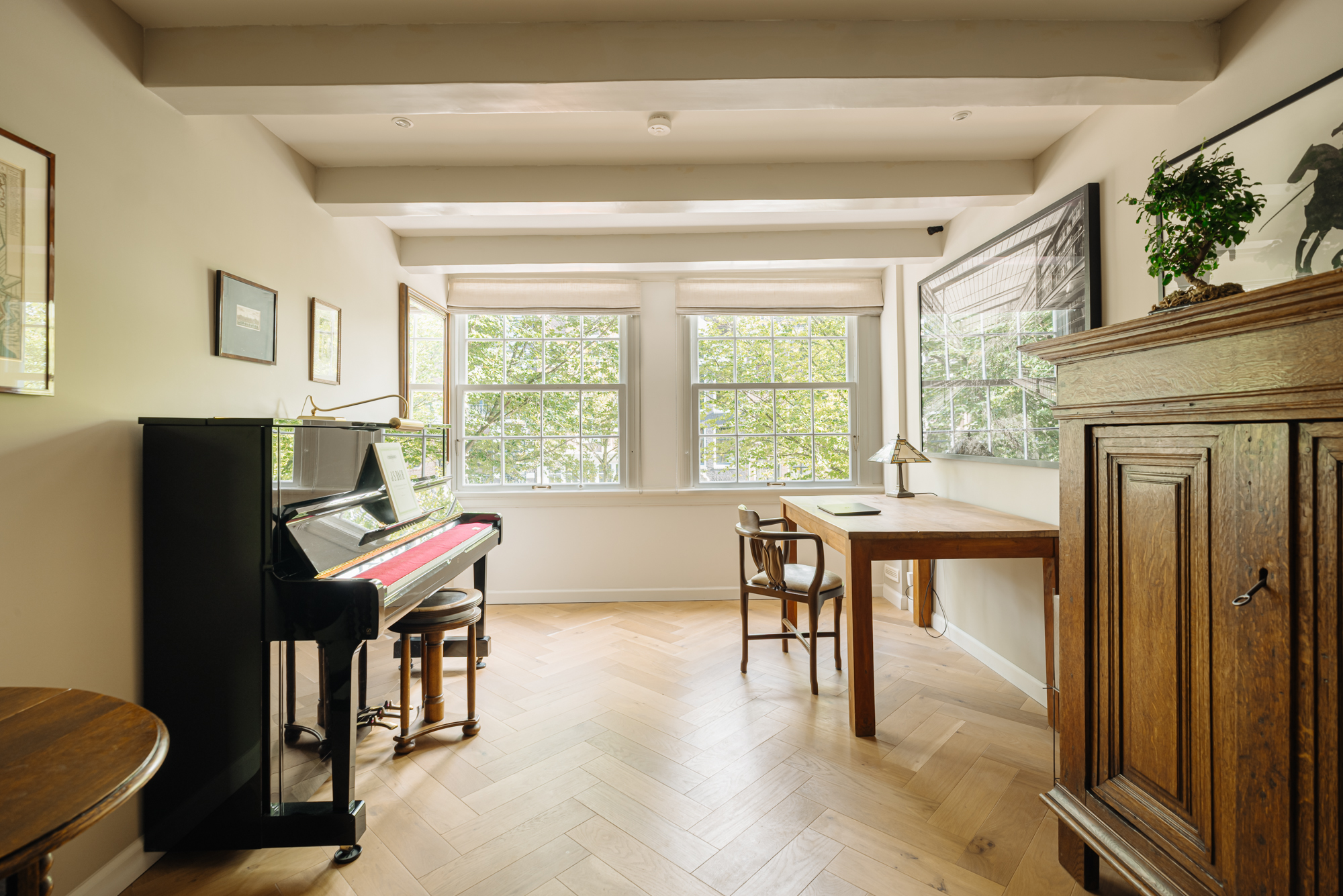 The first floor is arranged as a living room with views over three canals. During the renovation, the monumental floor structure was exposed and left visible as a ceiling feature. The space is finished with an oak herringbone floor. A separate toilet is located at the rear.