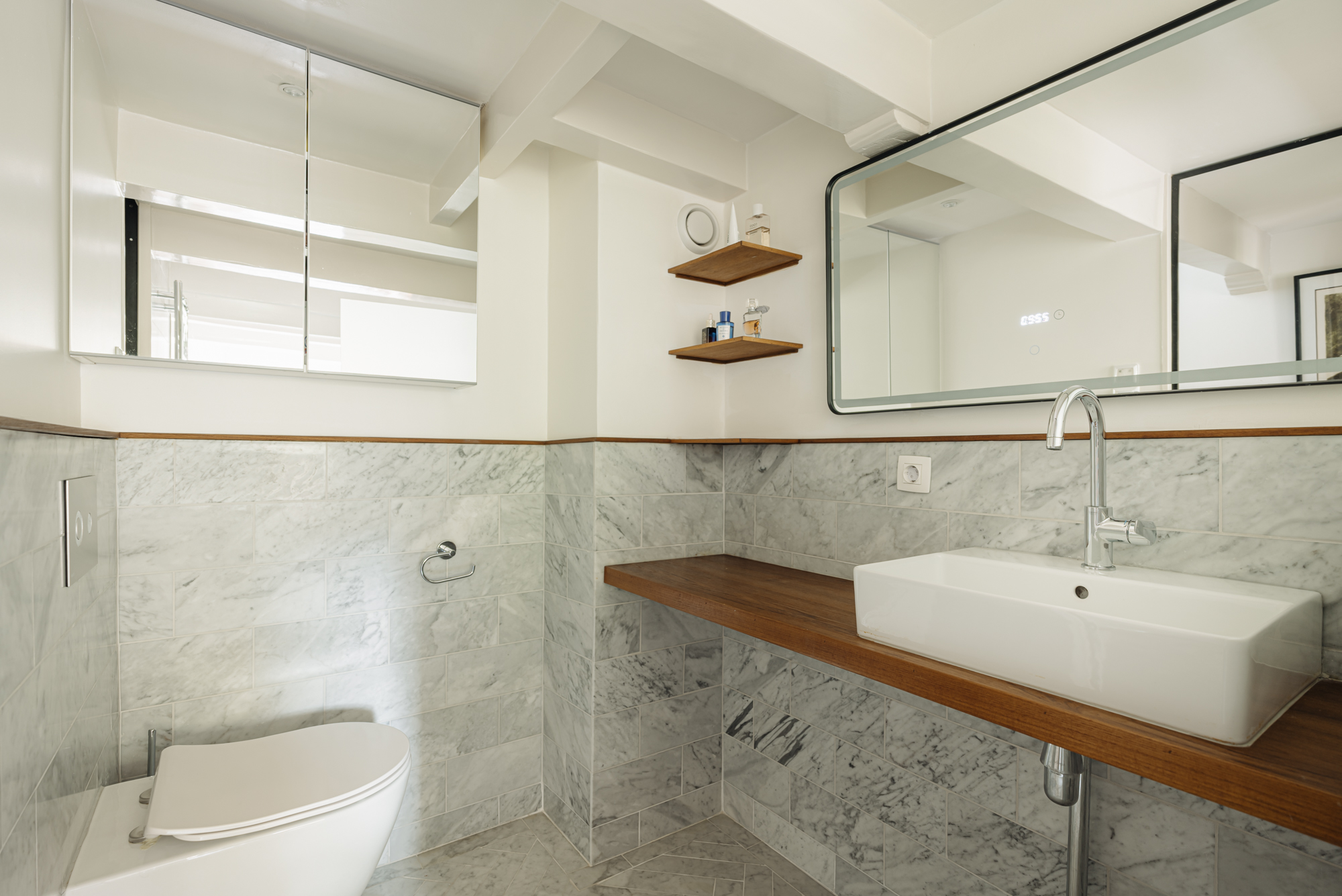 The third floor offers a bedroom and a luxuriously finished bathroom with walk-in shower, toilet and washbasin.