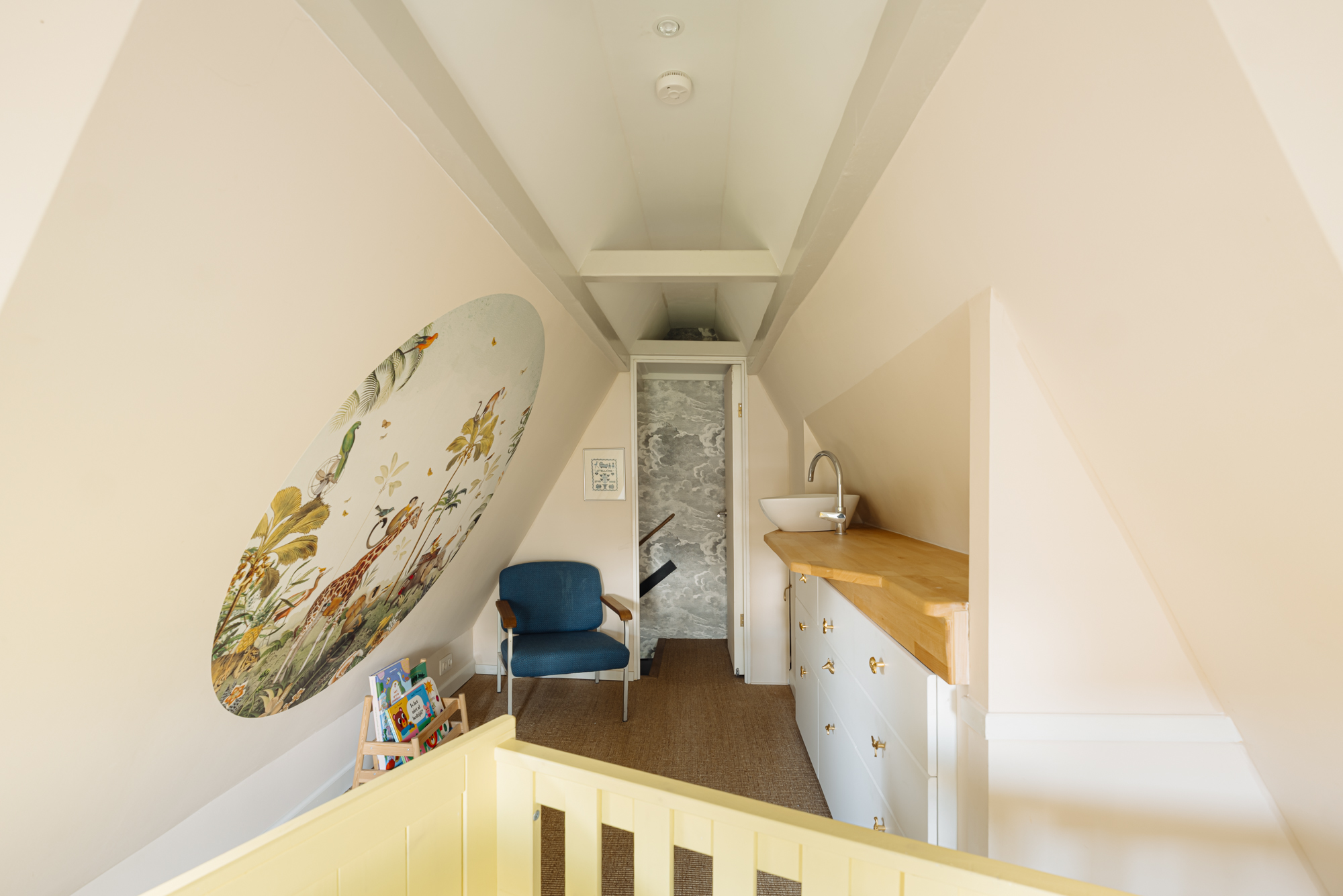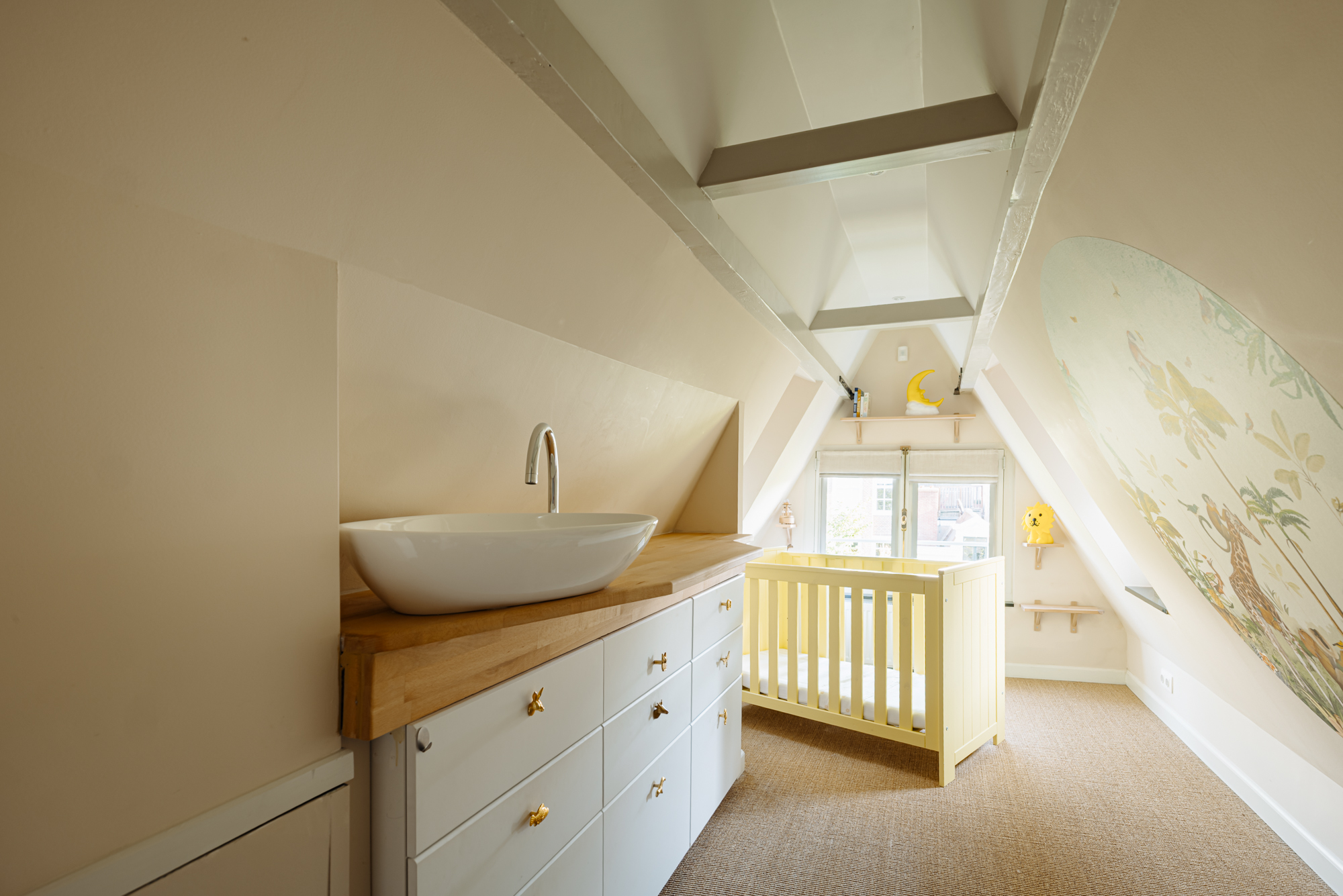 The attic level is arranged as a multifunctional room with its own washbasin and built-in storage, perfectly suited for use as a guest room, children’s room or study.