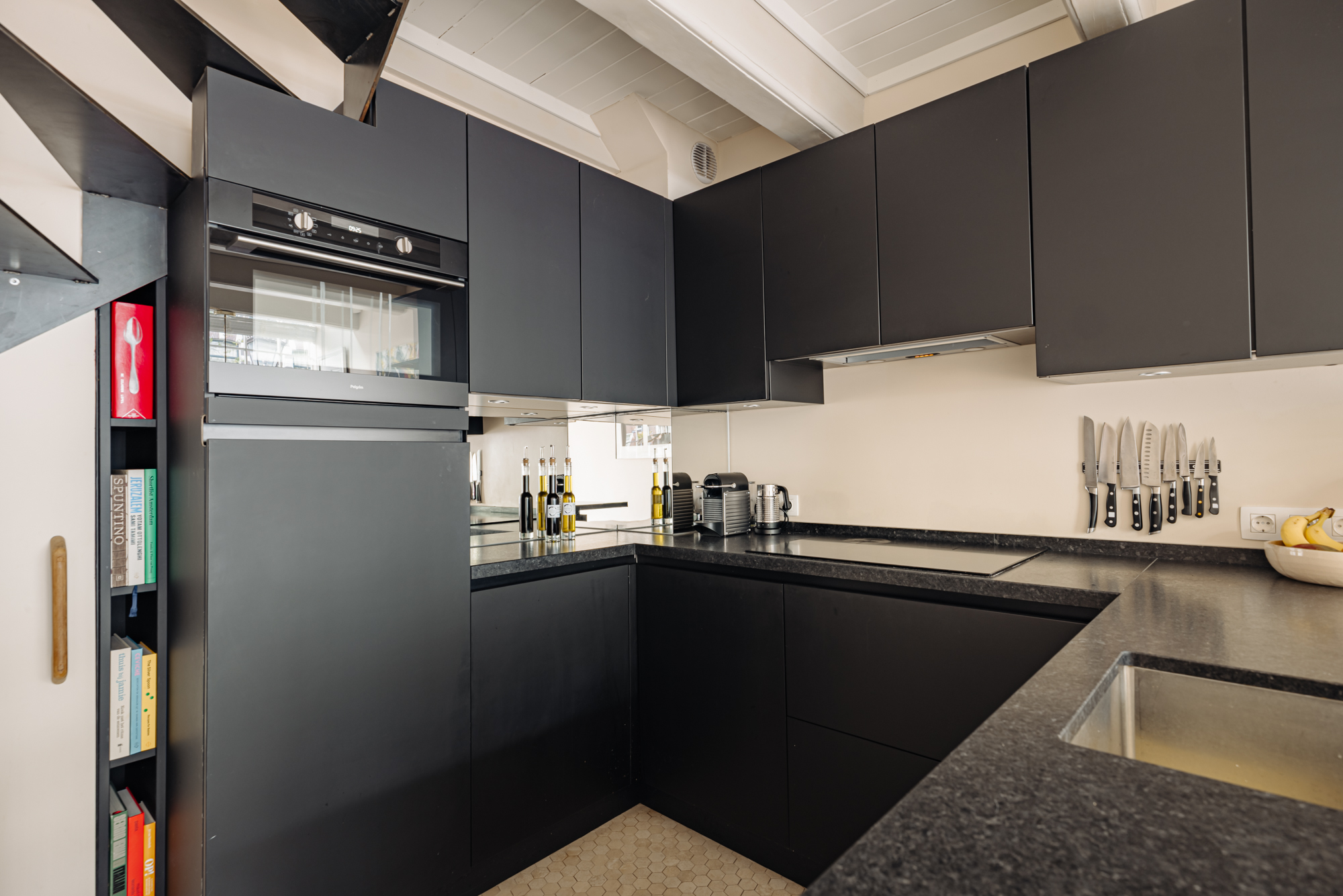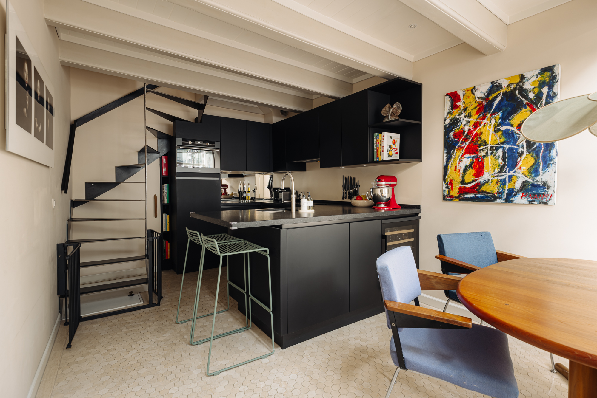 Upon entering on the ground floor, you arrive in a live-in kitchen fitted with a modern kitchen unit with built-in appliances and a wine cabinet, recessed spotlights and a travertine hexagon floor. Additional light enters through the glass floor panels on the first floor. At the front, a cosy dining area has been created with a built-in window seat, ideal for looking out over the canal in summer. At the rear, a stylishly illuminated staircase leads to the upper floors, and the basement is also accessible from here.