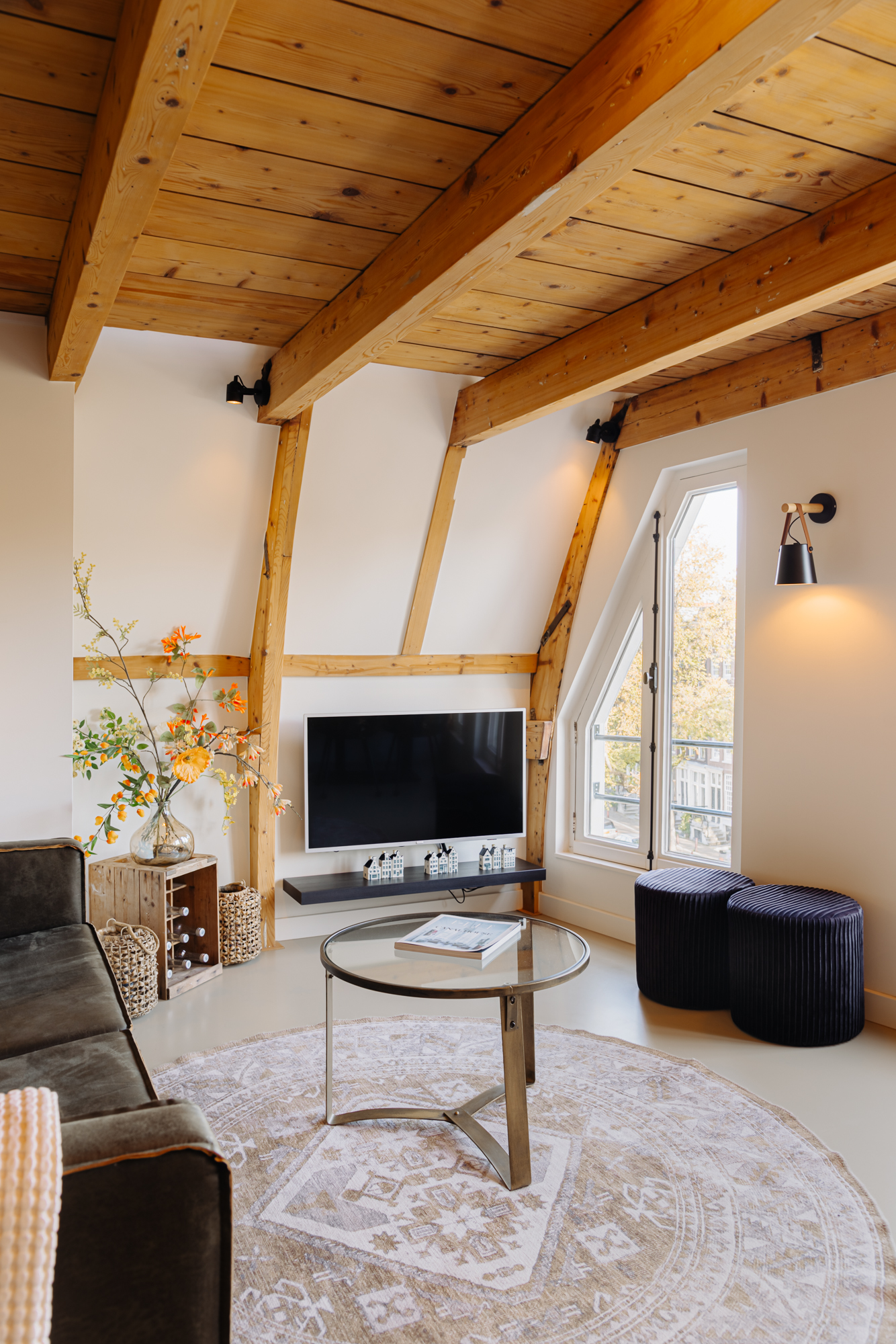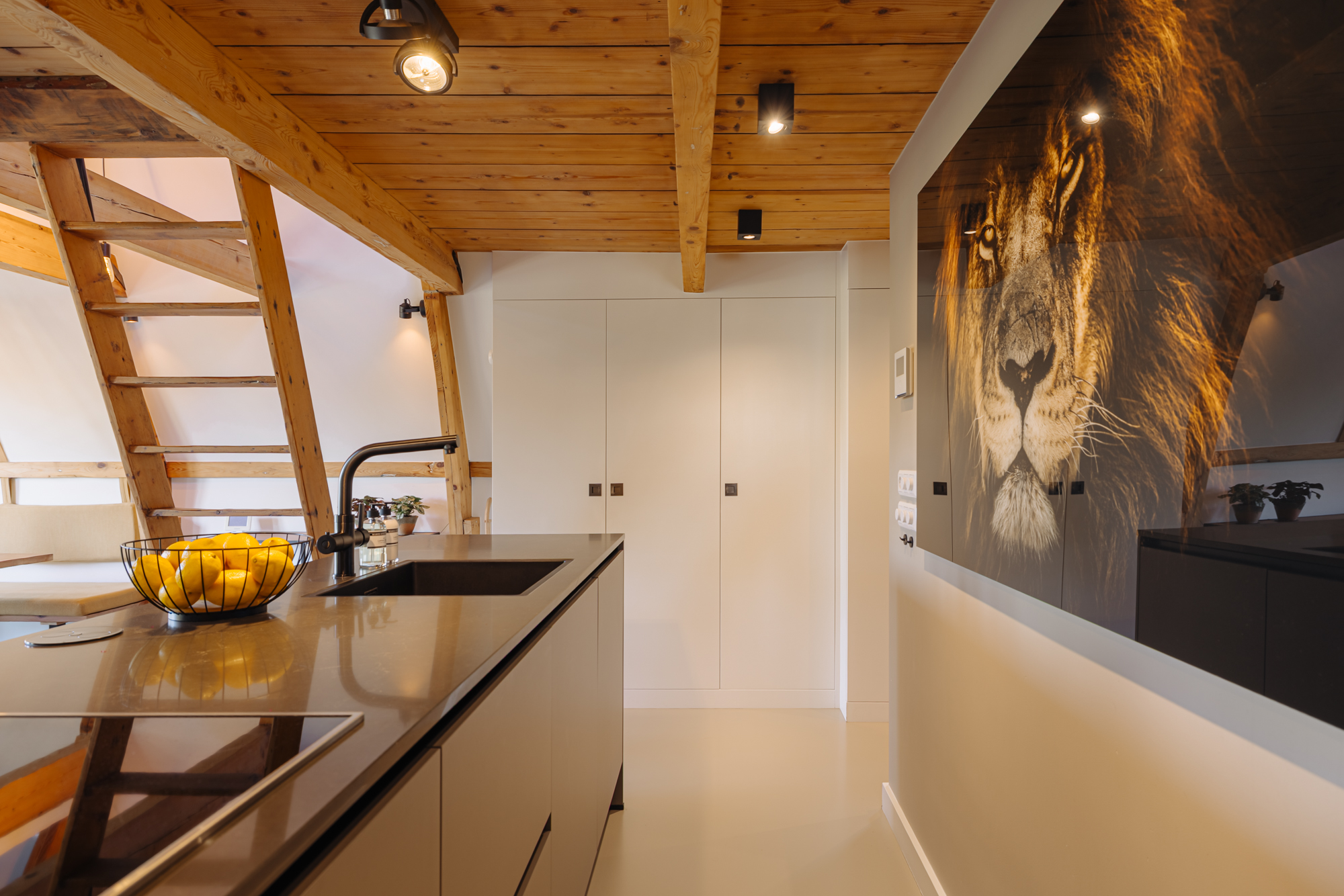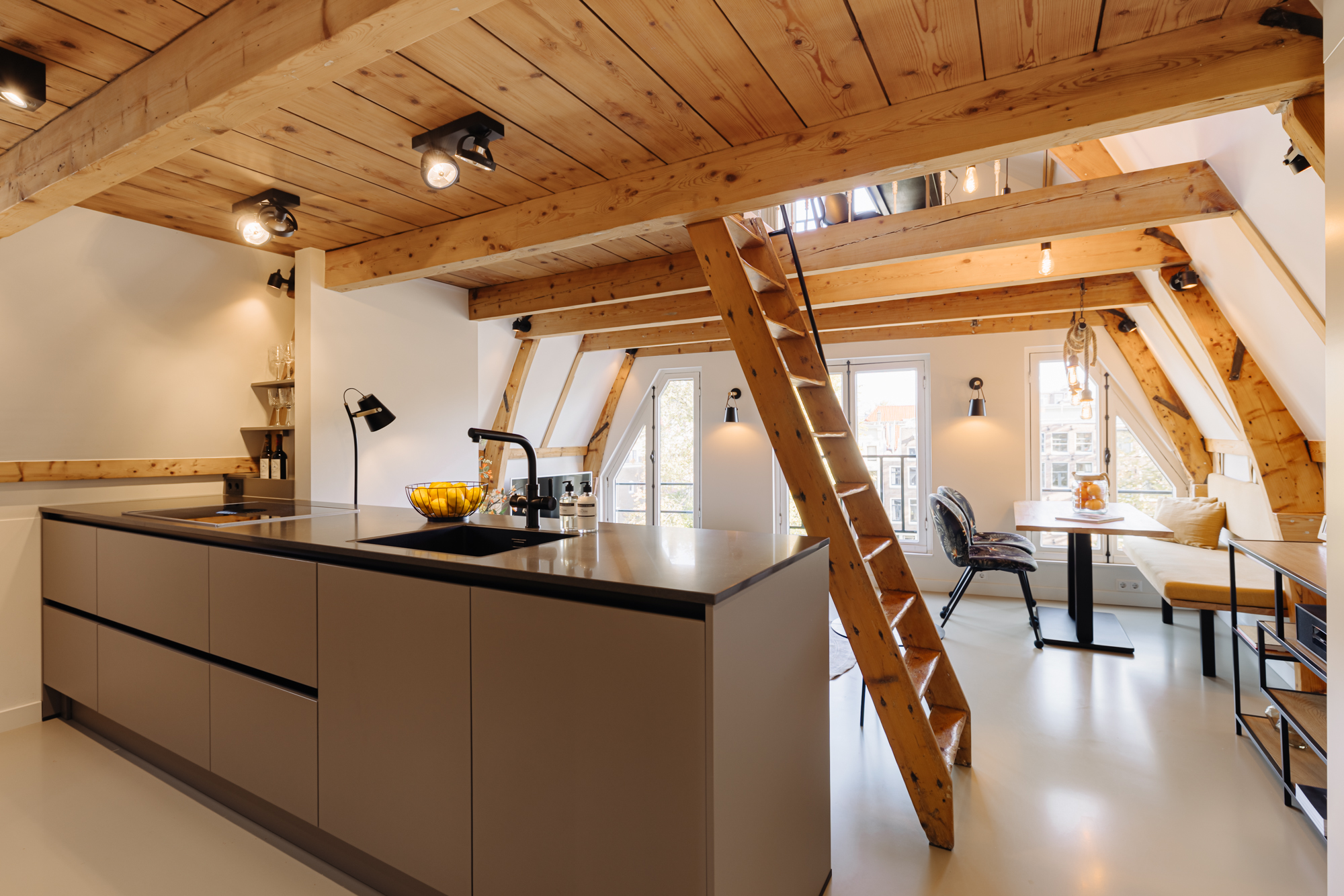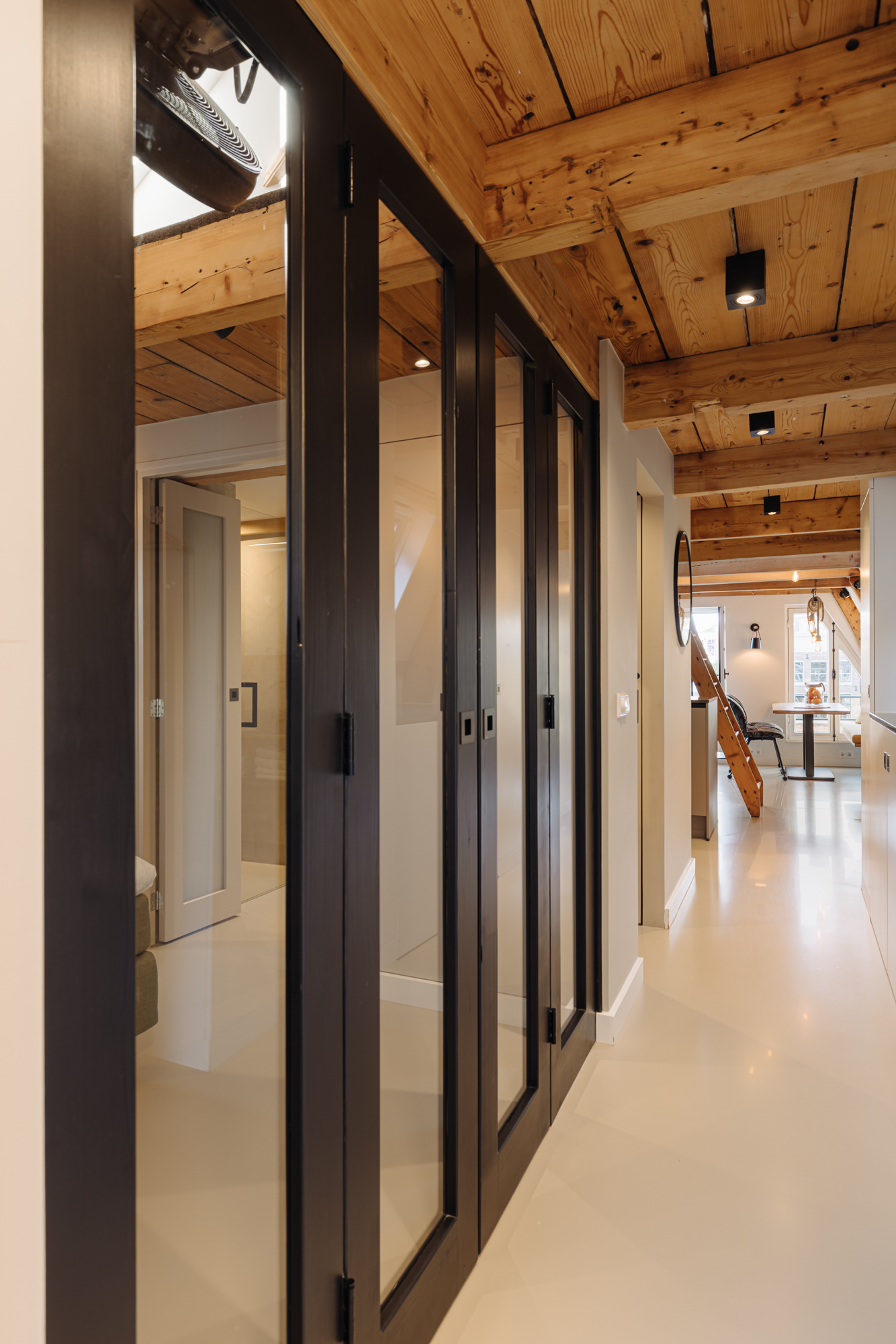 At the front, the bright living and dining area with open kitchen can be found. The luxurious kitchen, newly installed in 2020, is equipped with a composite countertop, Bora cooktop with integrated extractor, boiling-water tap, microwave, oven, and dishwasher. The coffee corner features the same countertop as the kitchen. Large windows at the front and four skylights flood the room with natural light and offer stunning canal views. Characteristic beamed ceilings add a unique and atmospheric touch.