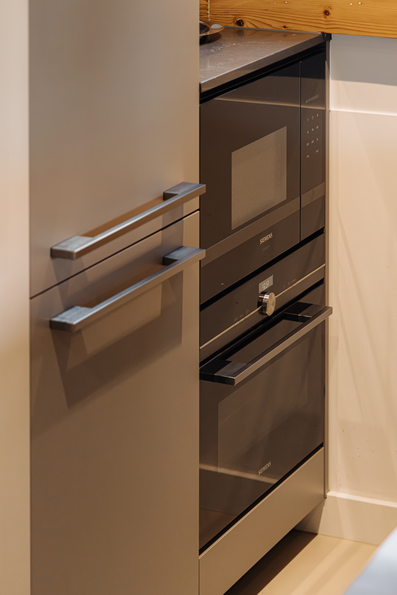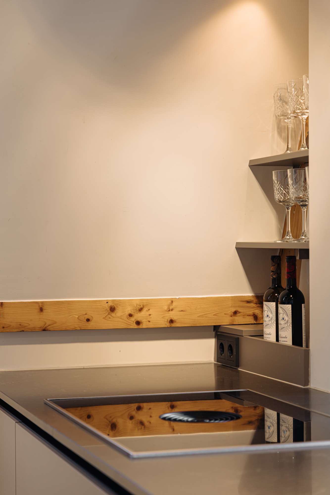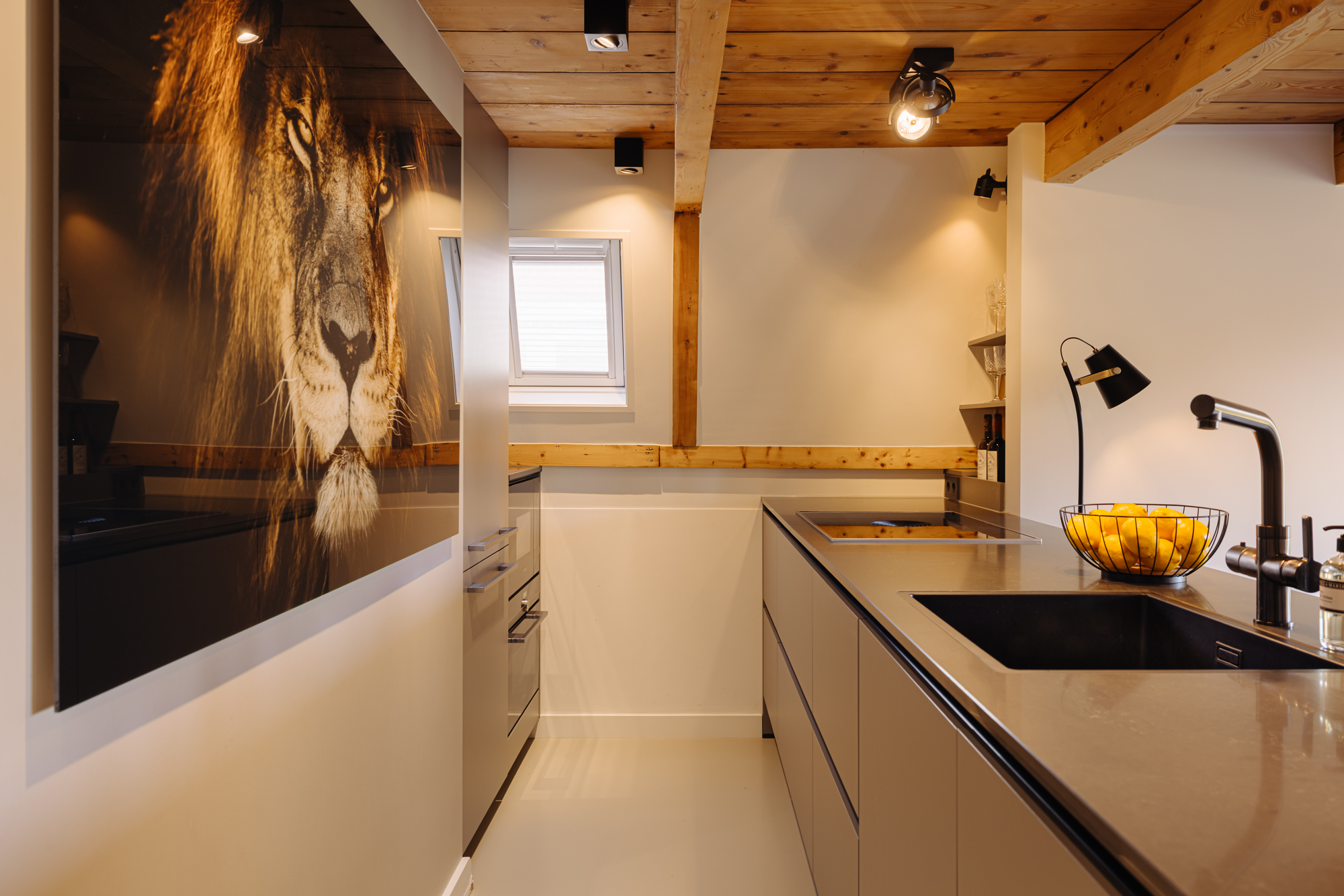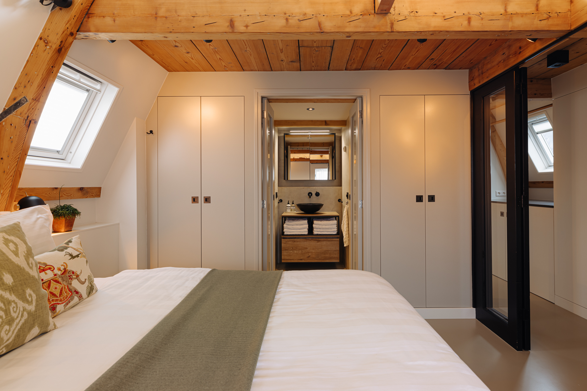 At the front, the bright living and dining area with open kitchen can be found. The luxurious kitchen, newly installed in 2020, is equipped with a composite countertop, Bora cooktop with integrated extractor, boiling-water tap, microwave, oven, and dishwasher. The coffee corner features the same countertop as the kitchen. Large windows at the front and four skylights flood the room with natural light and offer stunning canal views. Characteristic beamed ceilings add a unique and atmospheric touch.