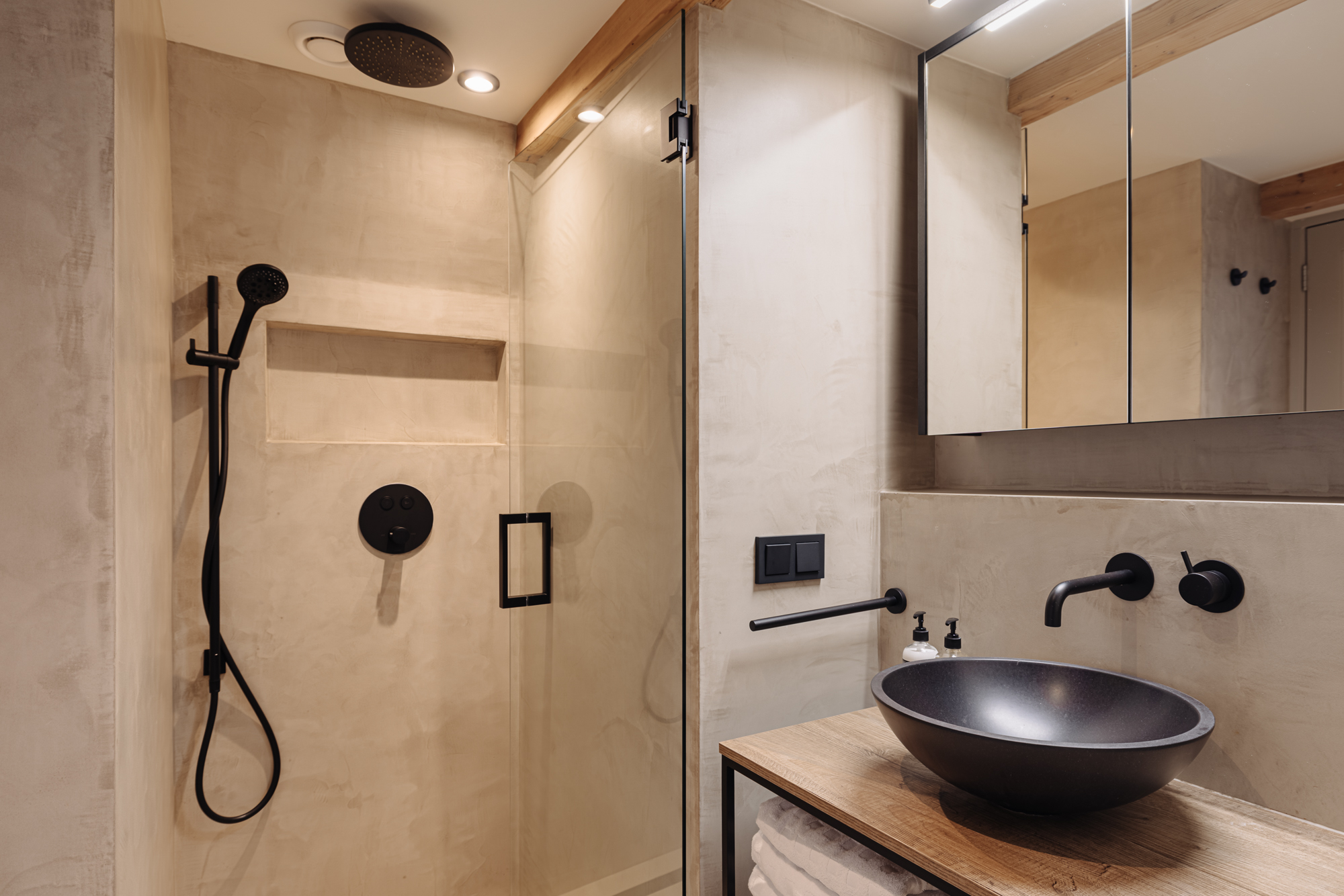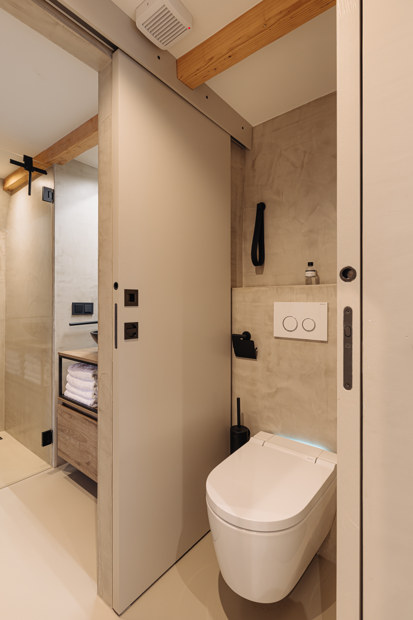 At the rear lies the master bedroom with en-suite bathroom, finished with high-quality materials and fitted with a walk-in shower and washbasin. The Geberit toilet with bidet and lady shower adjoins the bathroom but can be closed off for guests.