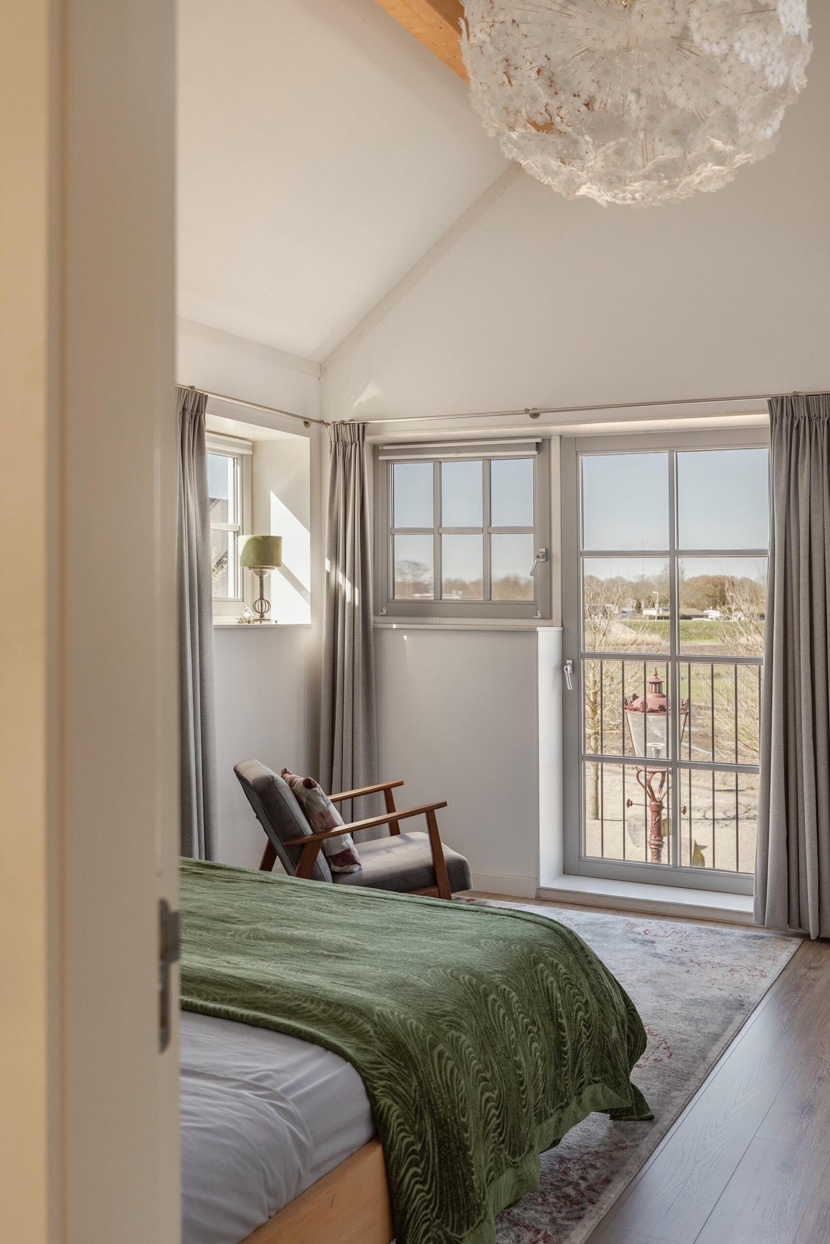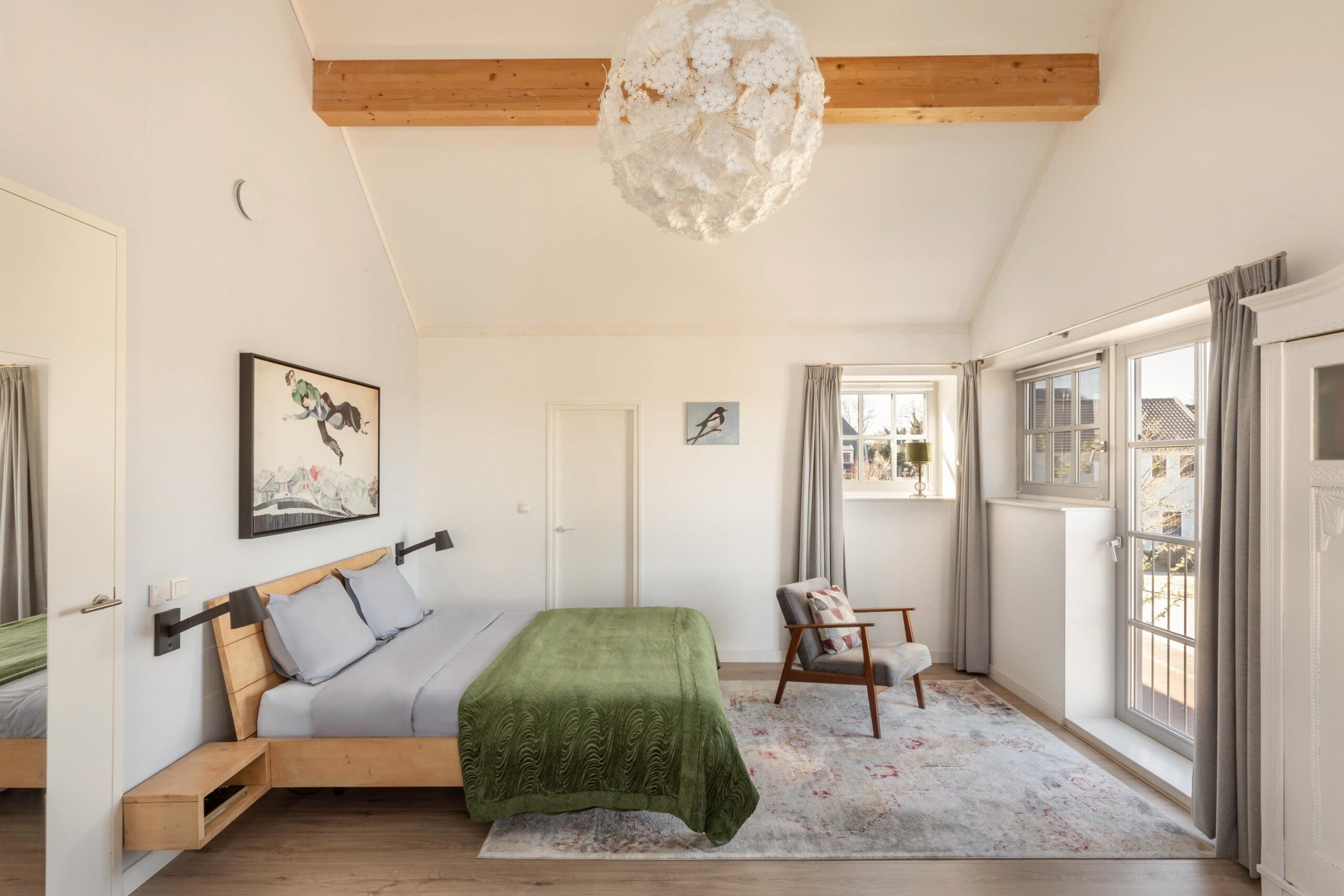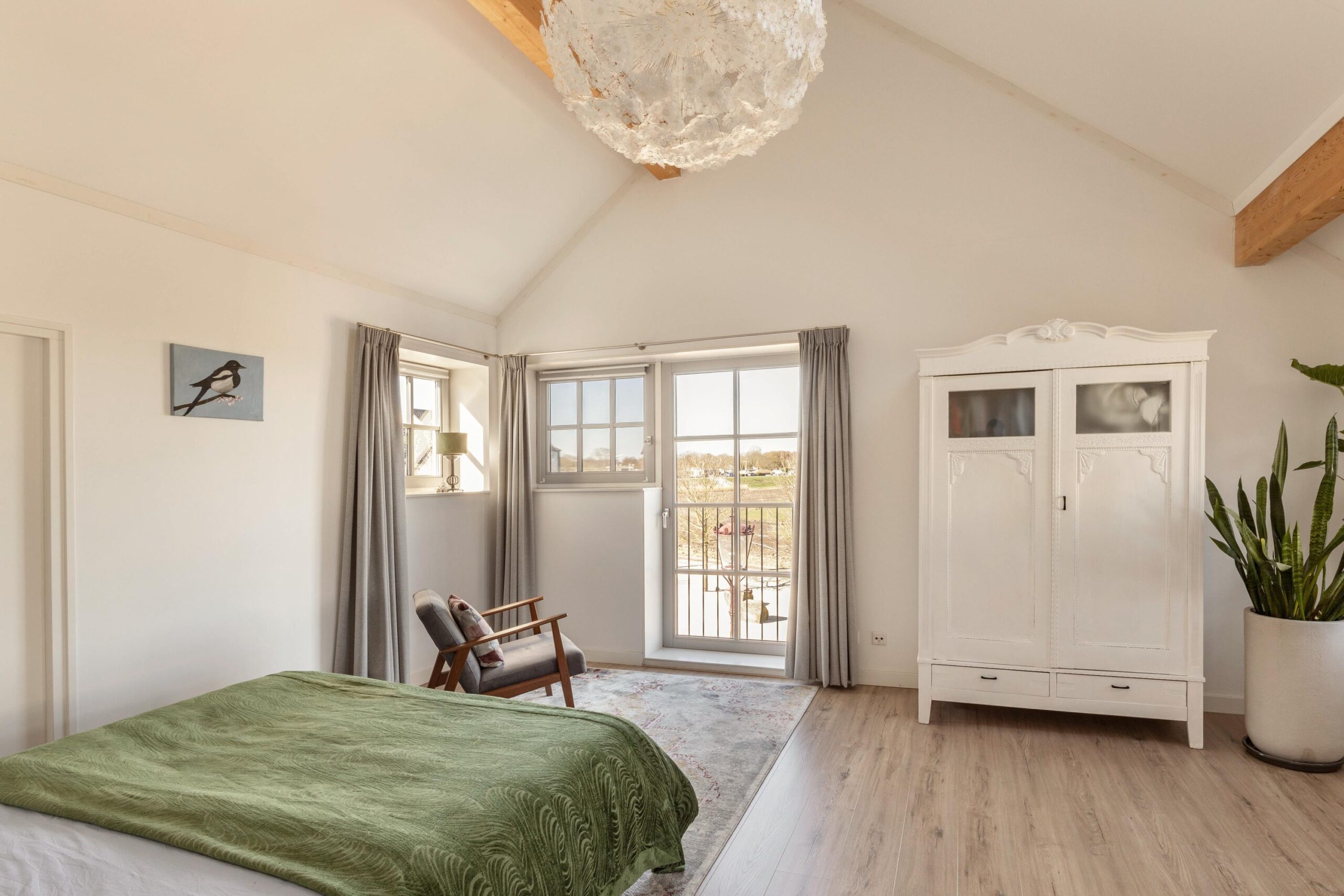 Via the staircase, the spacious landing is reached, providing access to three bedrooms, a separate toilet, and the bathroom. The primary bedroom is located at the front and is characterised by a high pitched roof, exposed beams, and large windows with uninterrupted views over the surrounding polder. The room is of such a size that it can easily be divided, allowing for the creation of an additional bedroom. Adjacent is a generous walk-in wardrobe.
