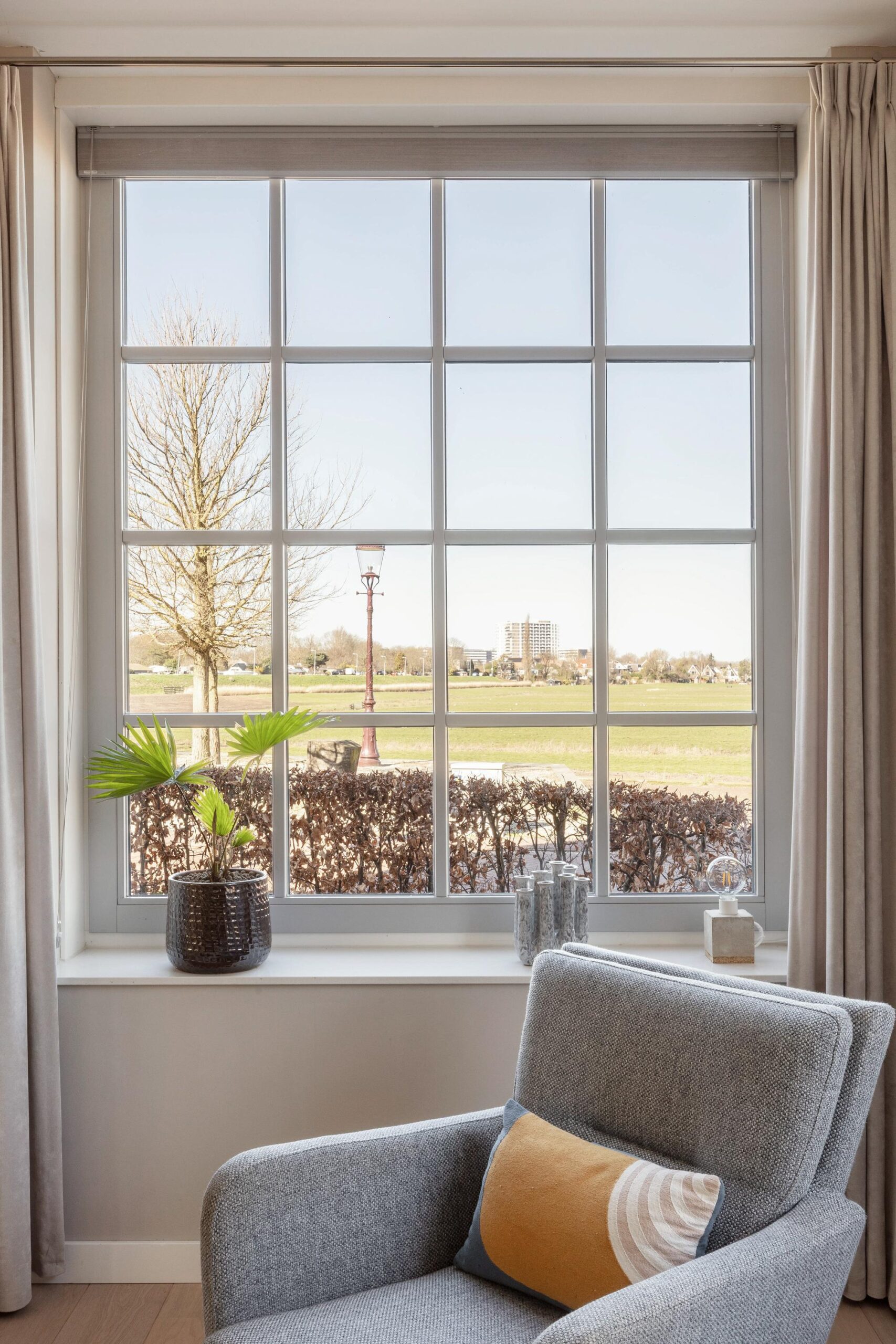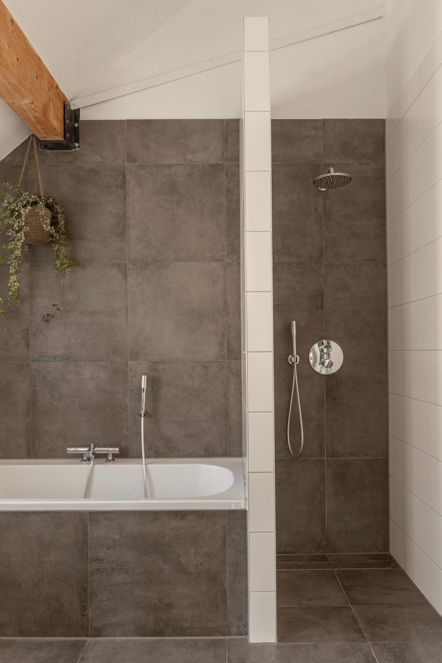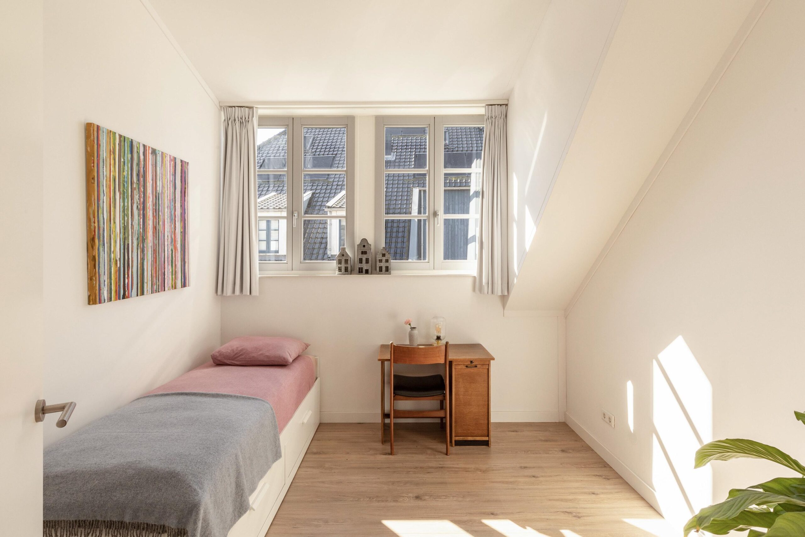 Via the staircase, the spacious landing is reached, providing access to three bedrooms, a separate toilet, and the bathroom. The primary bedroom is located at the front and is characterised by a high pitched roof, exposed beams, and large windows with uninterrupted views over the surrounding polder. The room is of such a size that it can easily be divided, allowing for the creation of an additional bedroom. Adjacent is a generous walk-in wardrobe.
