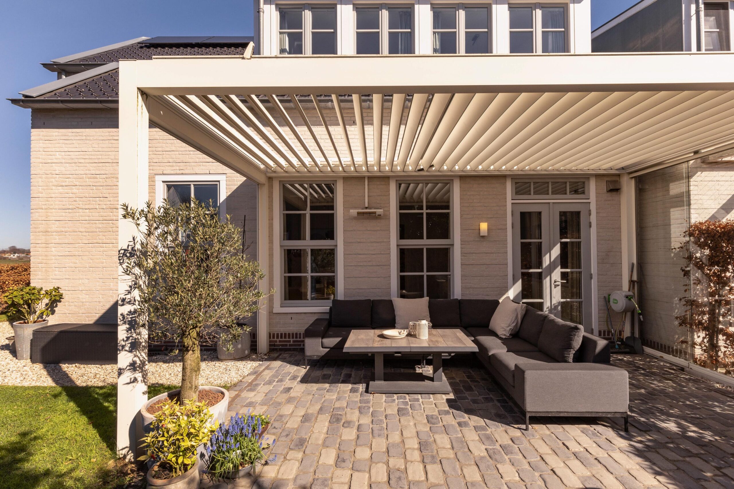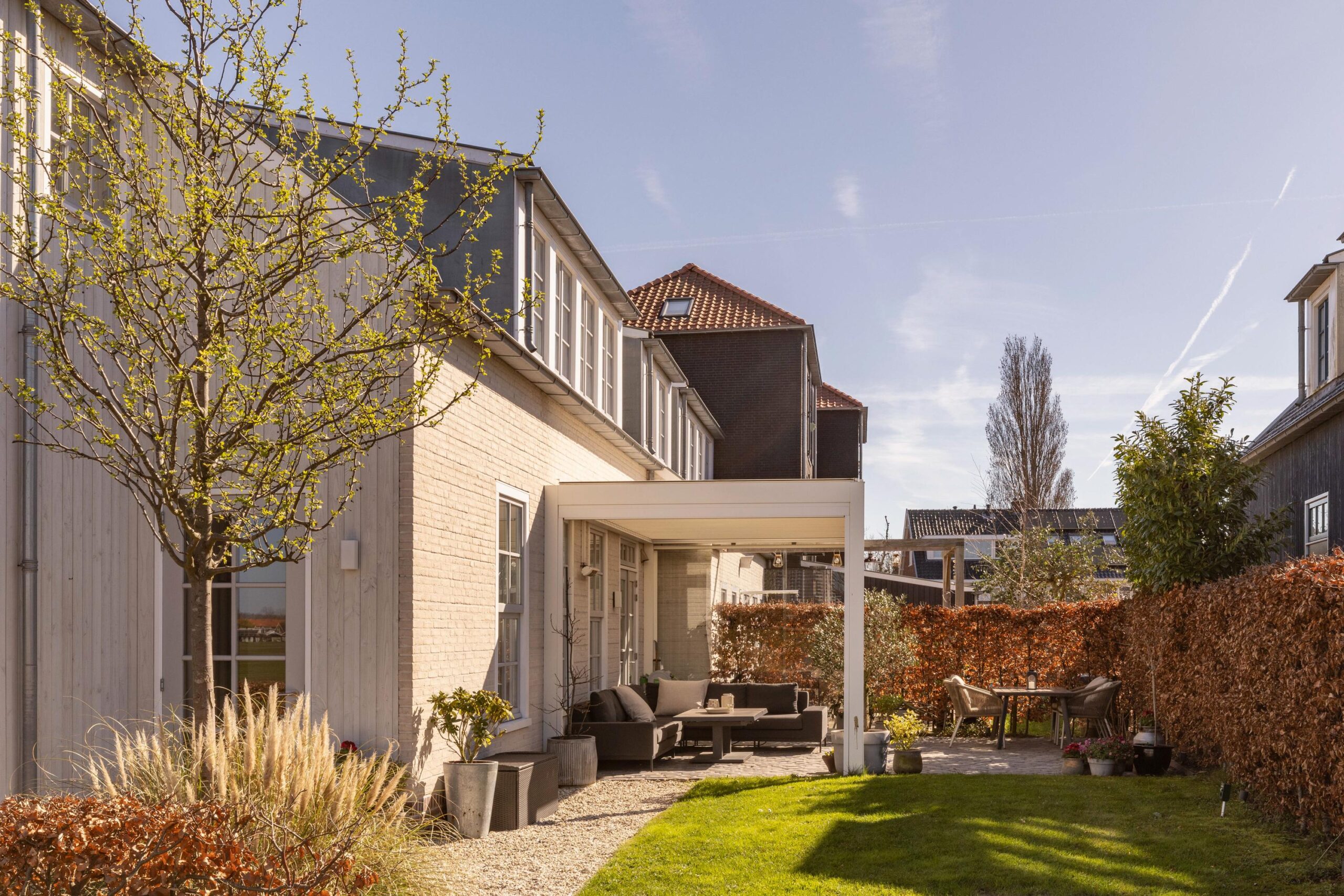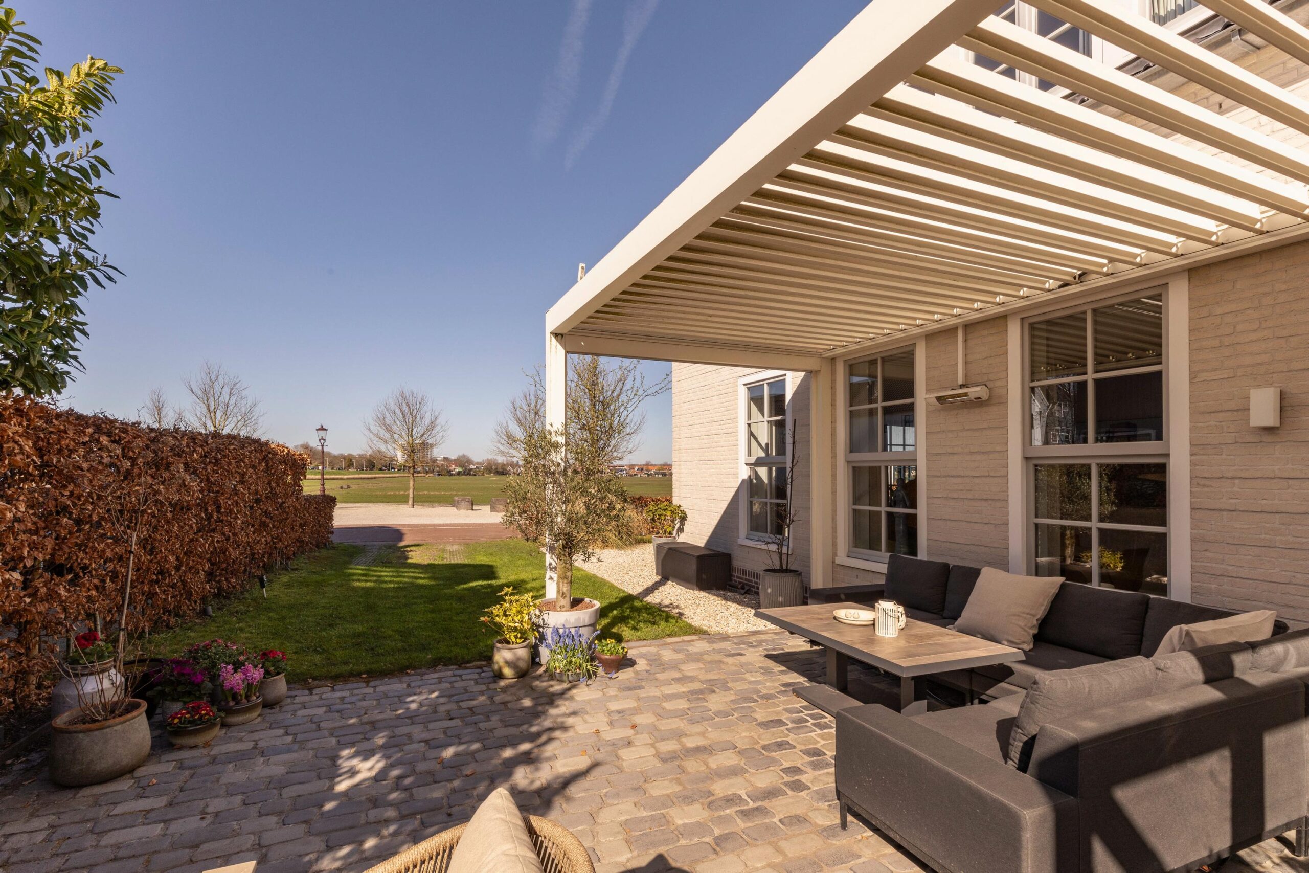 The garden, facing south-west and measuring approximately 118 m², offers unobstructed views over the polder. Thanks to its favourable orientation, you can enjoy the sun here for most of the day and watch it set beautifully behind the meadows in the evening. From spring onwards, the setting becomes lively, with grazing cows in the adjacent field. The garden is also equipped with an electrically operated terrace canopy with weather-controlled louvres, providing additional comfort on sunny days.