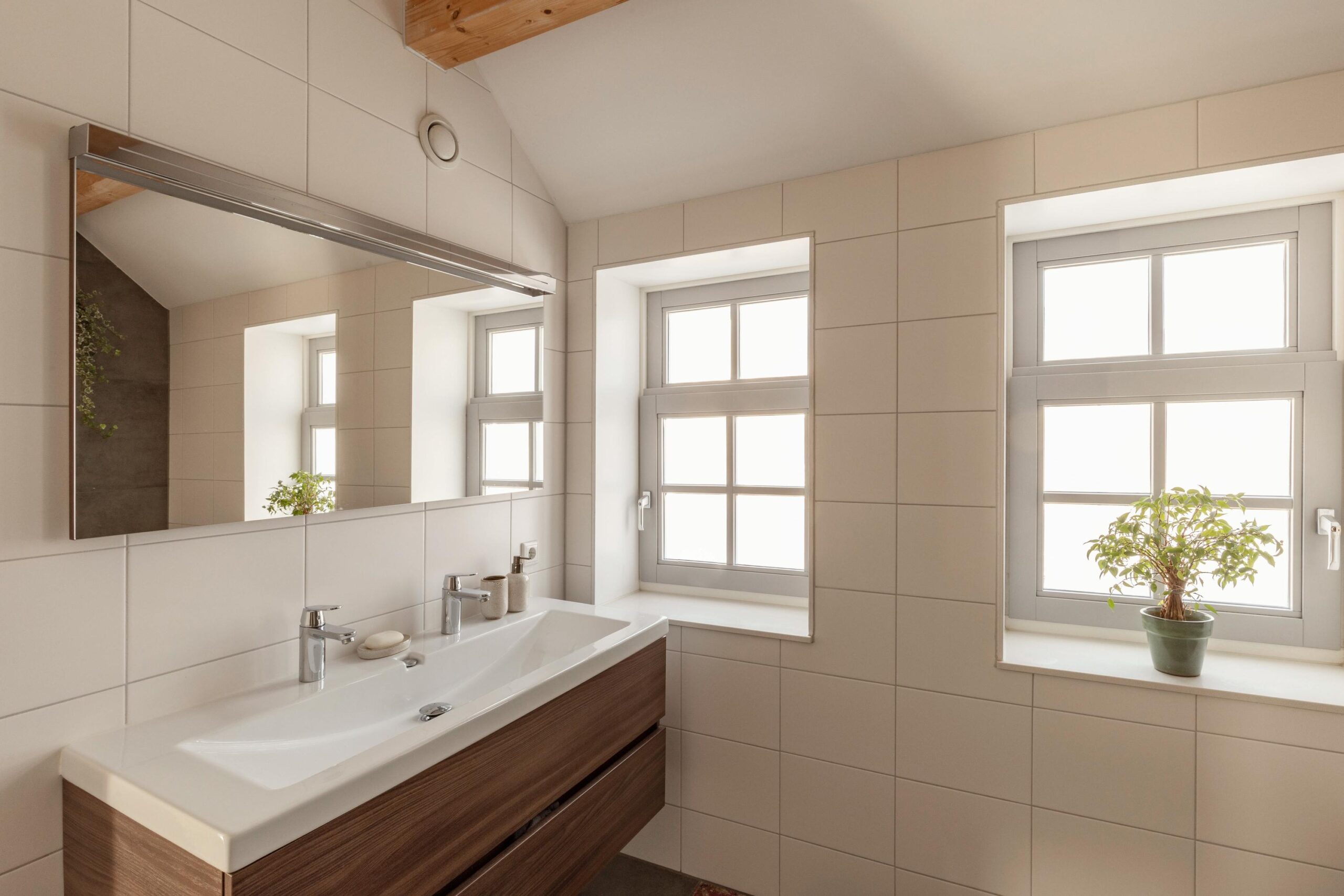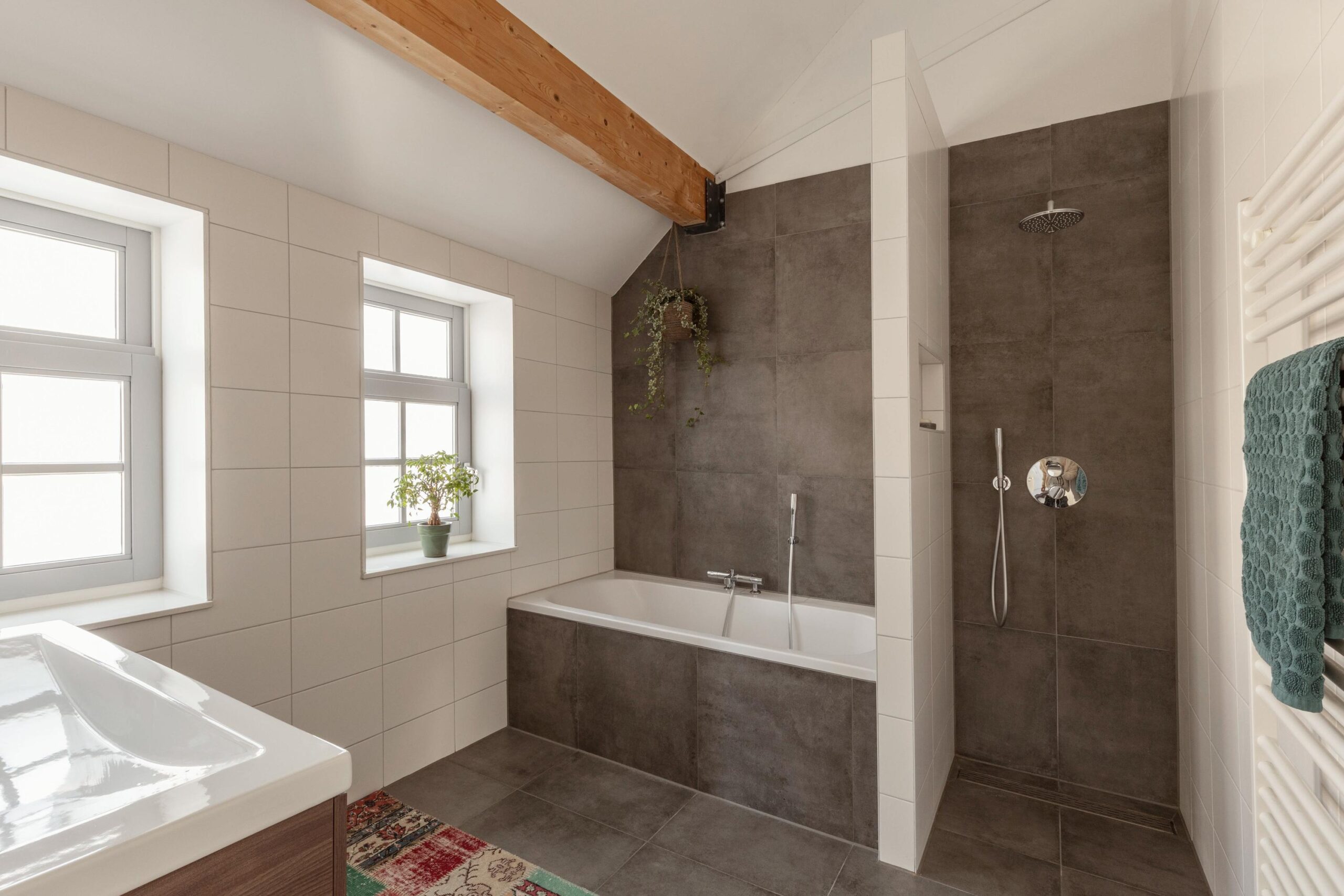 The bathroom is also accessible from the landing and is equipped with a bathtub, walk-in shower, and a double washbasin. From the landing, the loft space can also be accessed via a hatch with a retractable ladder, ideal for additional storage.