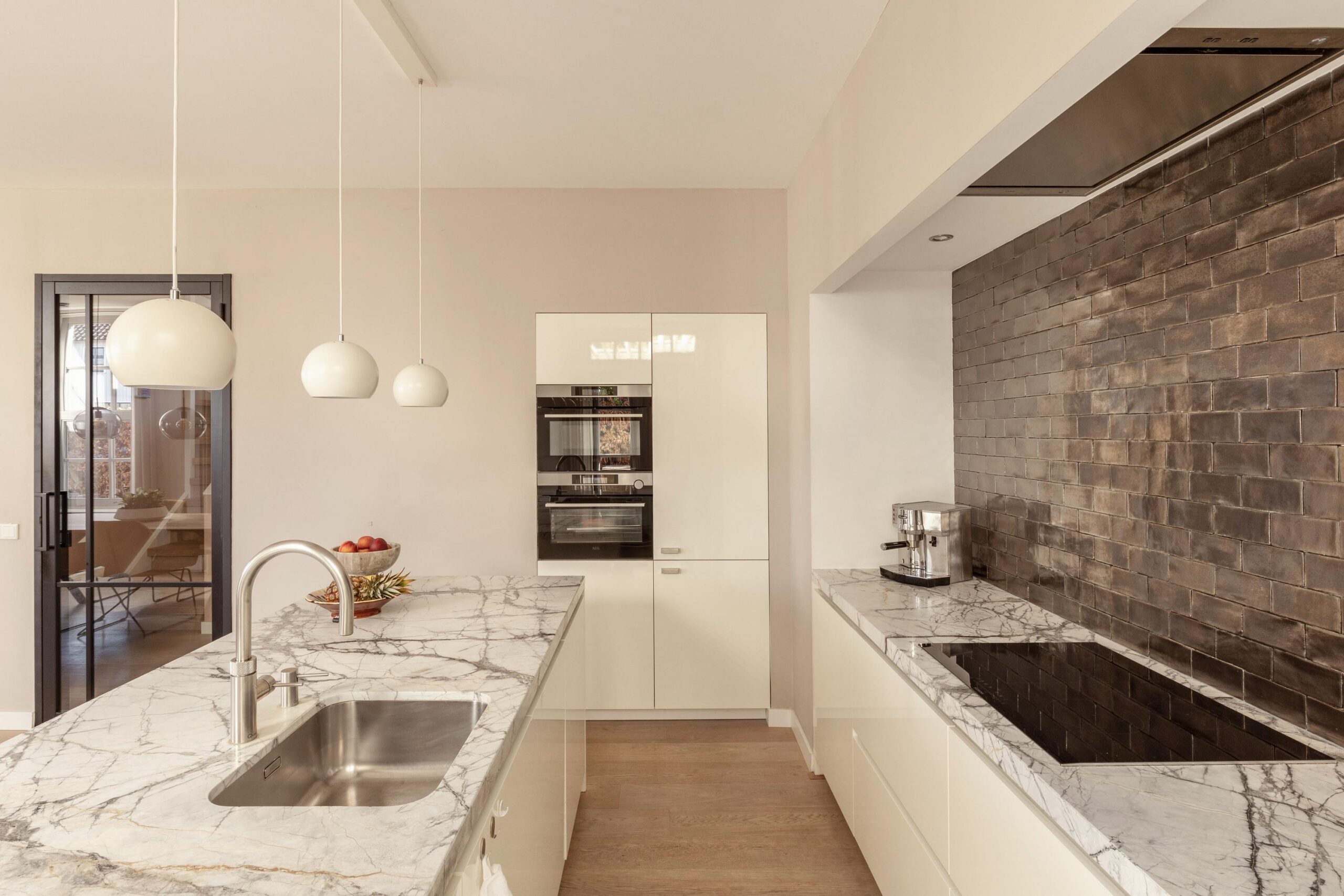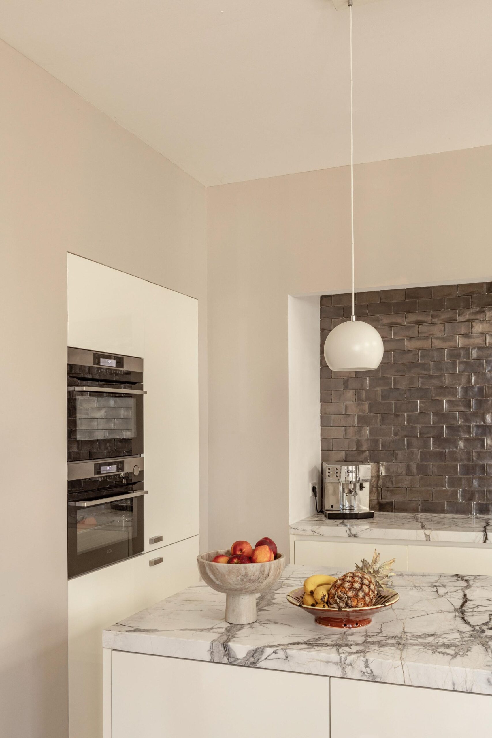 At the rear, the open-plan kitchen with cooking island is located, finished with a marble worktop and a sleek wall of cabinets with integrated high-quality appliances. The dark tiled wall creates a stylish contrast with the light cabinetry. Double doors provide direct access to the garden.