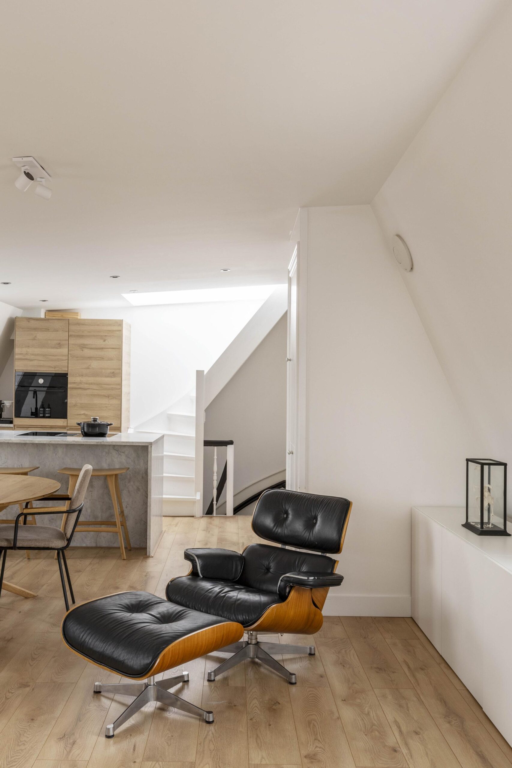 The bright living room with open kitchen is located at the front and benefits from large windows and pleasant natural light. From the living room, a fixed staircase leads to the sunny roof terrace of approximately 12 m², an ideal place to enjoy the outdoors in peace and quiet.