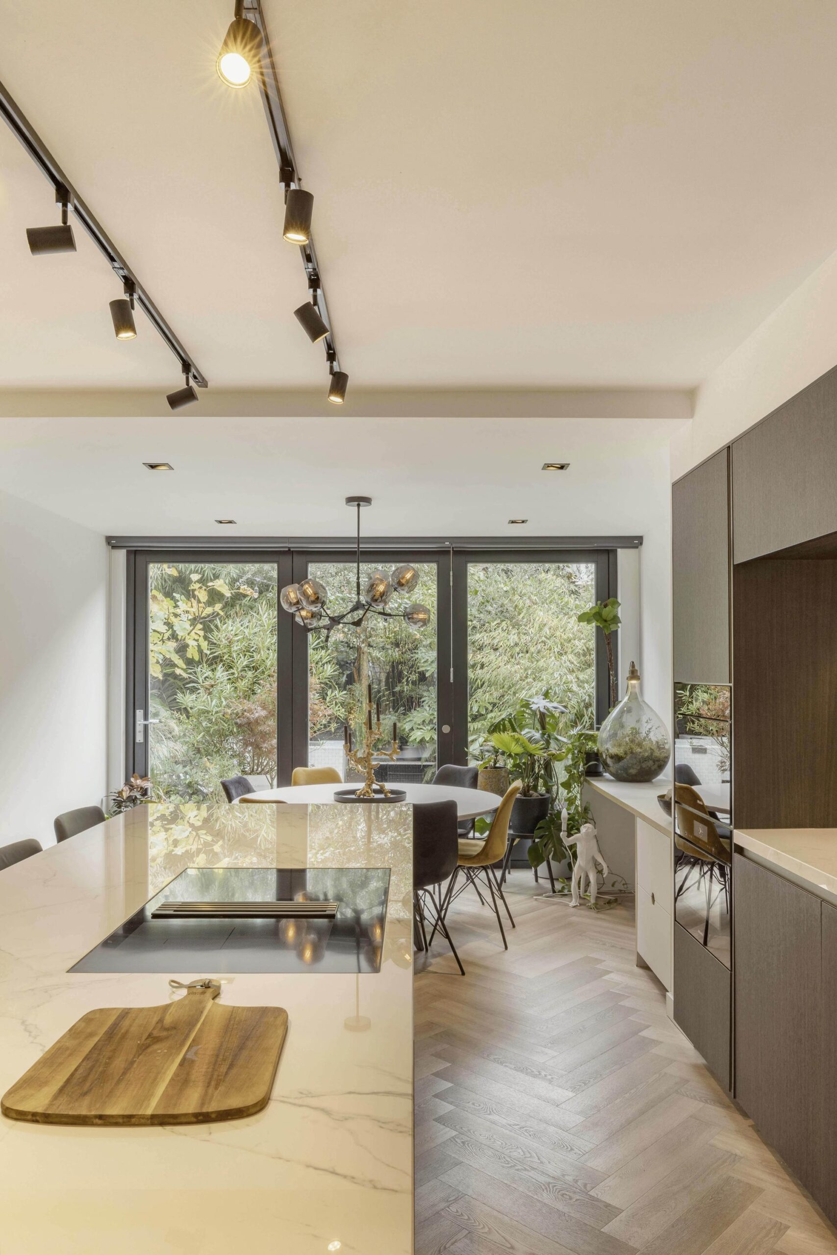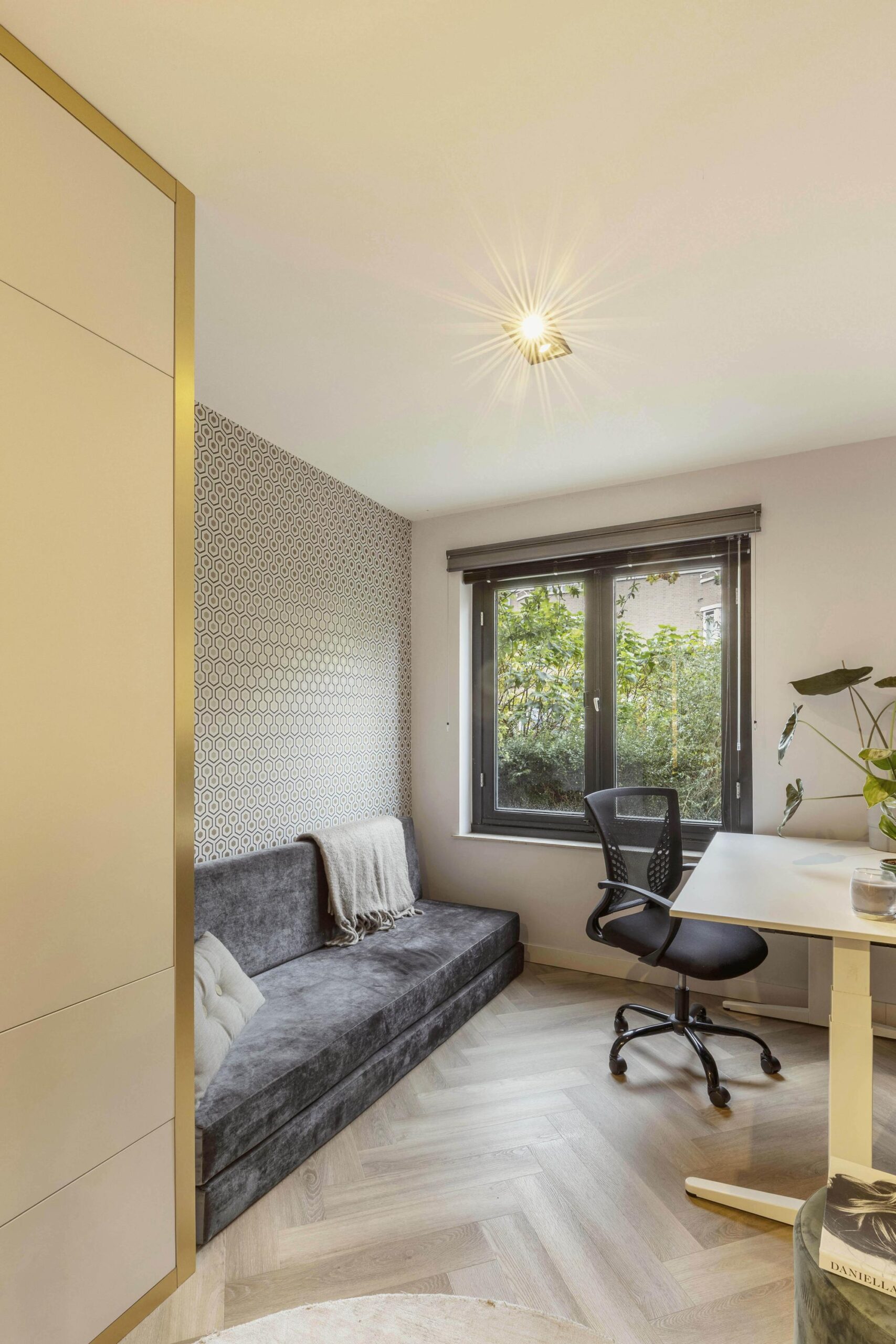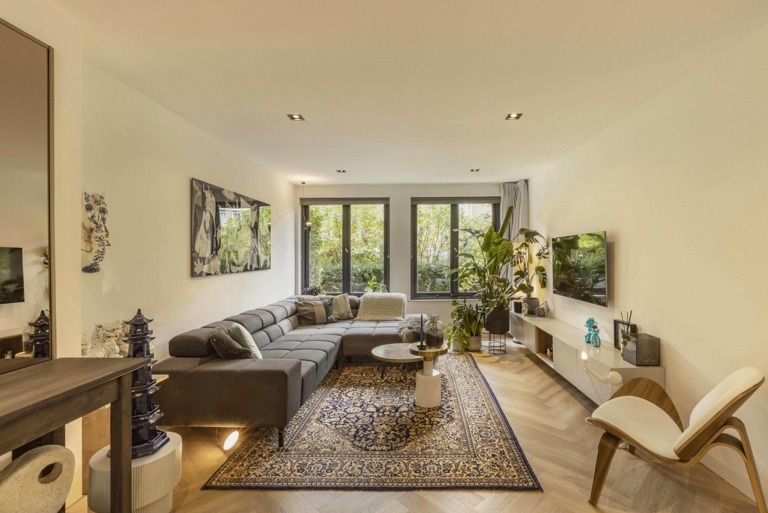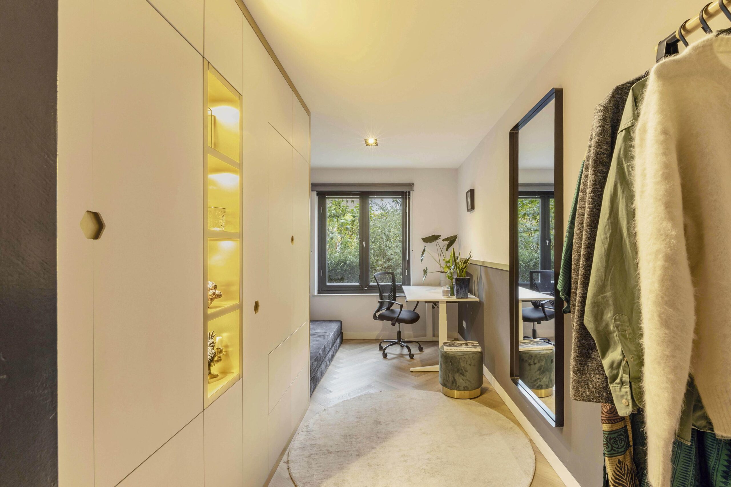 Private entrance at ground level. The hallway, with ample space for a wardrobe, provides access to all rooms. At the front lies the bright living room with open-plan kitchen, finished with high-grade materials and modern built-in appliances such as a steam oven, combi microwave and Quooker. A fully foldable harmonica-style door creates a direct connection to the beautifully landscaped garden, fitted with an automatic irrigation system.