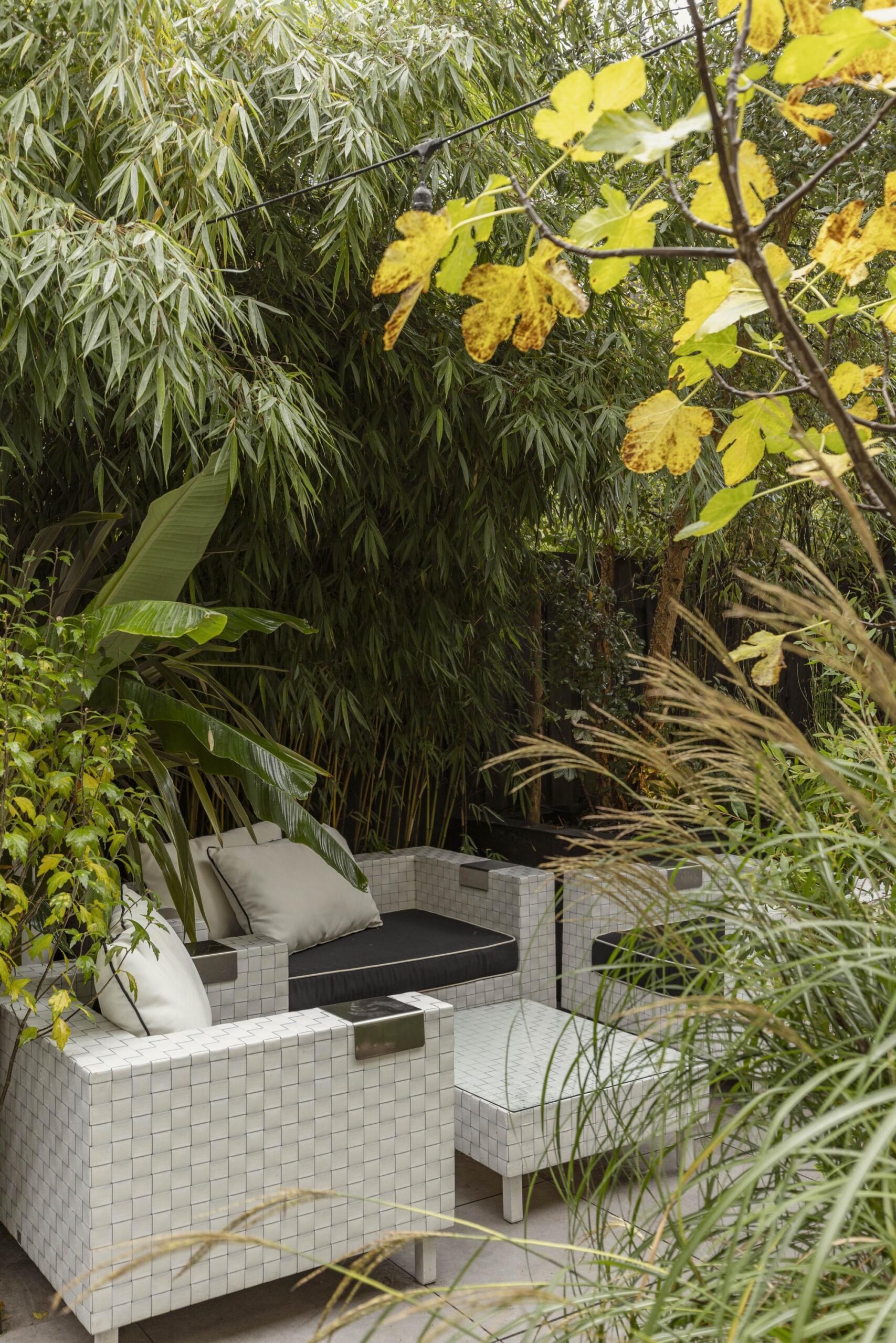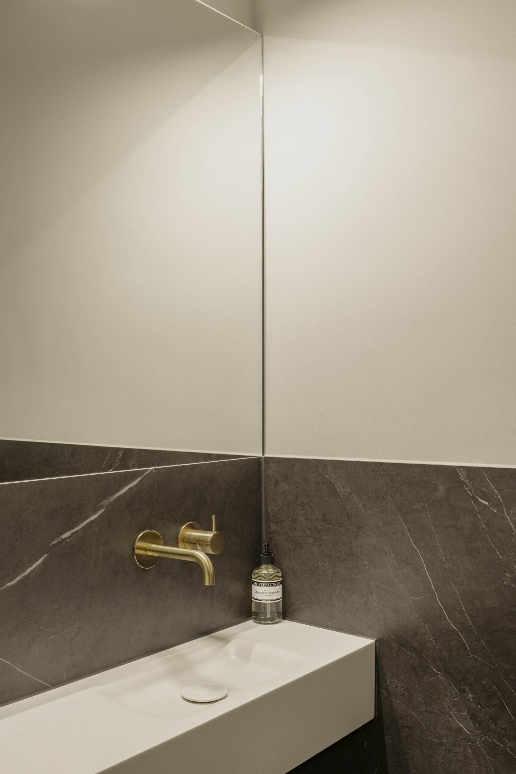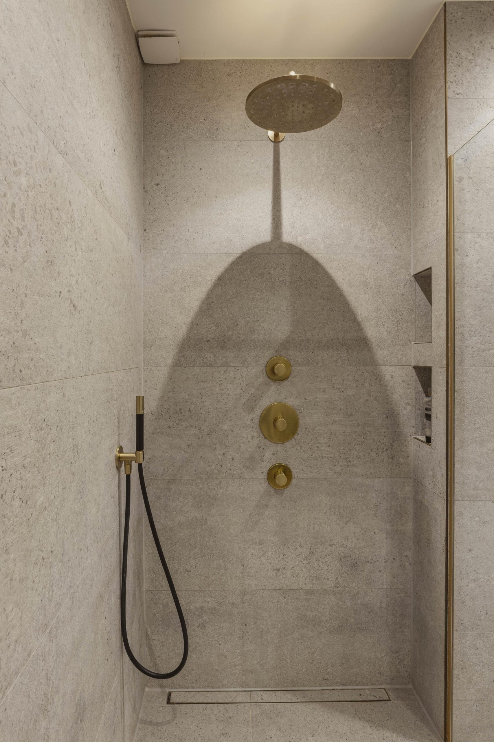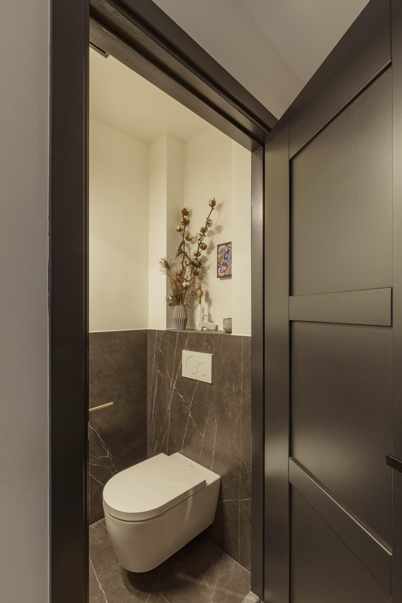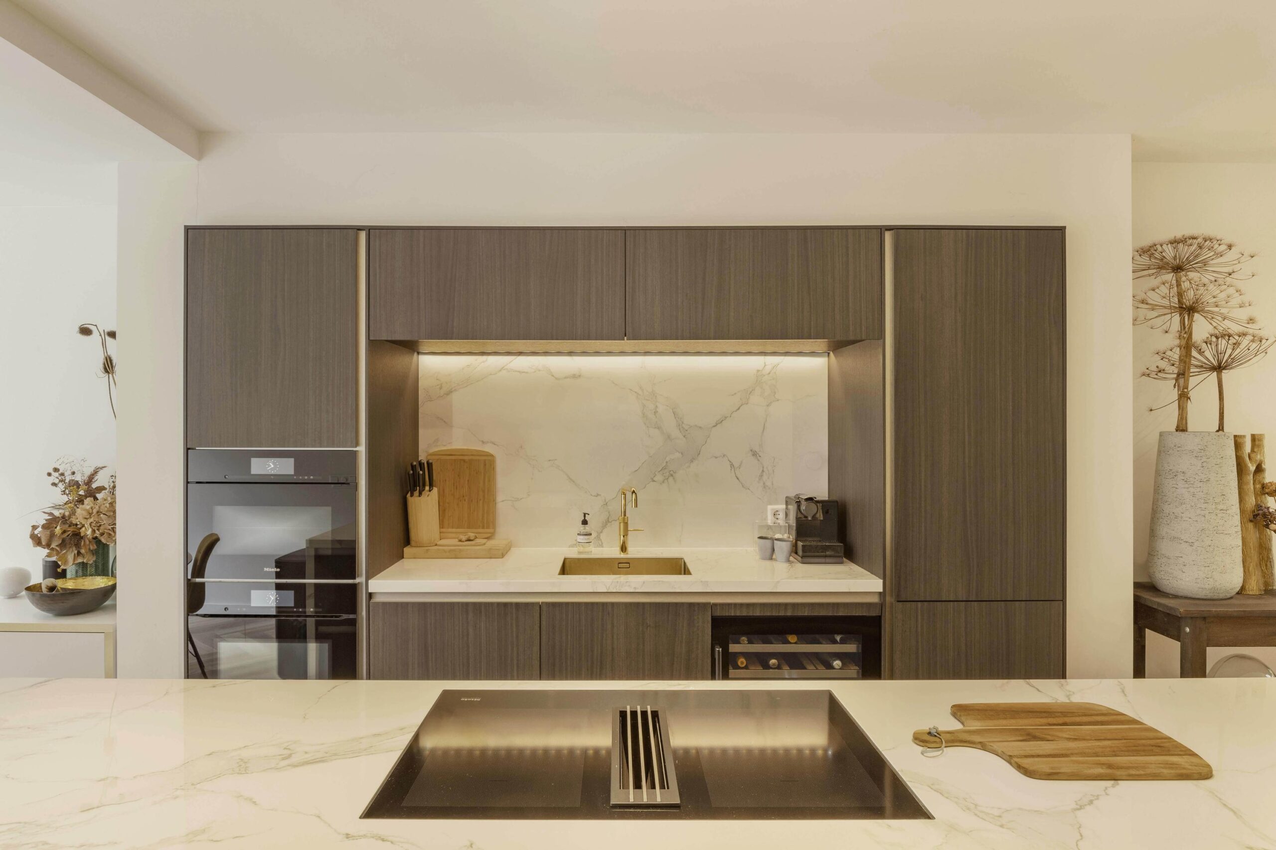 Private entrance at ground level. The hallway, with ample space for a wardrobe, provides access to all rooms. At the front lies the bright living room with open-plan kitchen, finished with high-grade materials and modern built-in appliances such as a steam oven, combi microwave and Quooker. A fully foldable harmonica-style door creates a direct connection to the beautifully landscaped garden, fitted with an automatic irrigation system.