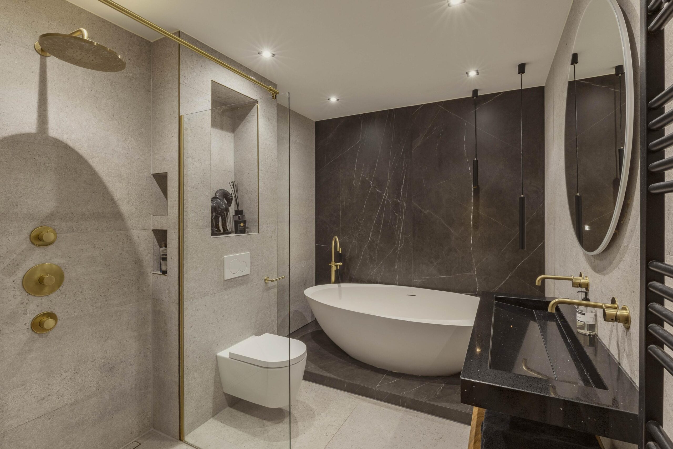 At the rear is the well-proportioned main bedroom, with double French doors opening onto the garden. The second bedroom is situated at the front of the property; both rooms are light and efficiently arranged. The modern bathroom is fitted with a walk-in shower, double washbasin, bathtub and toilet. In addition, a second, separate toilet is located in the hallway.