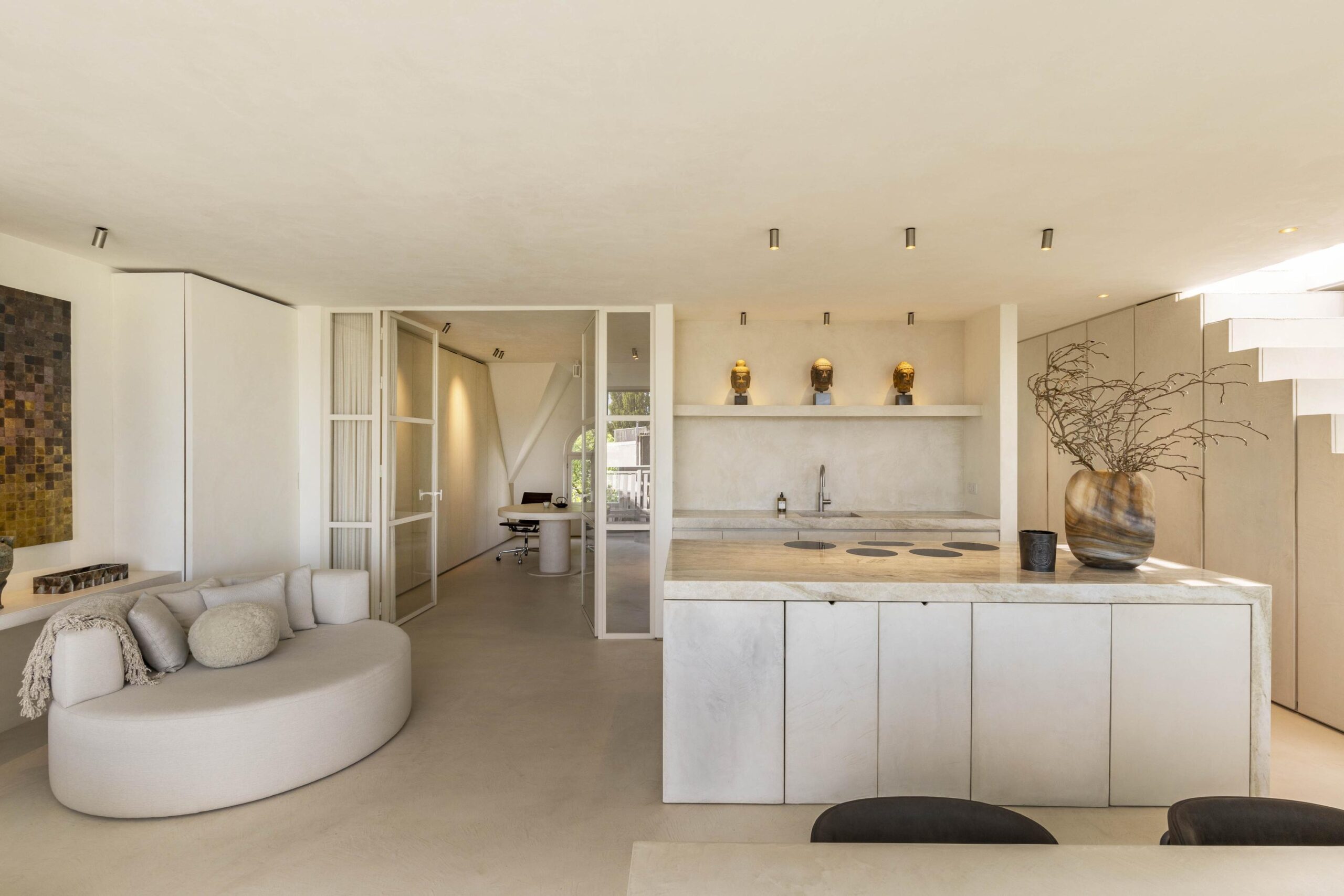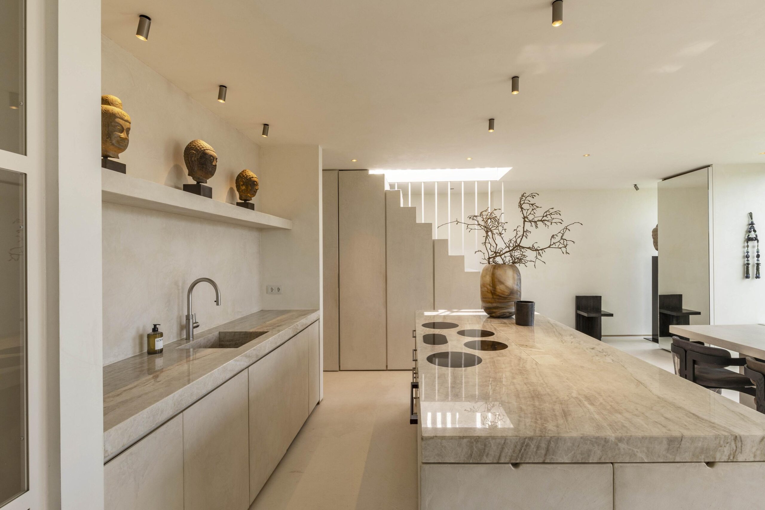 The apartment is located on the fourth floor of a stylish building built in 1909. Through the entrance there is access to the spacious living room with open kitchen, where design, comfort and functionality come together perfectly. The modern kitchen is equipped with luxury appliances and finished to a high standard. The stairs to the roof terrace are cleverly integrated with extra storage space and additional kitchen functions, making the best use of the space. The living room adjoins the sunny balcony and features a built-in projector with projection screen, a thoughtful solution that contributes to the efficient and flexible use of the living space.