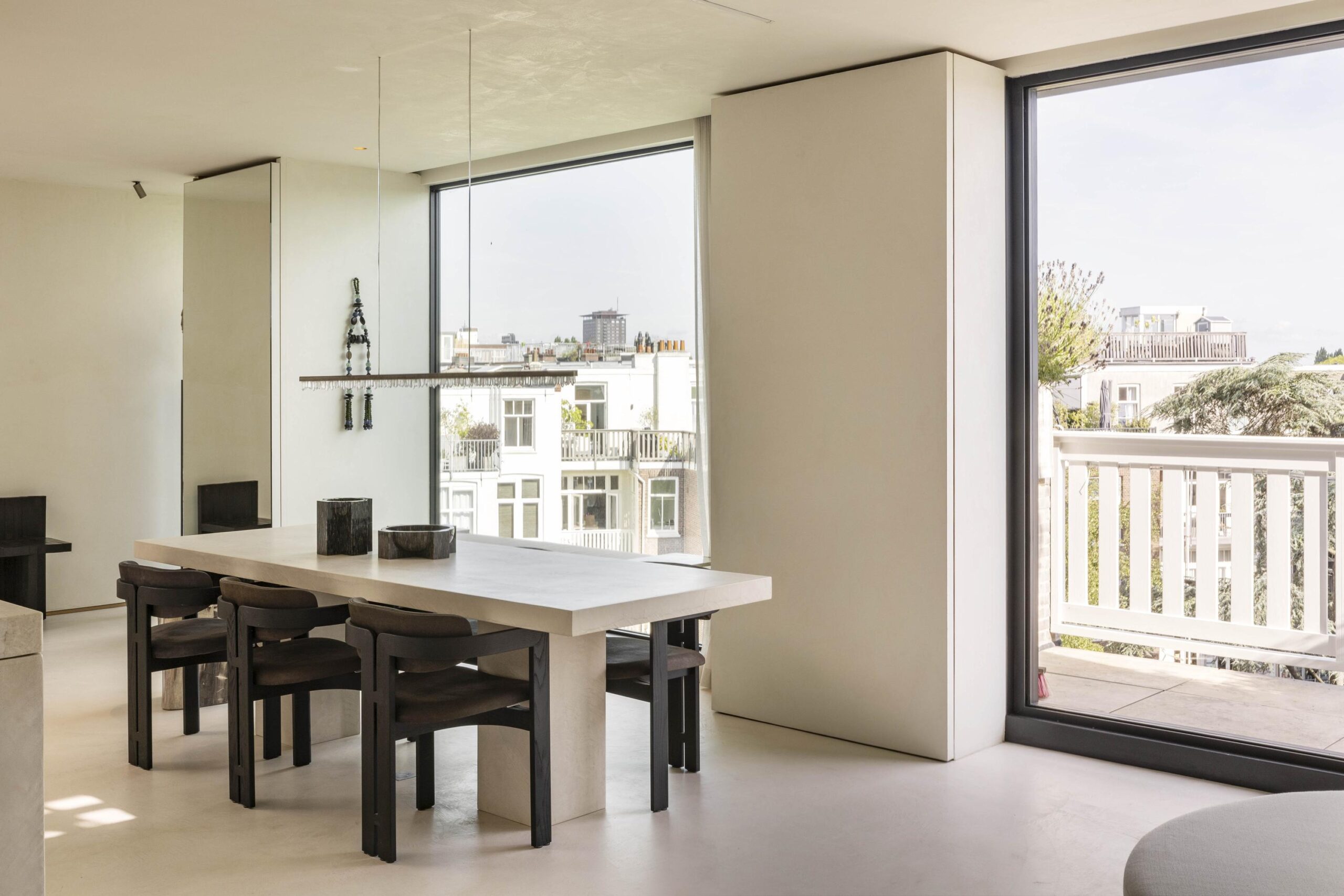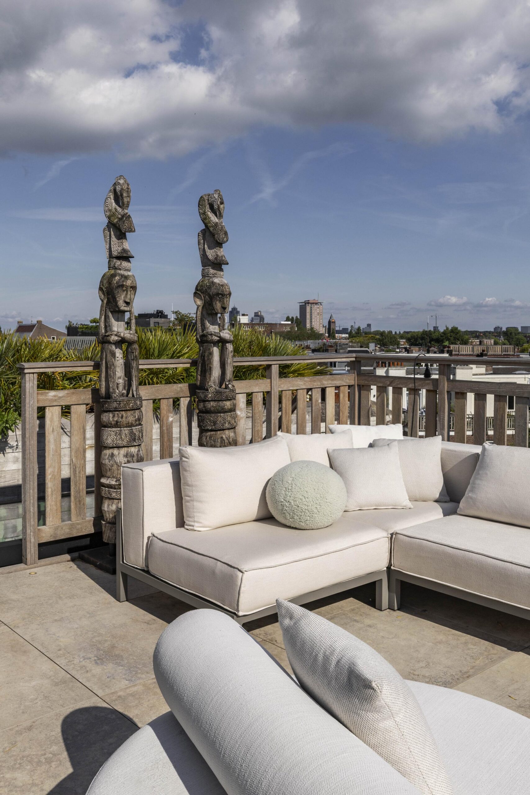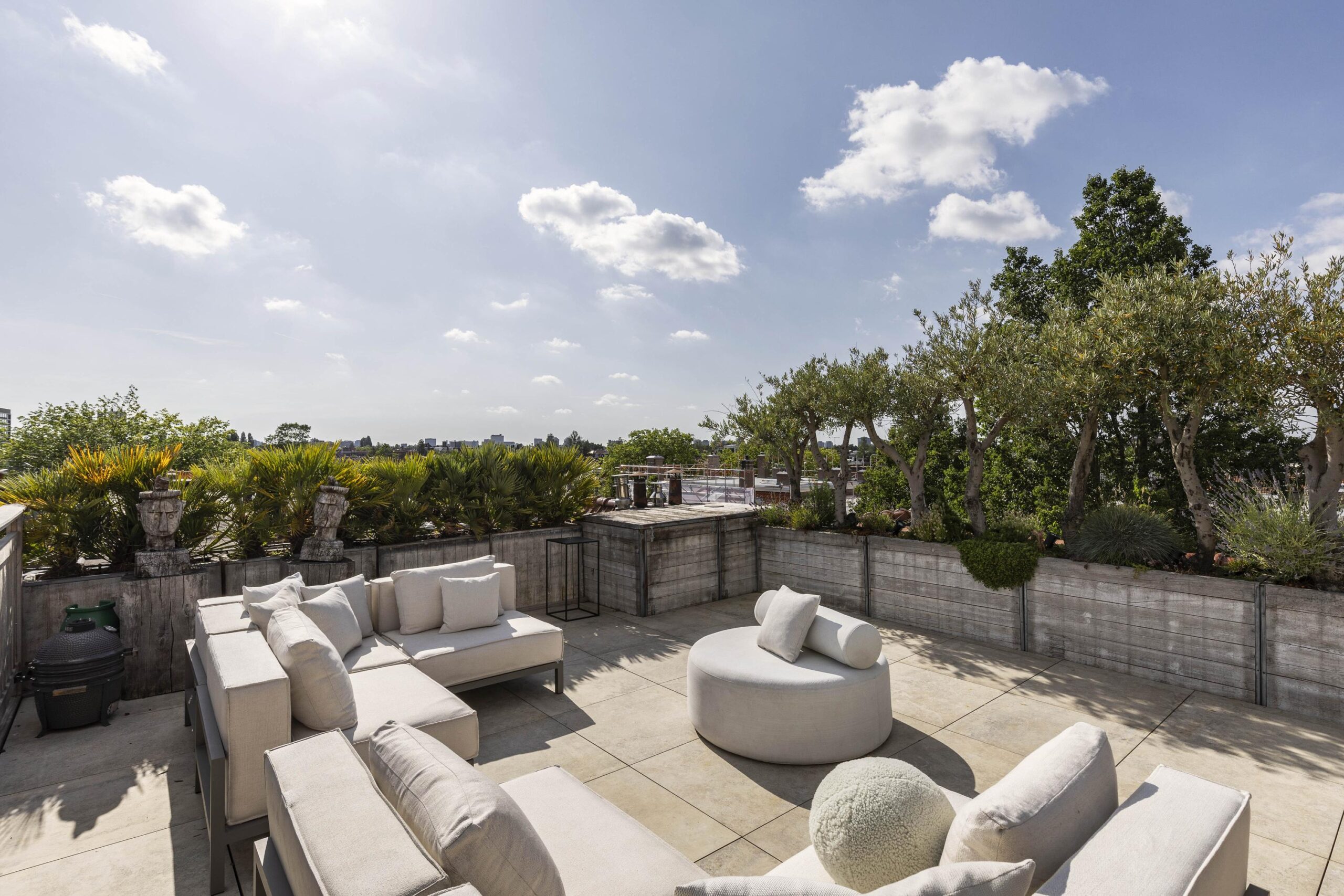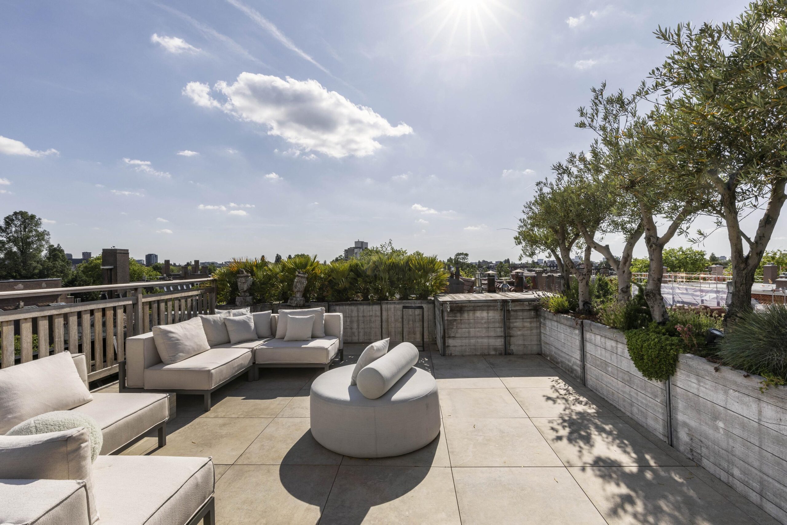 A fixed staircase leads to the exclusive roof terrace: a generous and sheltered outdoor area with space for lounge and dining, and a unique view over the rooftops of Amsterdam.
