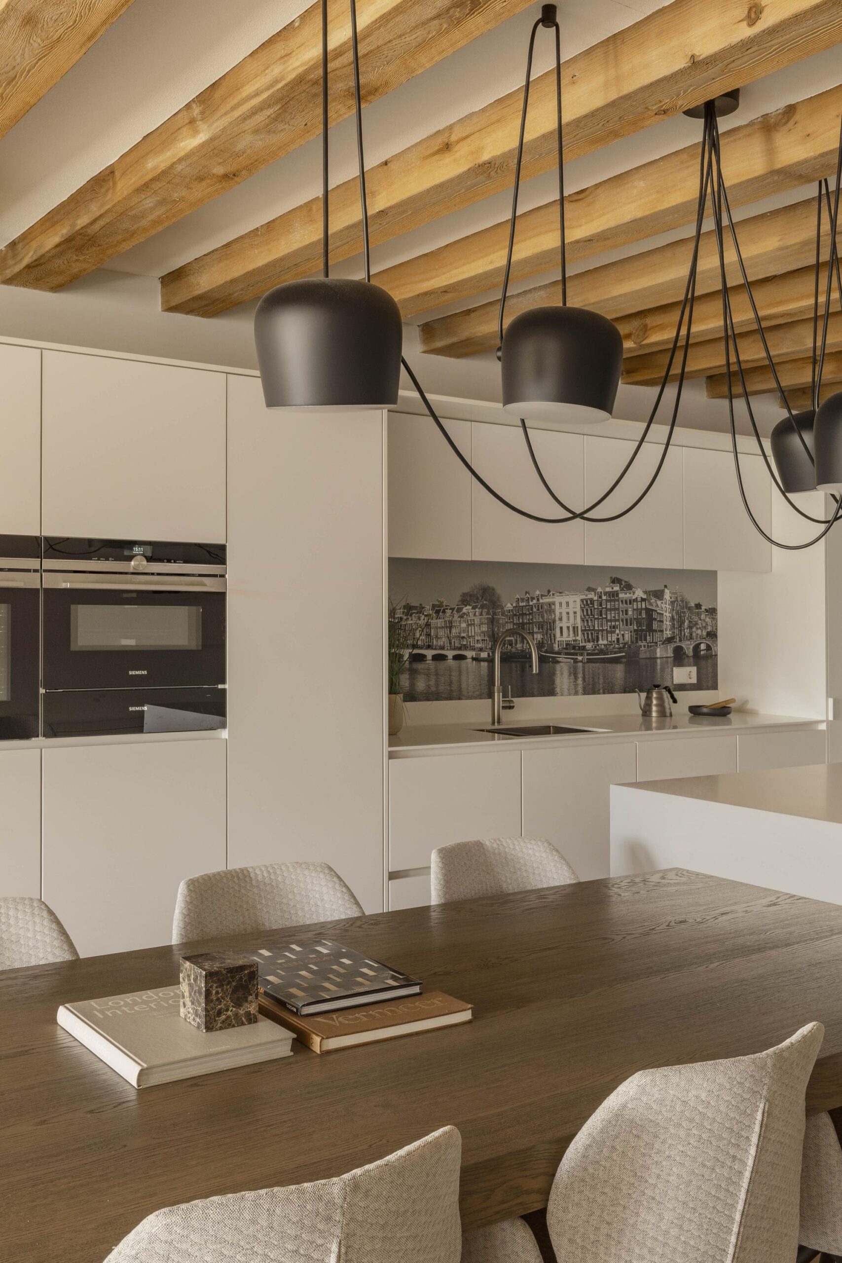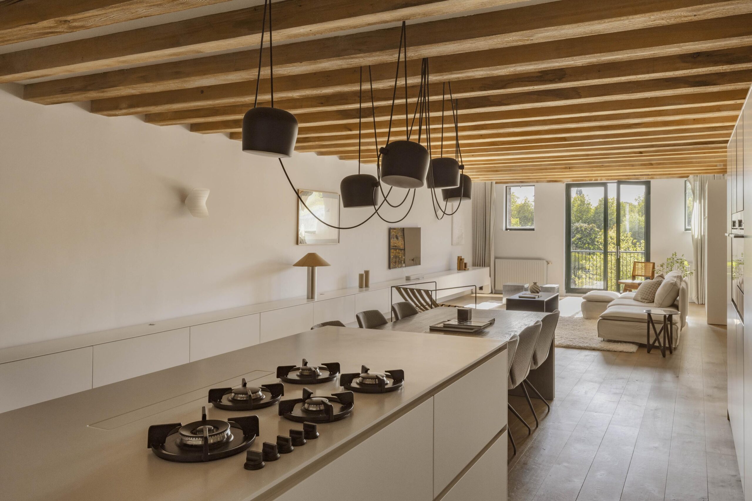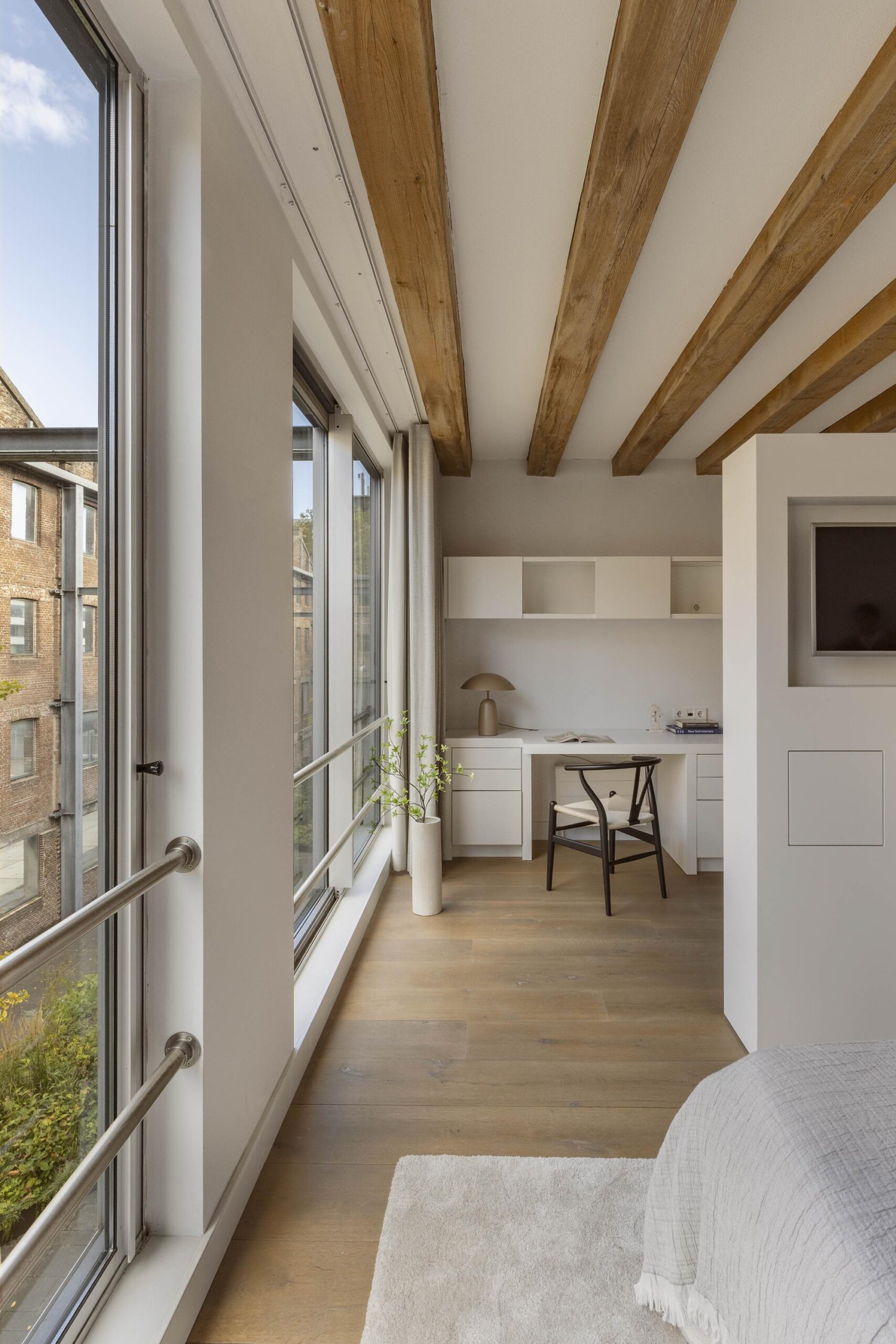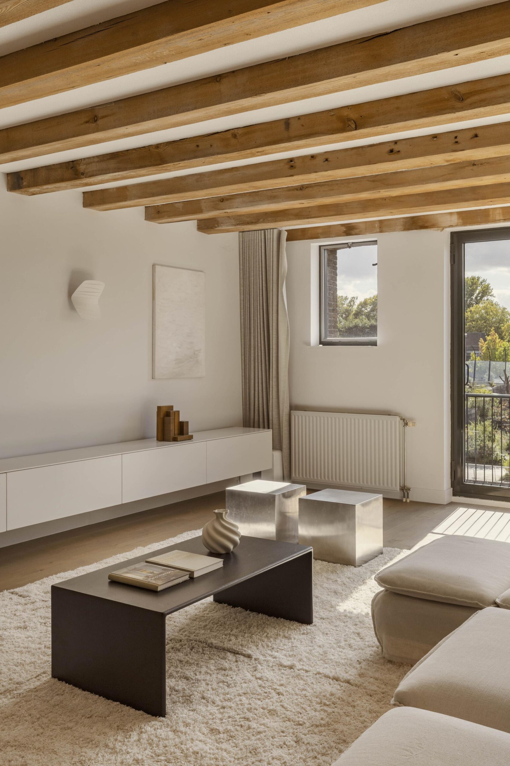 The oak flooring and exposed wooden beams bring warmth and character, without compromising the apartment’s sense of space and height.