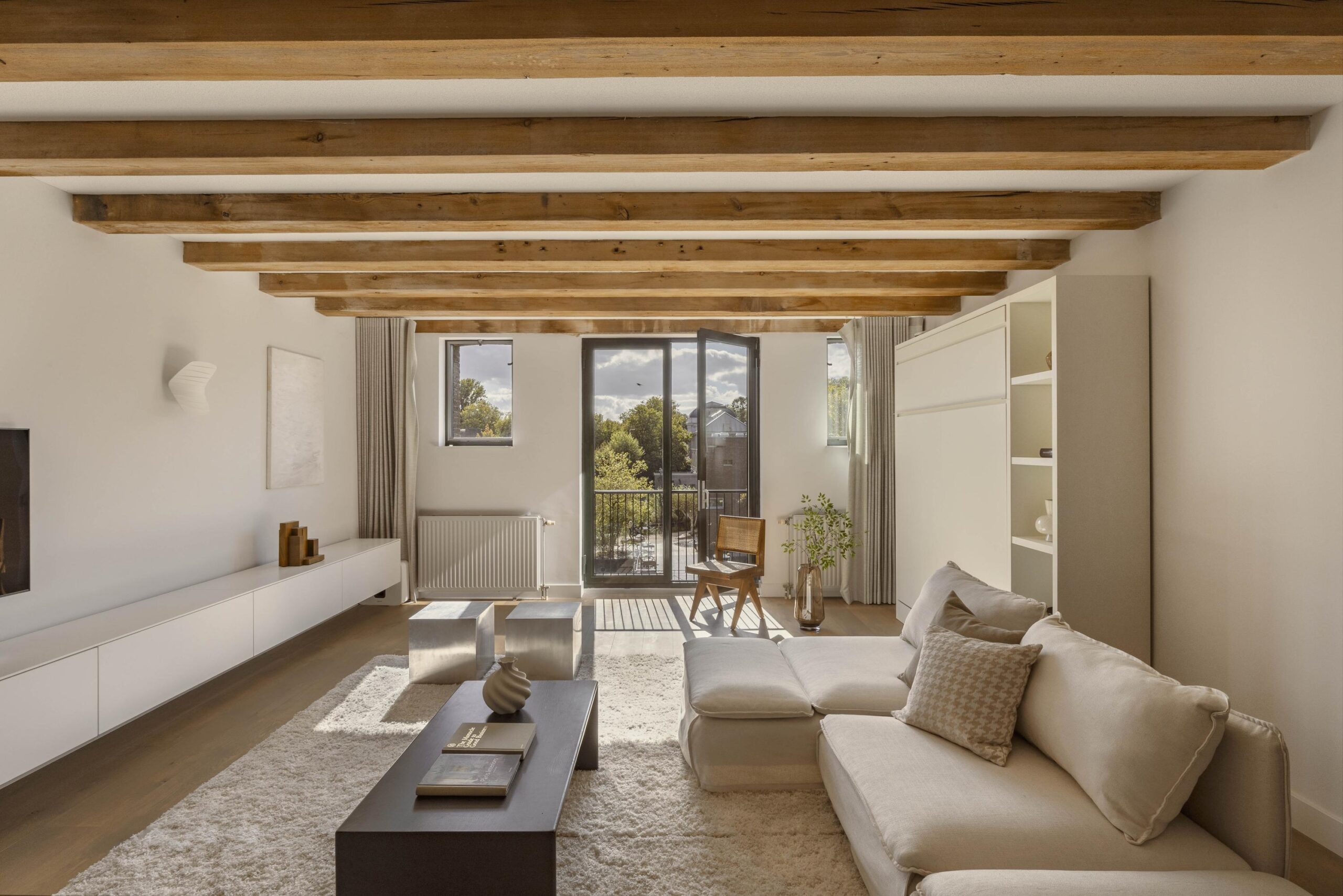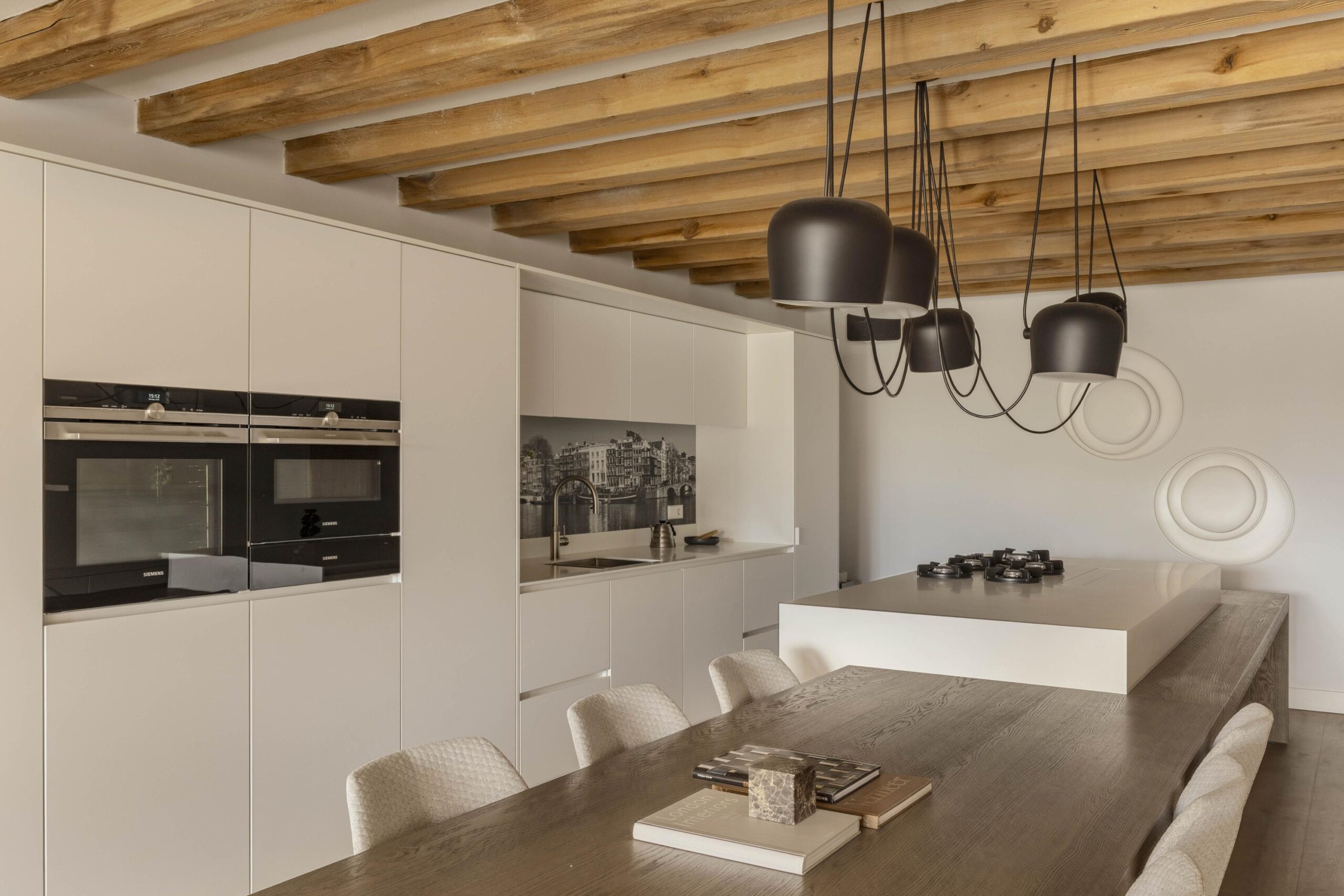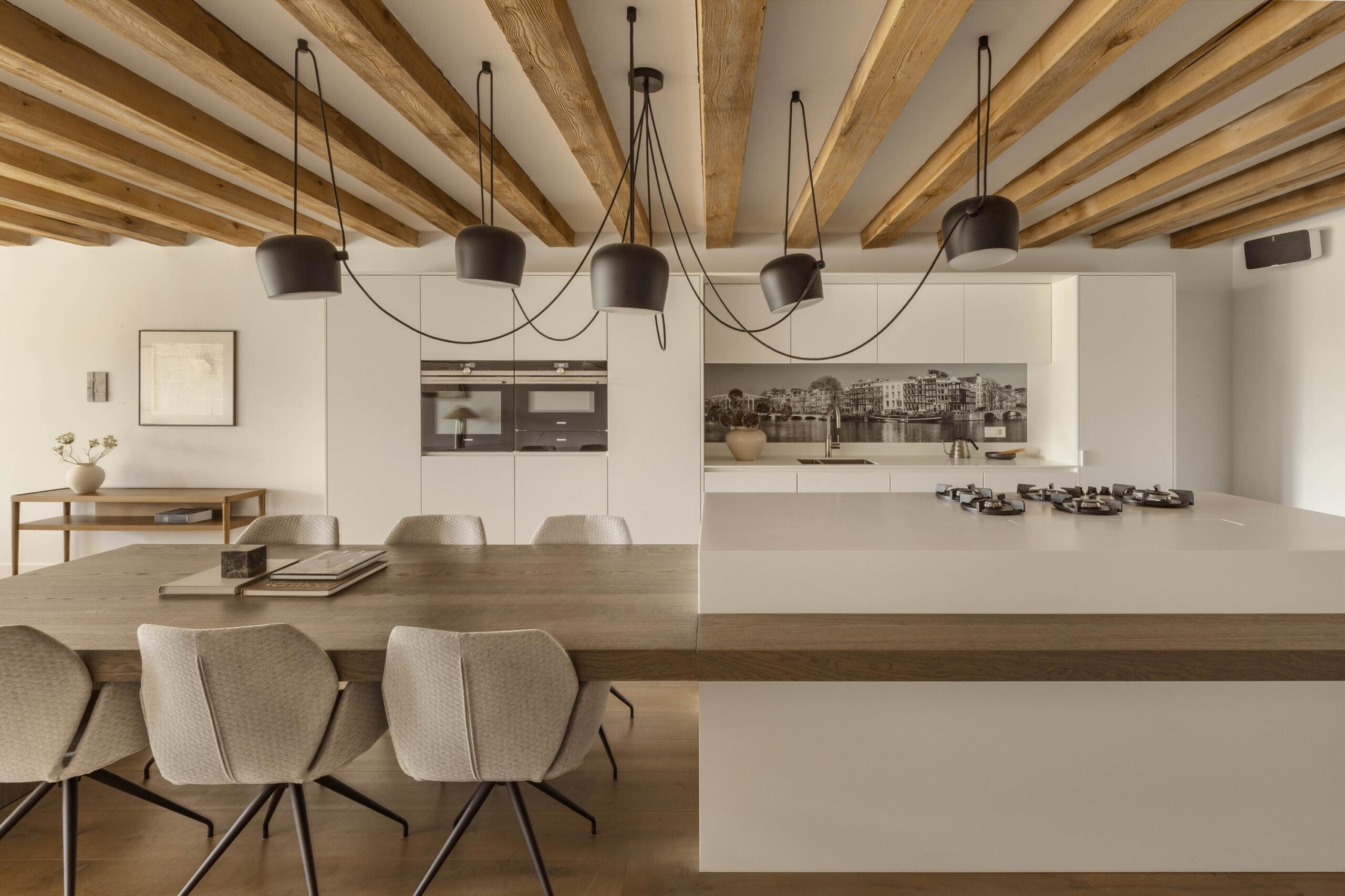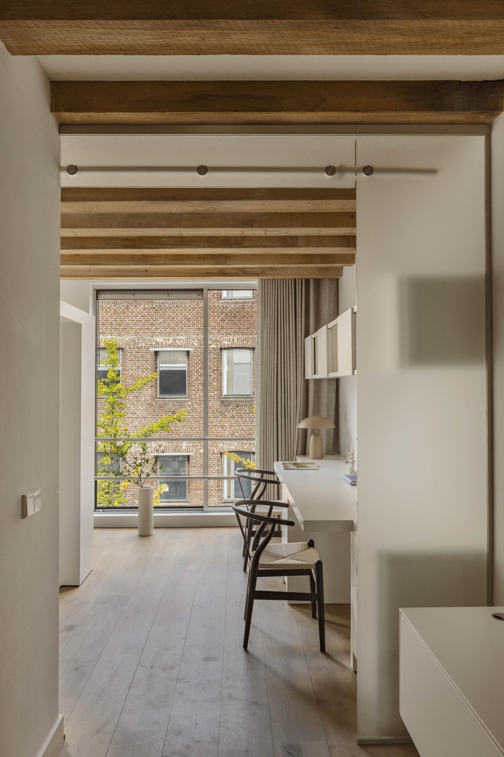The oak flooring and exposed wooden beams bring warmth and character, without compromising the apartment’s sense of space and height.