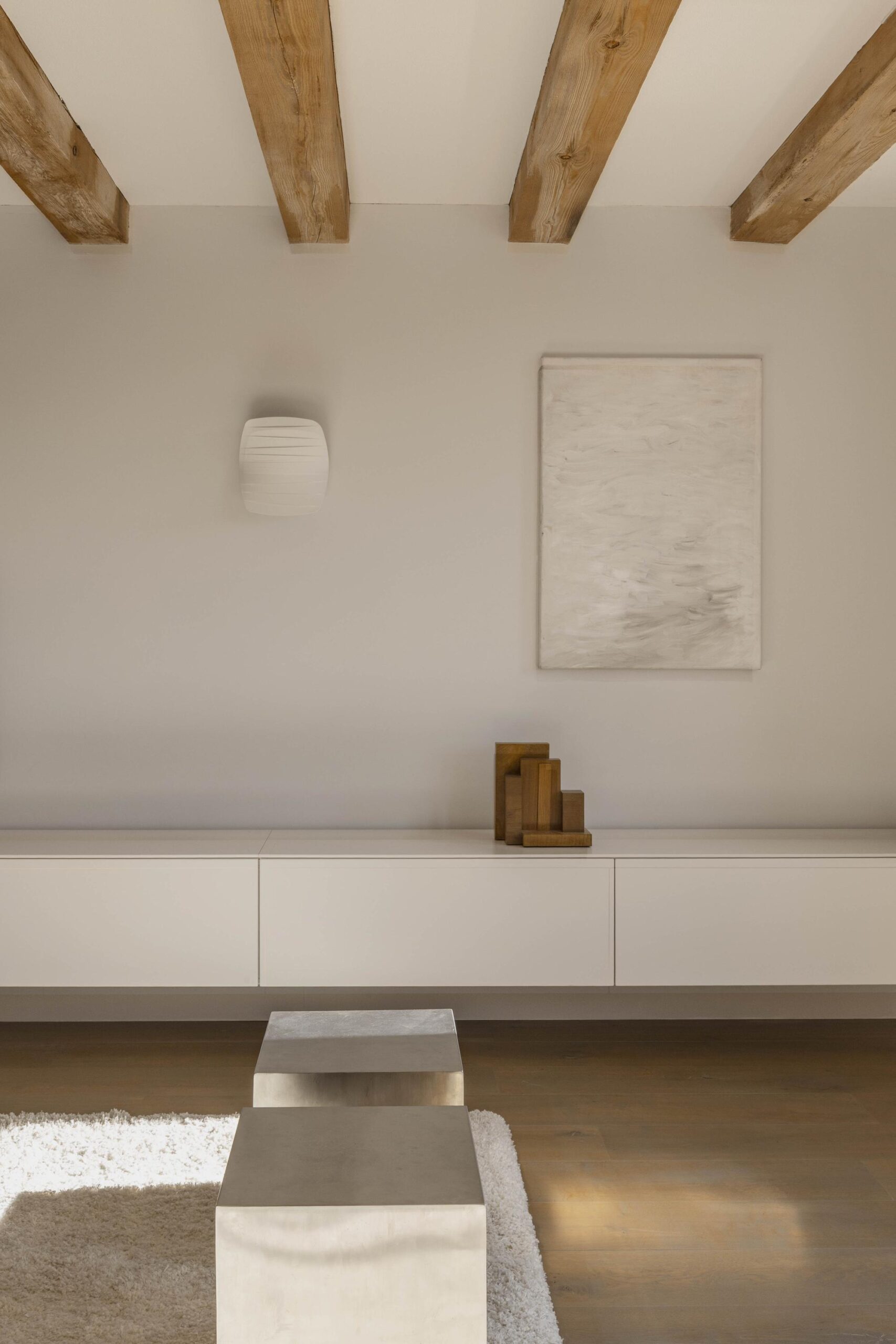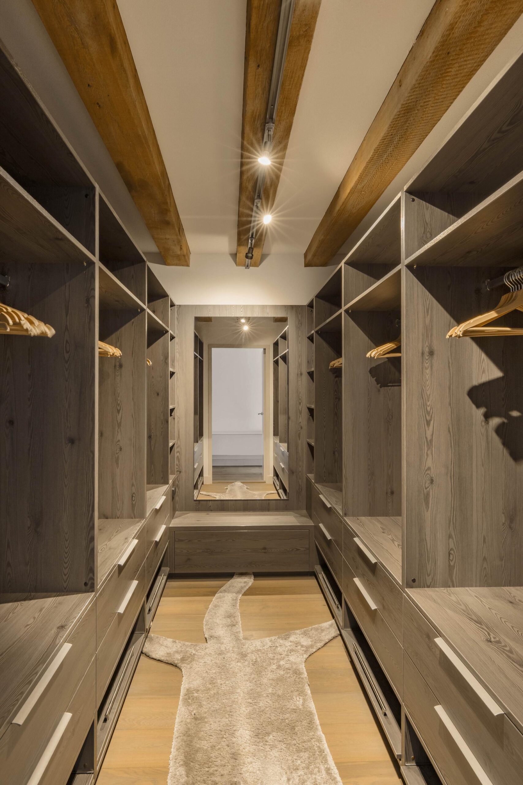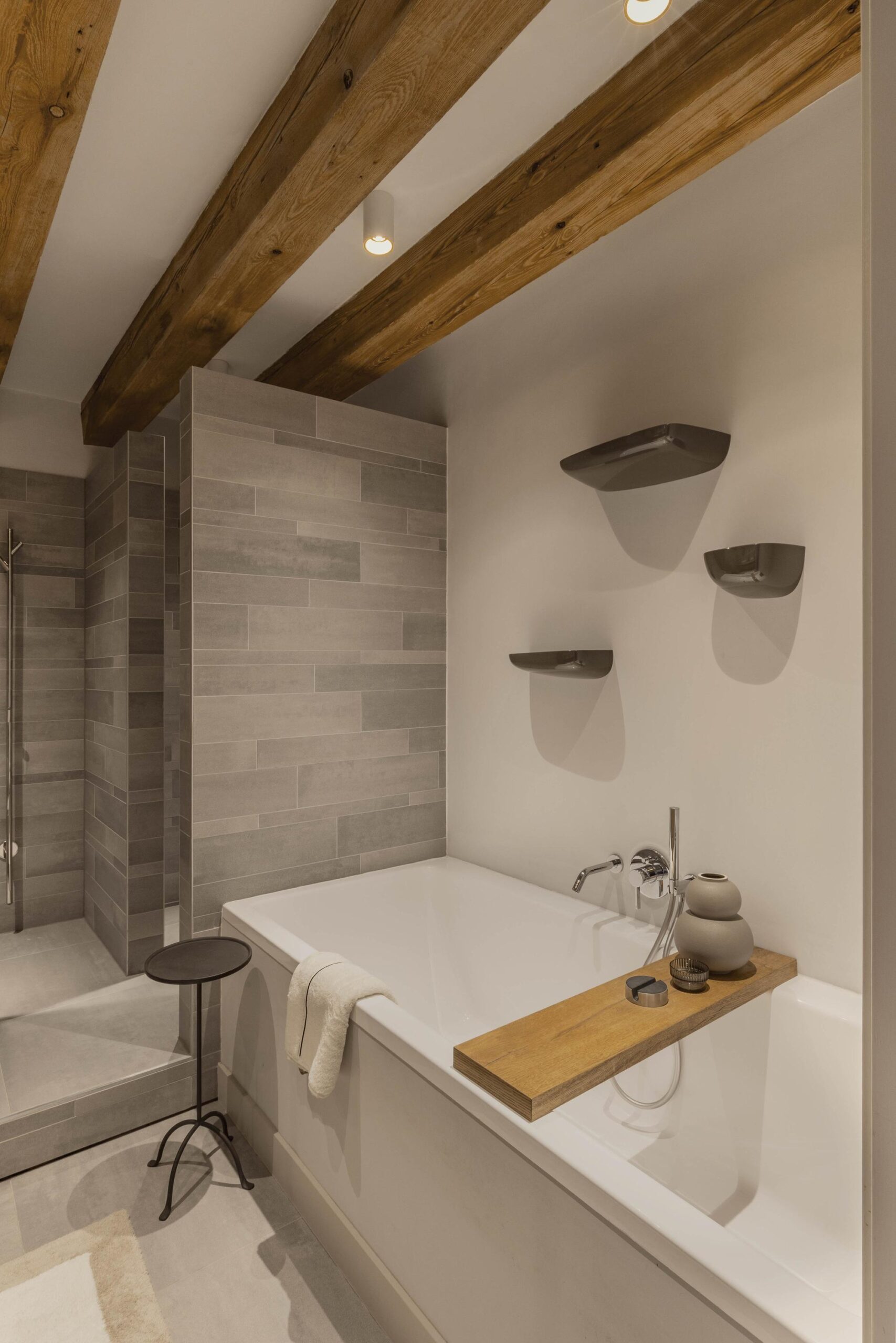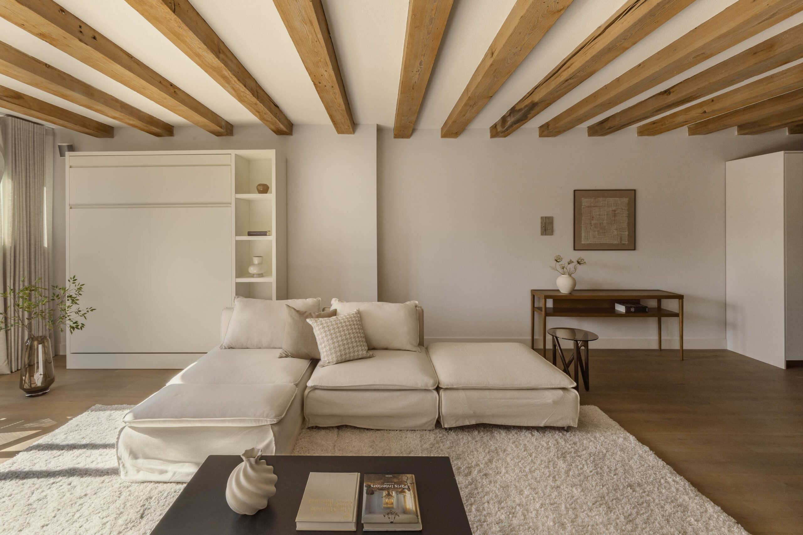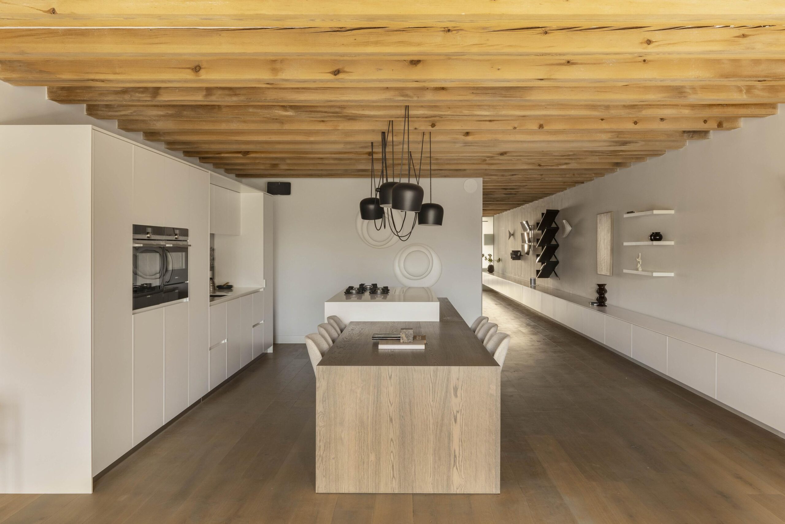 The oak flooring and exposed wooden beams bring warmth and character, without compromising the apartment’s sense of space and height.