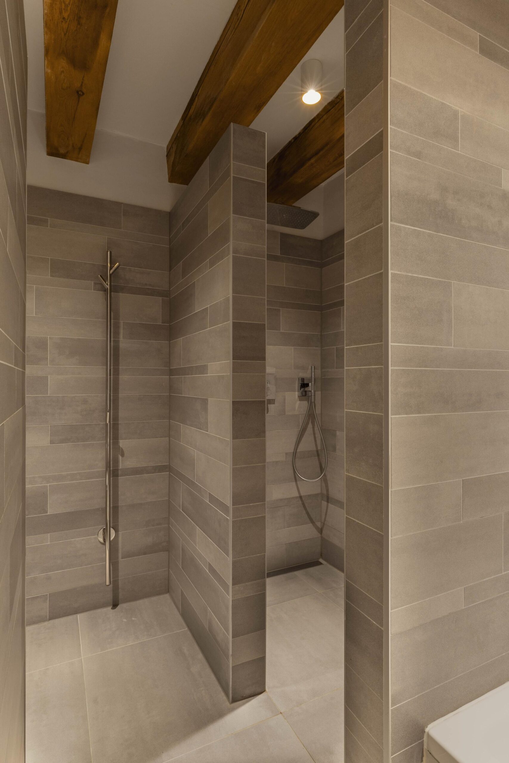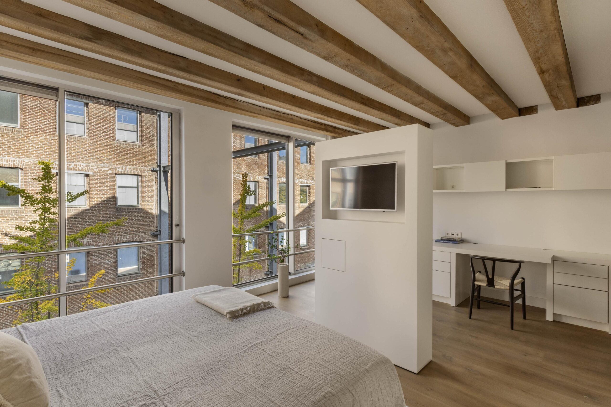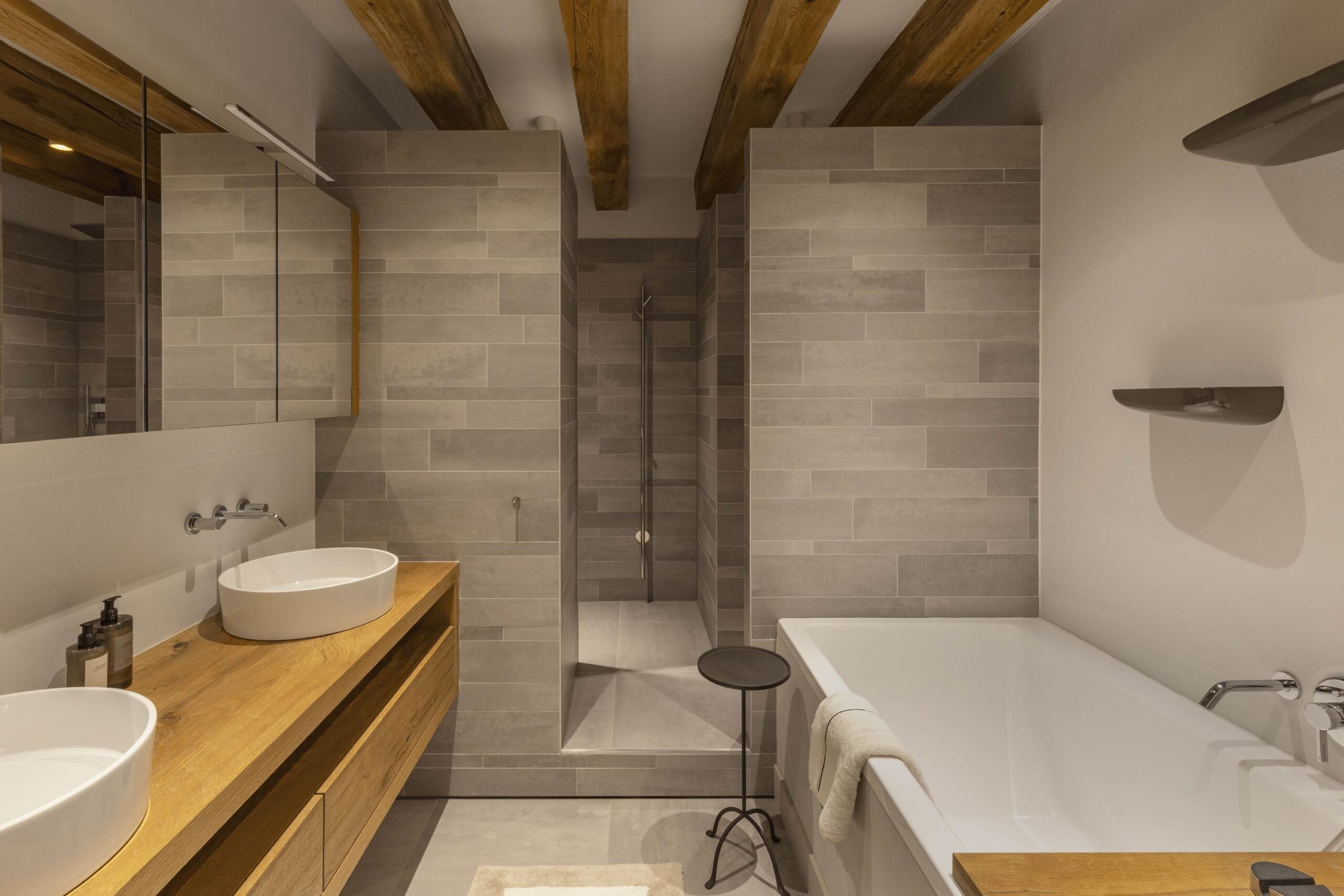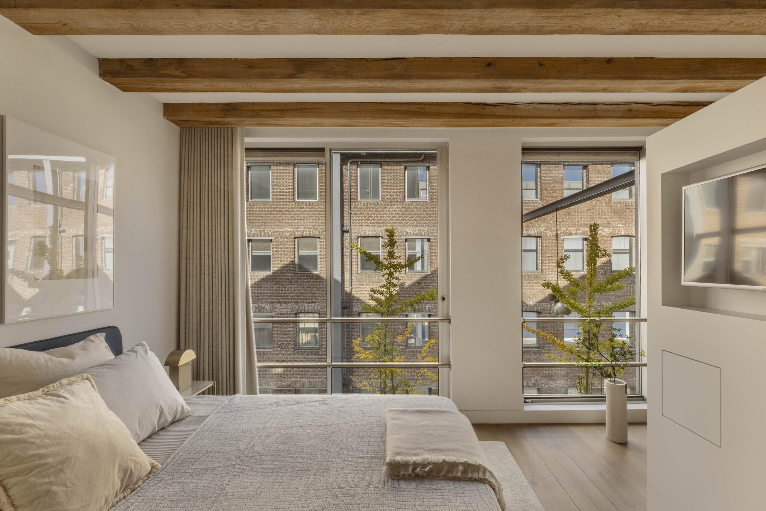 The oak flooring and exposed wooden beams bring warmth and character, without compromising the apartment’s sense of space and height.