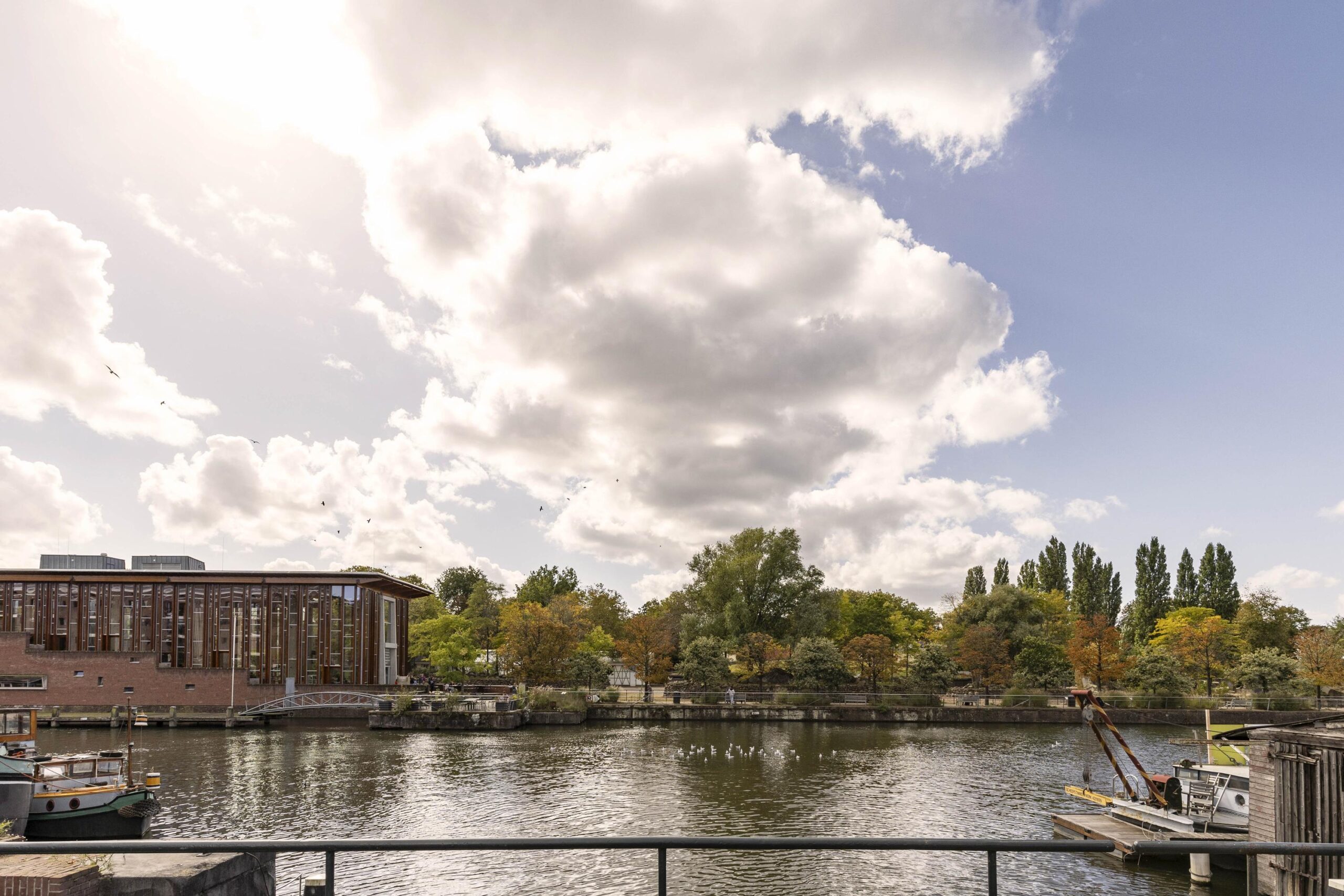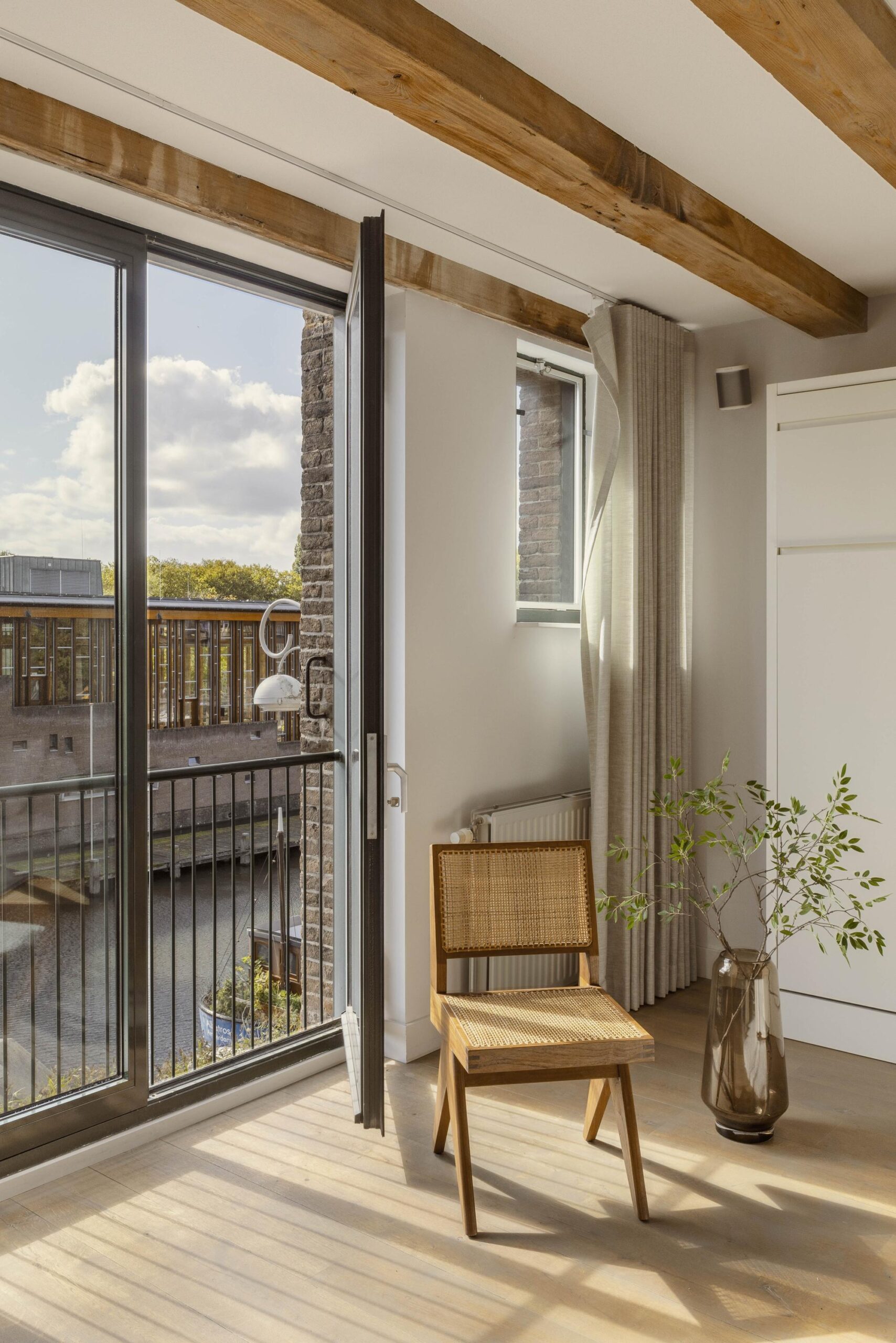 Enter via the lift or the well-maintained communal staircase into a spacious hallway with fitted wardrobe and separate guest toilet. From here, step into the light-filled living room at the front of the apartment. Large windows frame striking views of Artis and the waters of Entrepotdok. With an impressive ceiling height of 2.61 metres (remarkable for a former warehouse) the space feels open, bright, and instantly atmospheric.