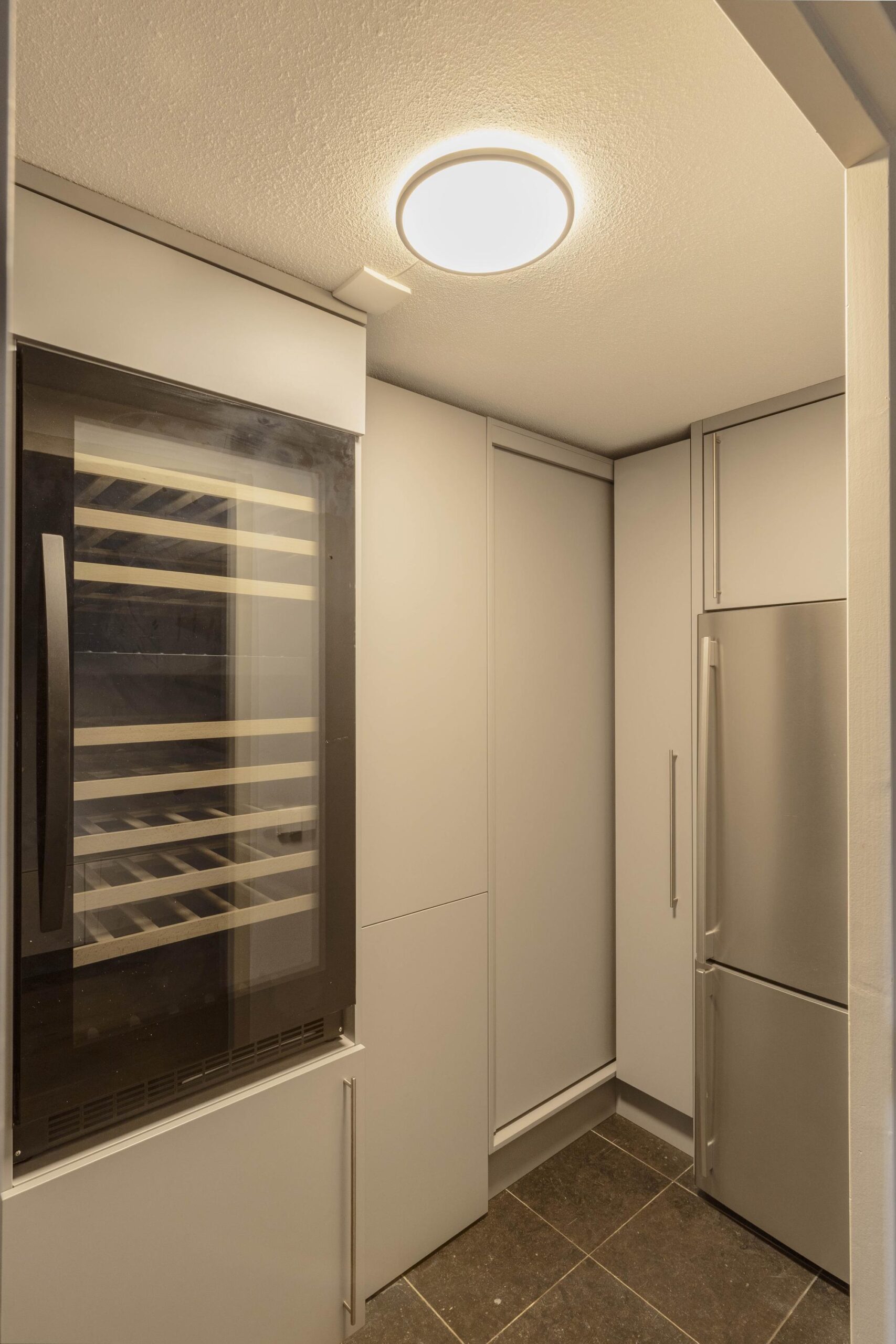 Adjacent to the kitchen is a practical utility room with an additional fridge, freezer, and wine cooler.