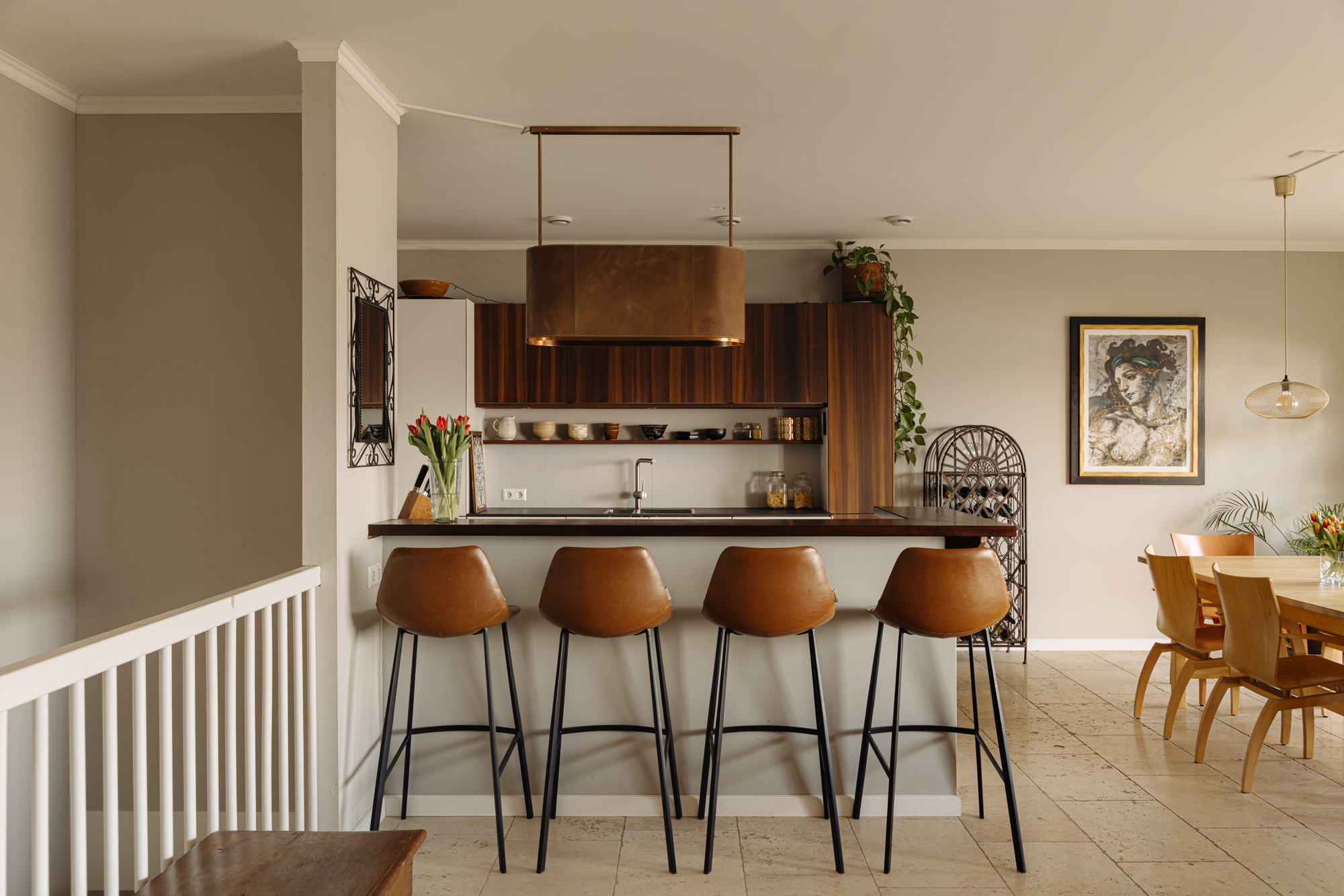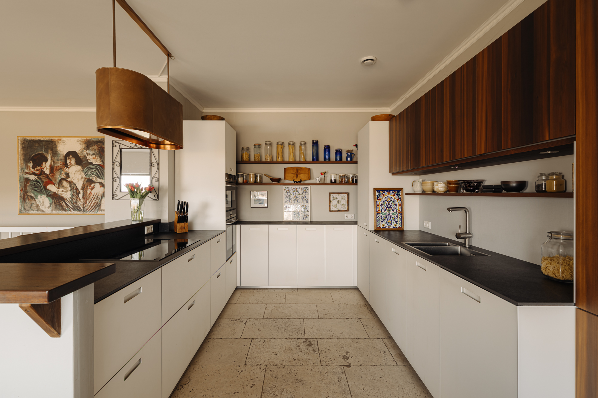 At the centre of the room is the open-plan kitchen with a fixed breakfast bar. The kitchen is fitted with an induction hob with a WaveDesign extration hood and a bespoke cabinet wall incorporating a Siemens combi-oven and a separate oven. The finish is sleek and carefully executed, in keeping with the architecture of the property.