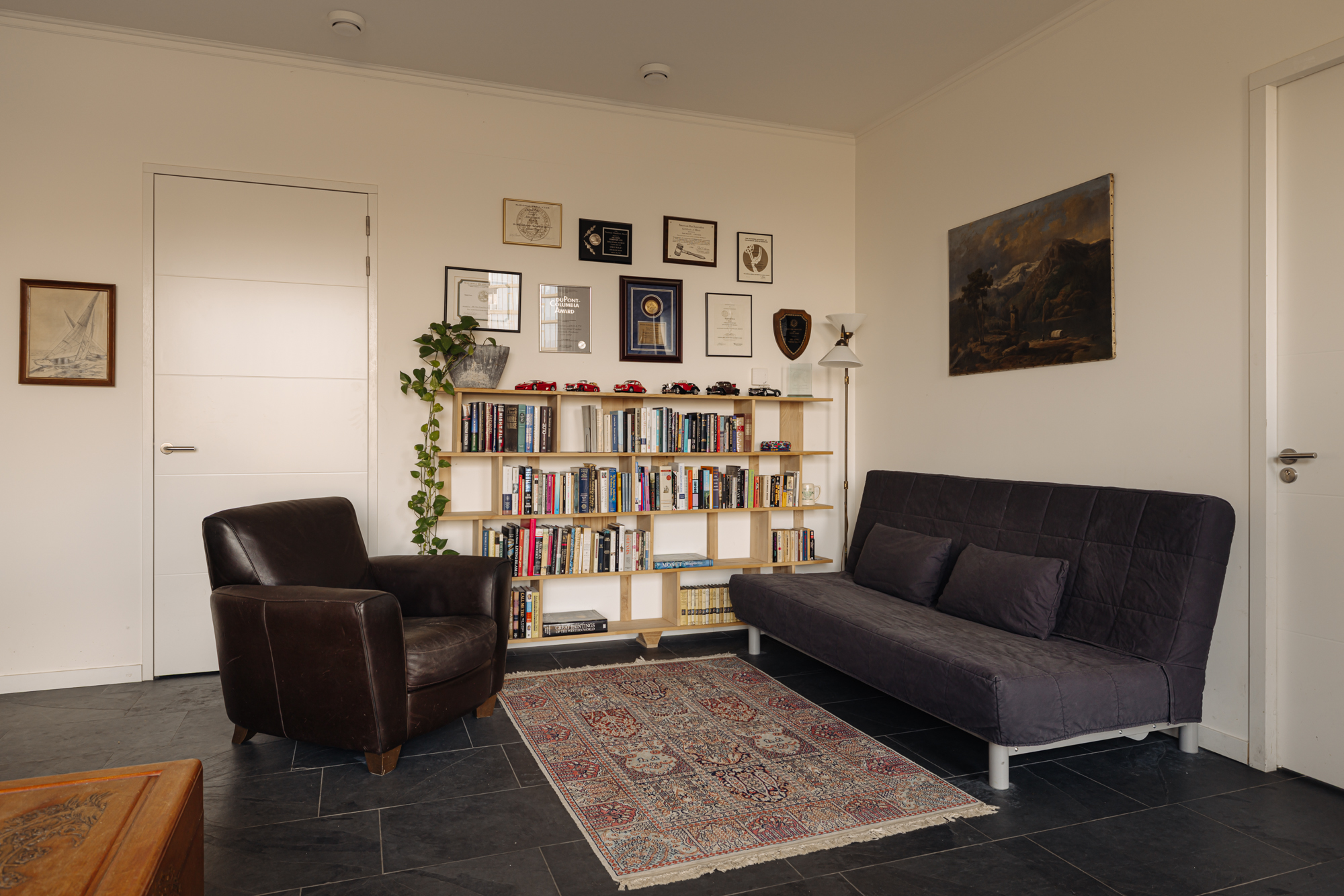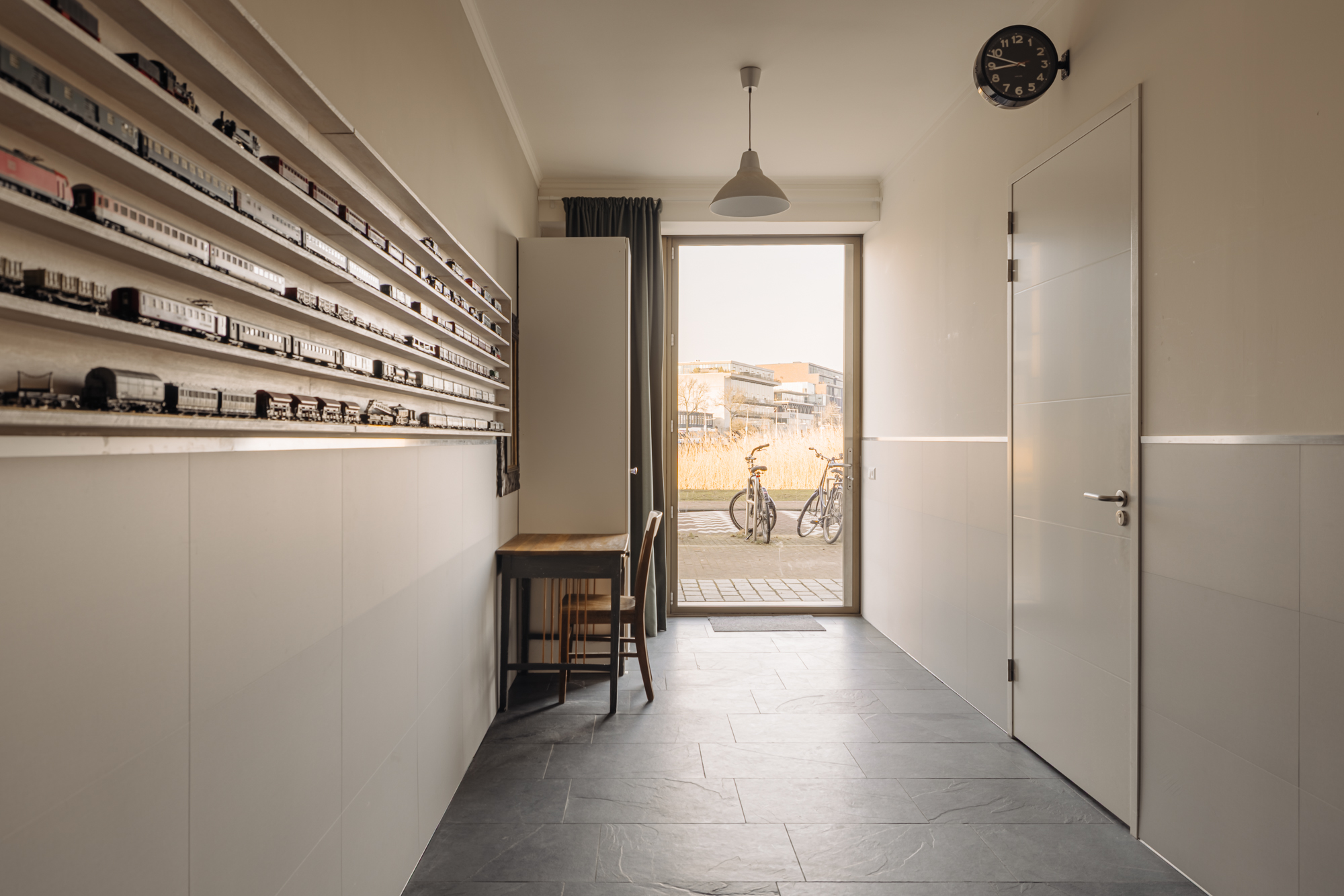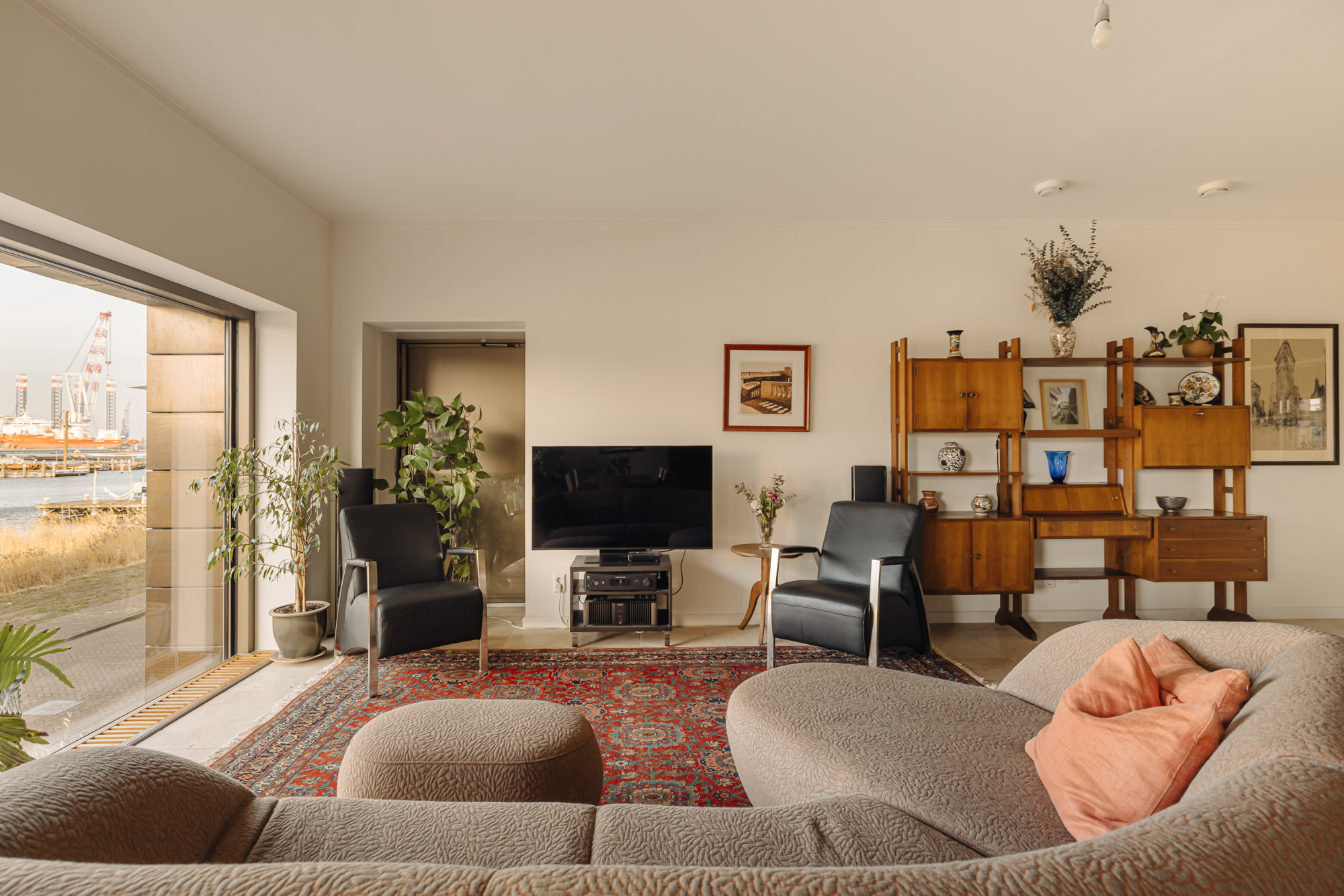 The property has two entrances: a private entrance at street level on the ground floor and an entrance via the communal hallway with lift on the first floor. On the first floor, the various rooms are accessed from the hallway, with the living room stretching across the full width at the front. Large windows create a strong visual connection with the IJ and provide a constant flow of natural light throughout the space. Electric blinds on all windows provide privacy and filter direct sunlight at the touch of a button.