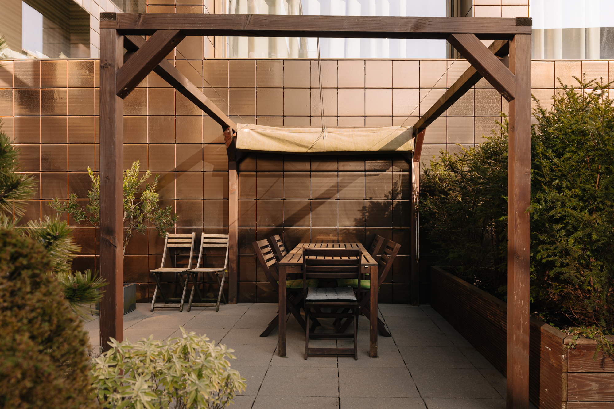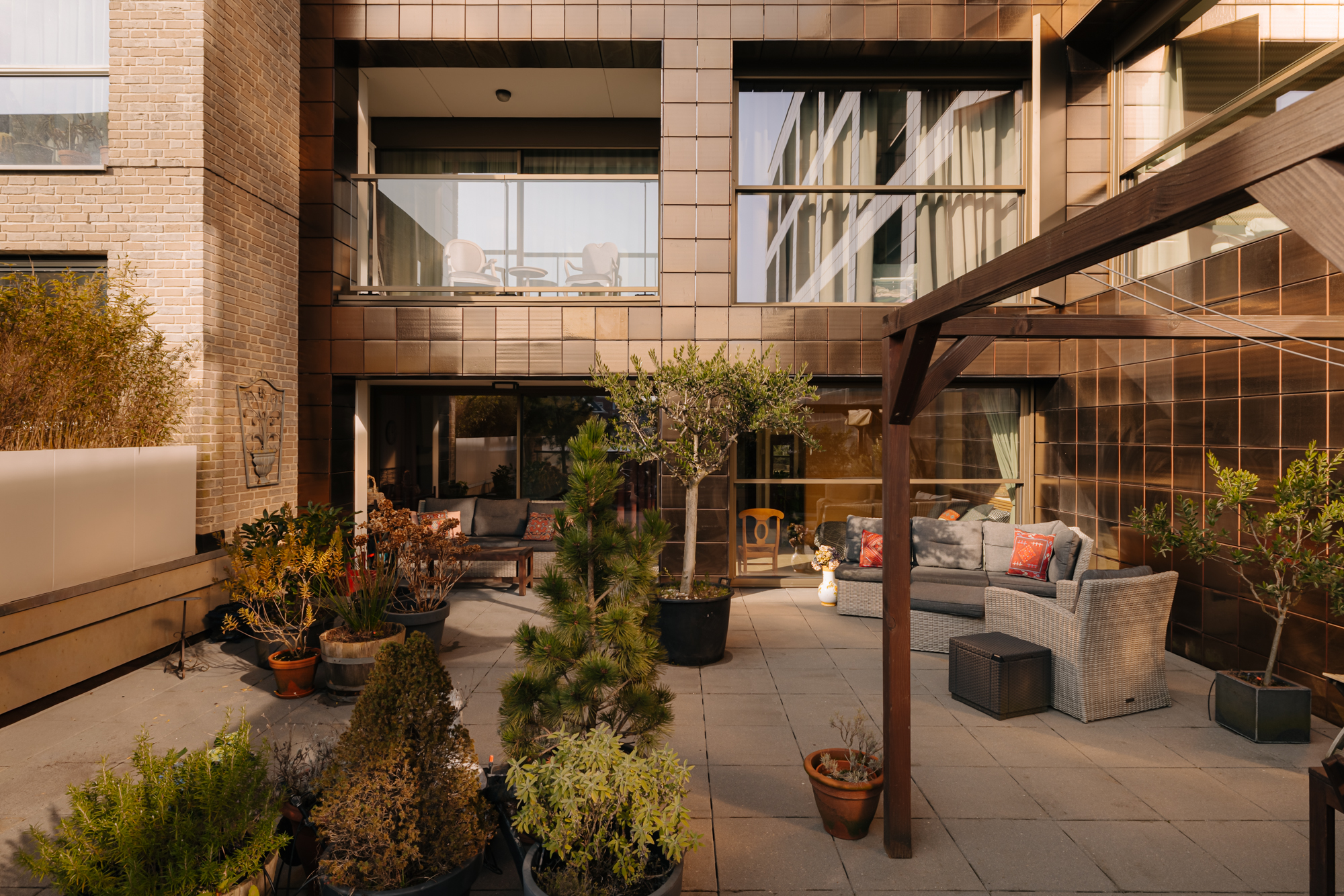 At the rear are two bright bedrooms, both with direct access to the beautifully landscaped roof terrace of approximately 56 m². The terrace, facing south-east, is generous in size and accommodates several seating and dining areas.