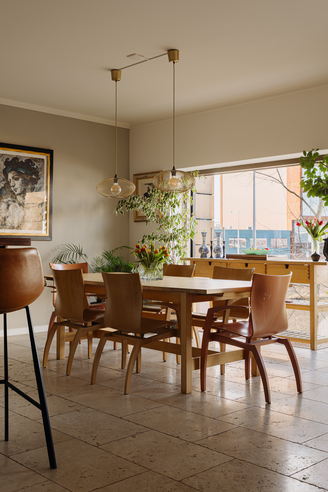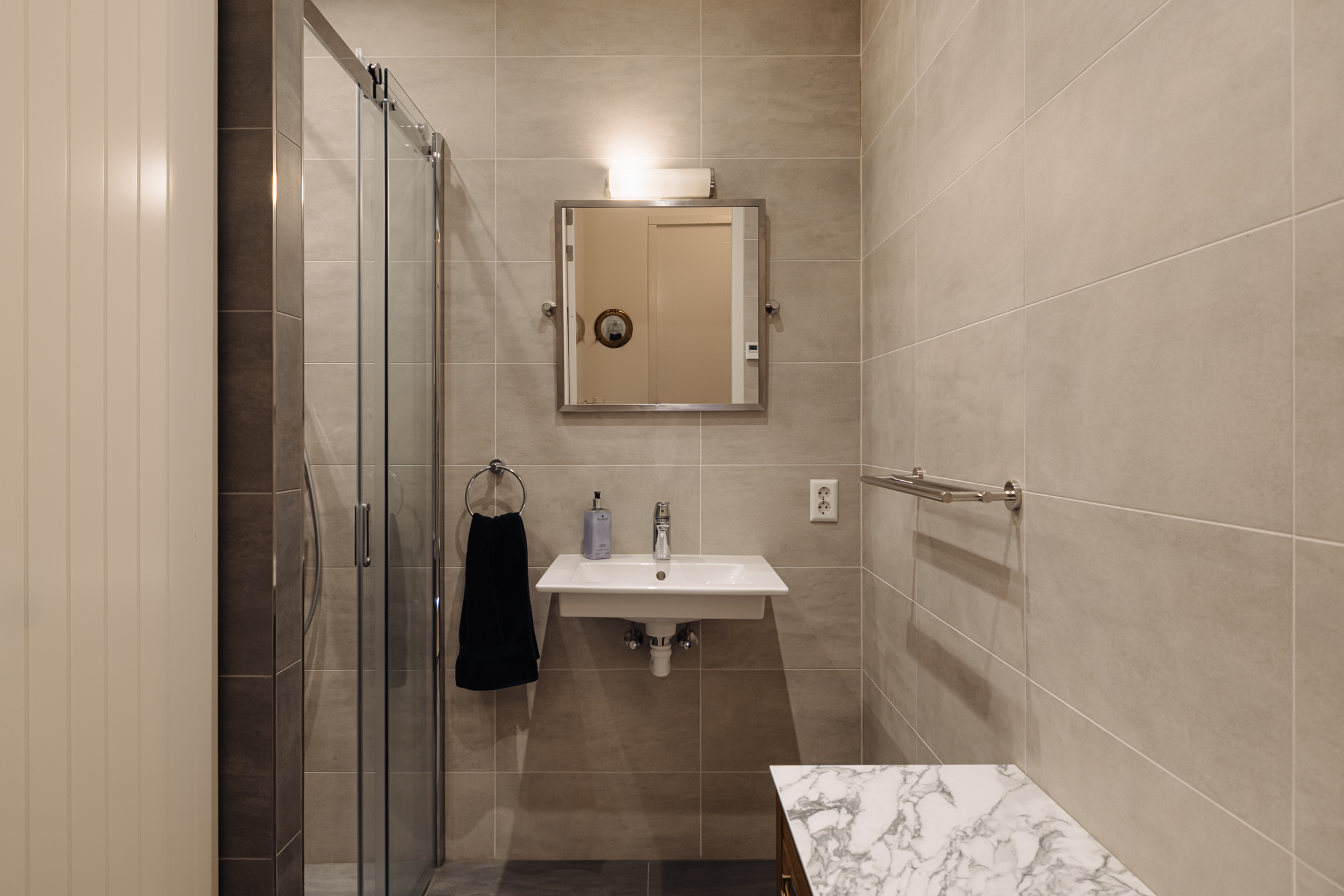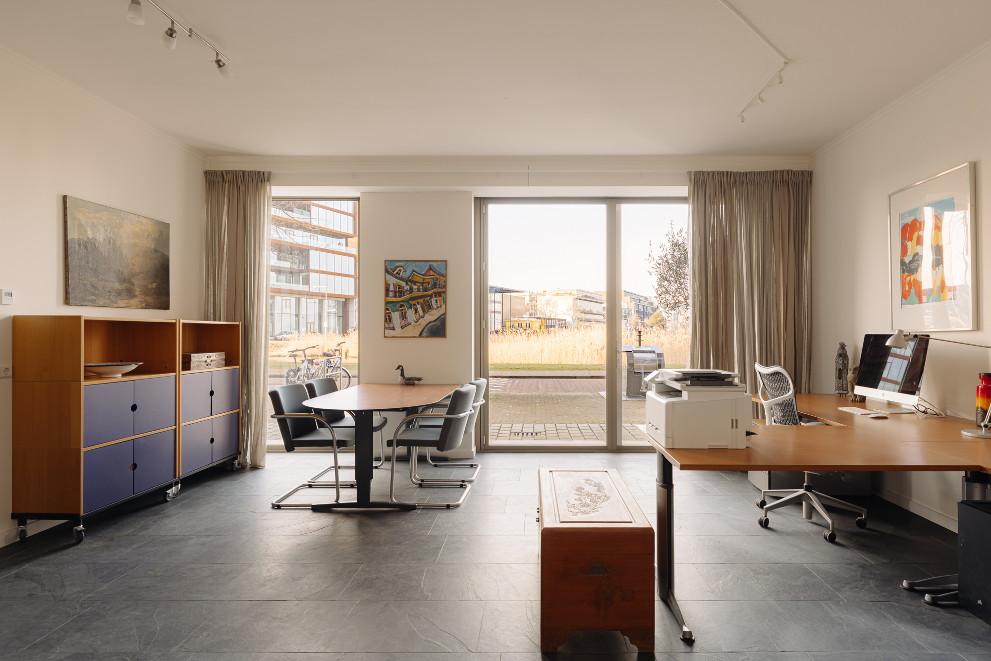 An internal staircase from the living room leads down to the ground floor. Here you will find a hallway with access to a multifunctional space with 3-metre-high ceilings, large windows with French doors opening to the outside, and a storage room and seperate toilet. Thanks to its private entrance, this space is perfectly suited for use as a home office, practice, studio or additional bedroom.
