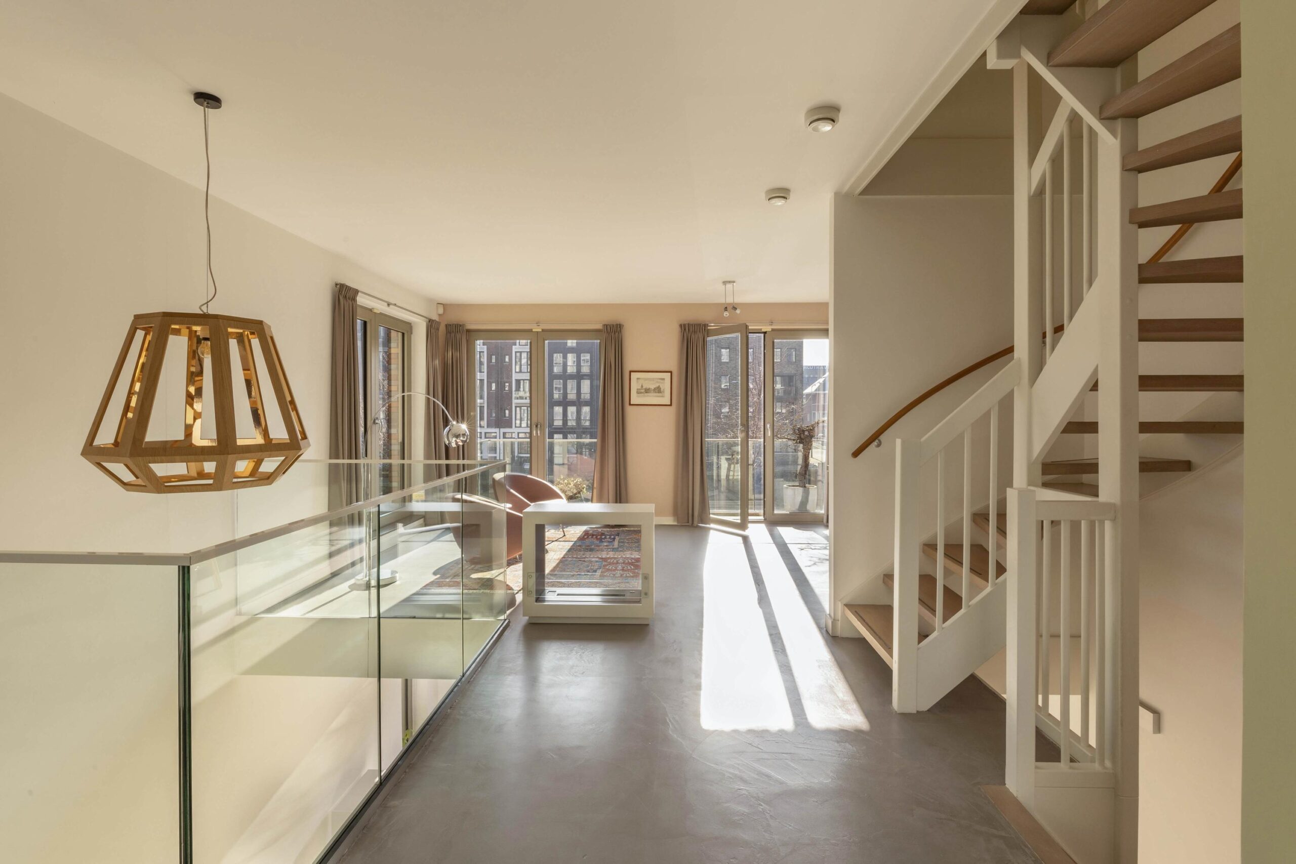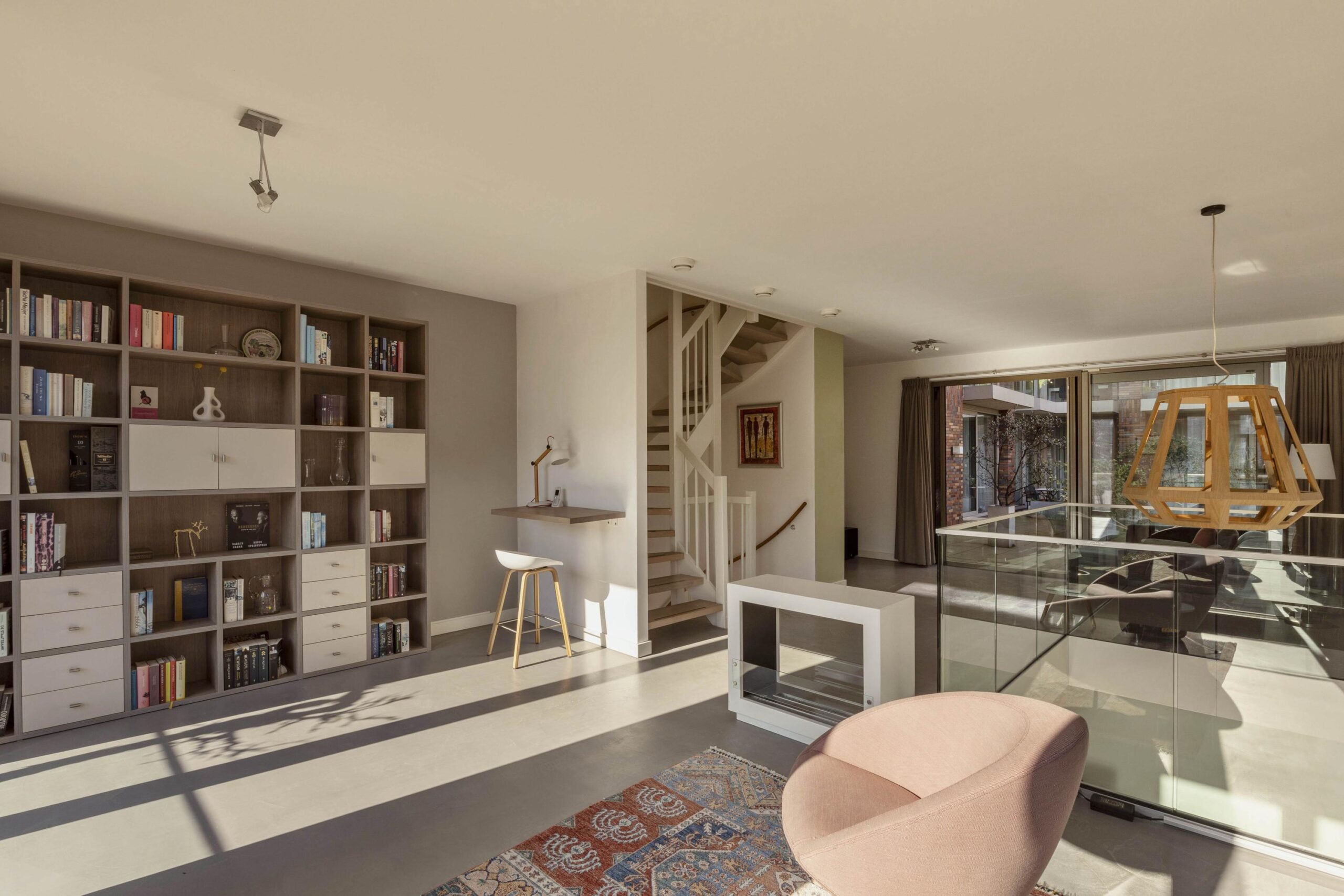 An elegant staircase leads to the first floor, where the spacious living room is located. Large windows on both sides provide pleasant natural light throughout the space. In the center of the room there is an open void, creating a visual connection with the floor below.