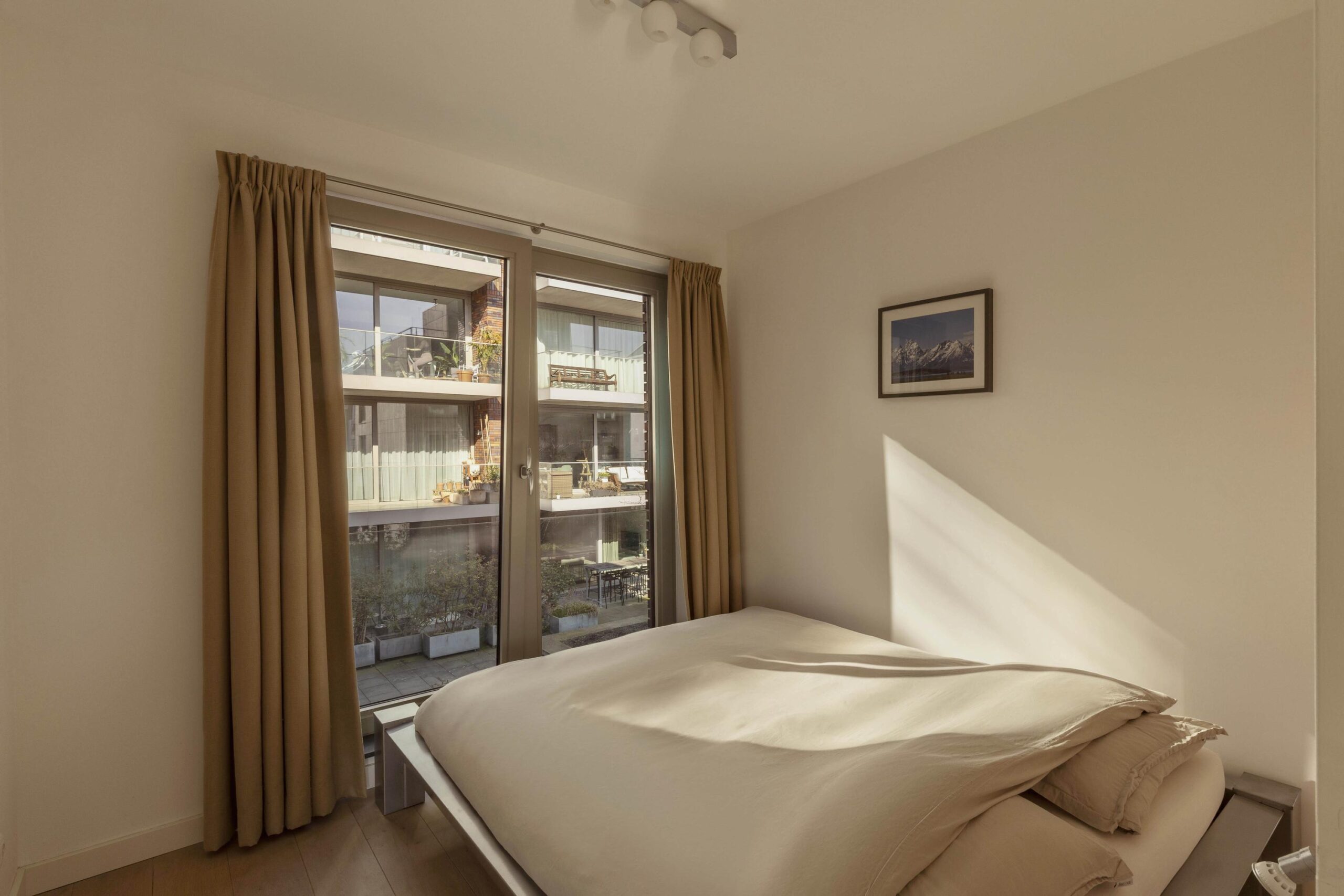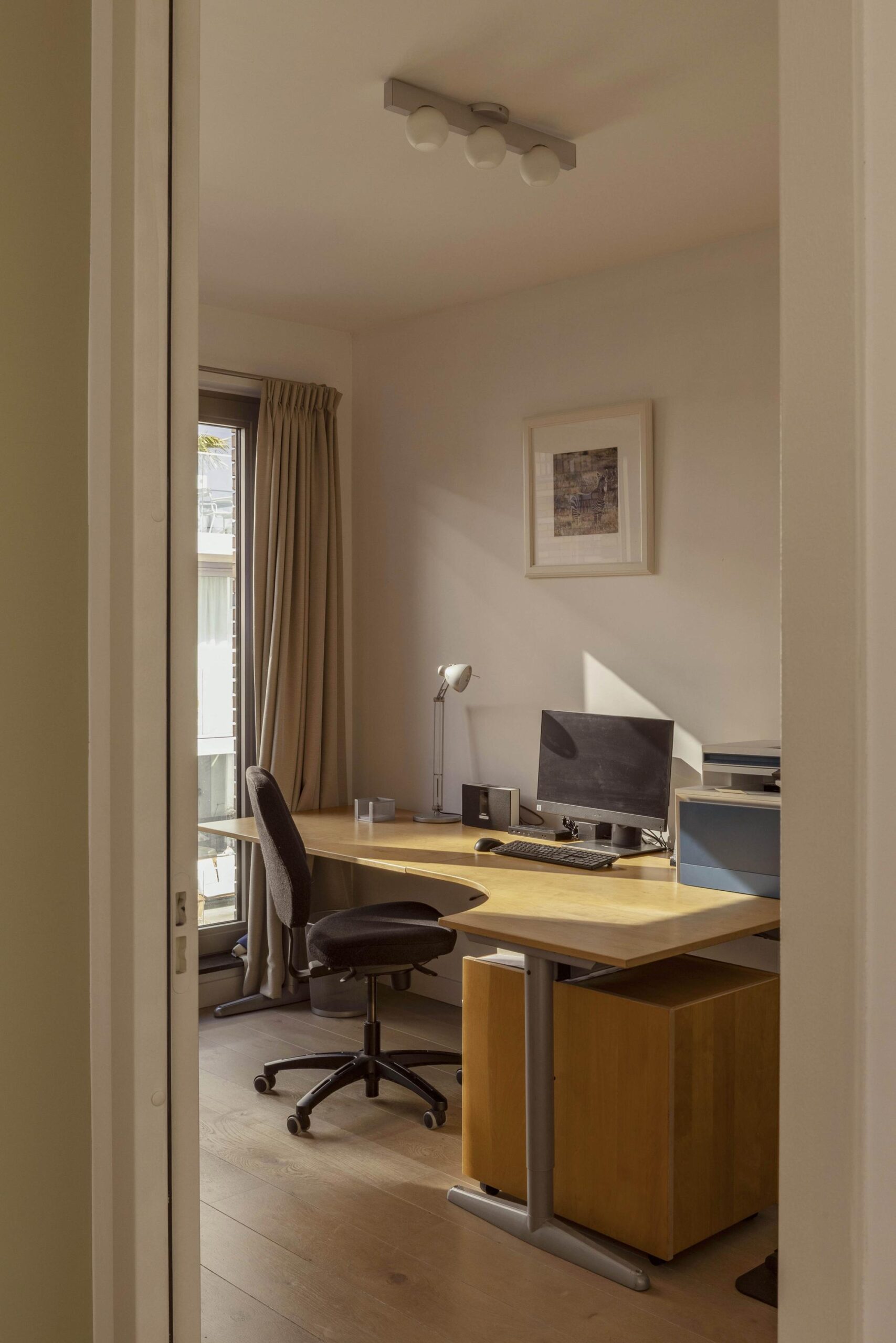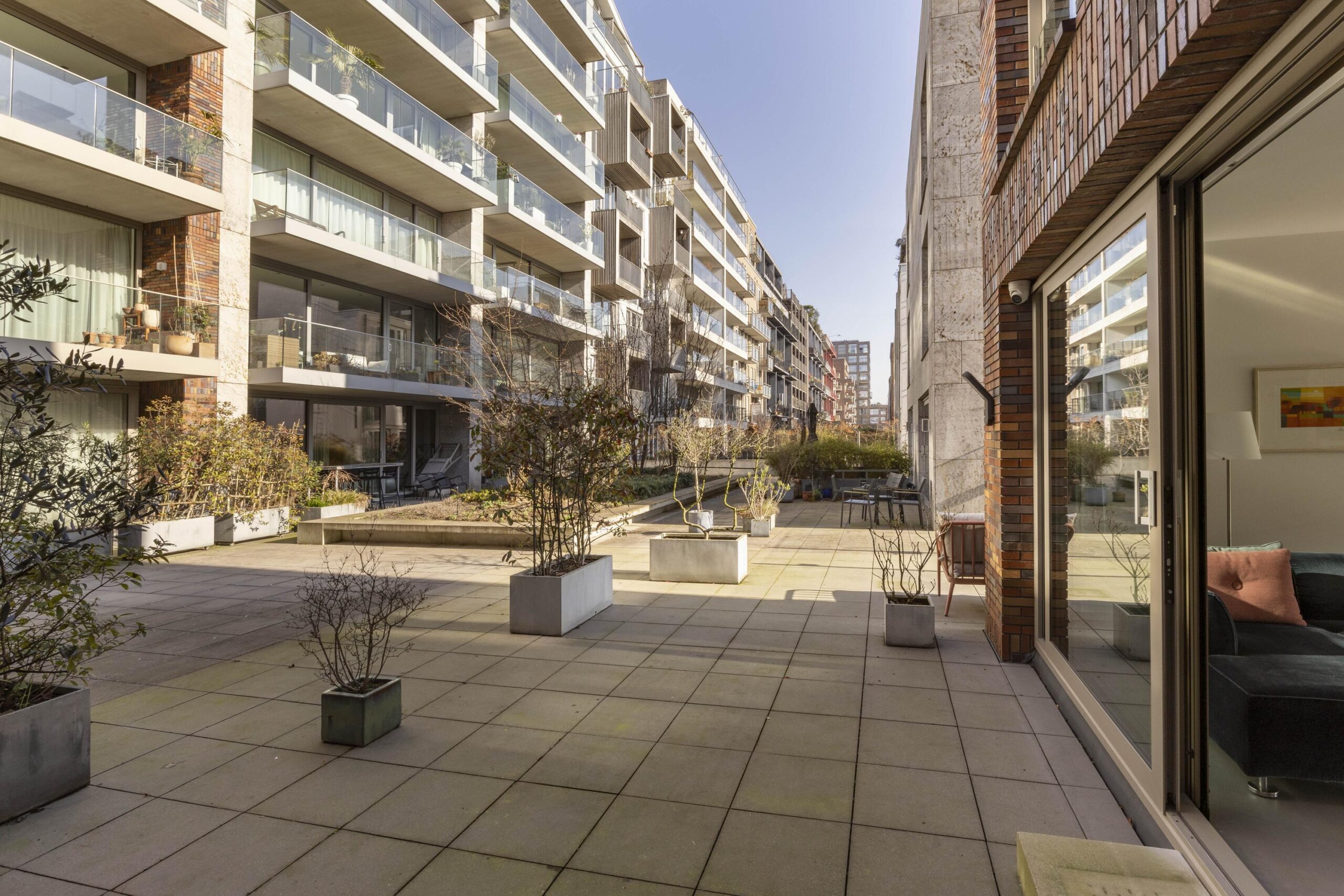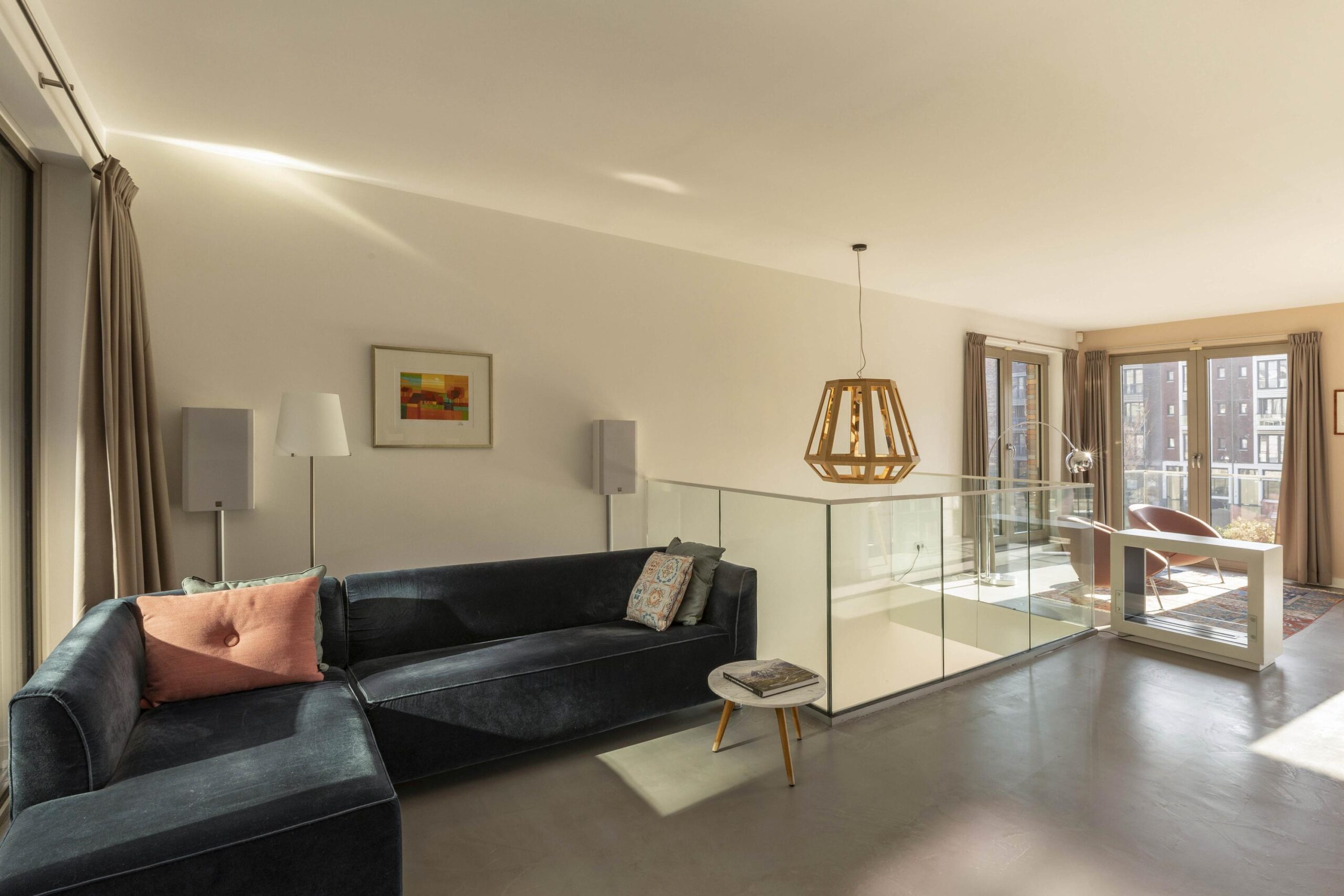 The second room is currently used as a home office and also overlooks the inner gardens. Due to the floor-to-ceiling windows, all rooms benefit from beautiful natural light and open views.