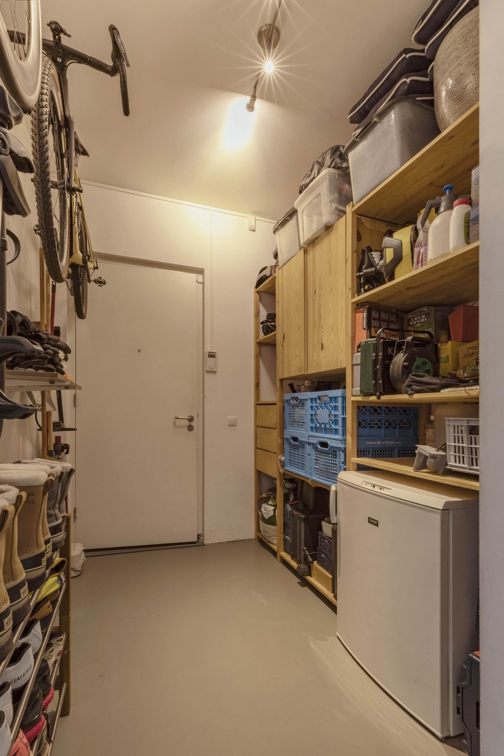 At the rear of the property there is a second hallway with a separate toilet, storage space and a spacious internal storage room with a wine climate cabinet and additional freezer. The parking garage is directly accessible from this storage room.
