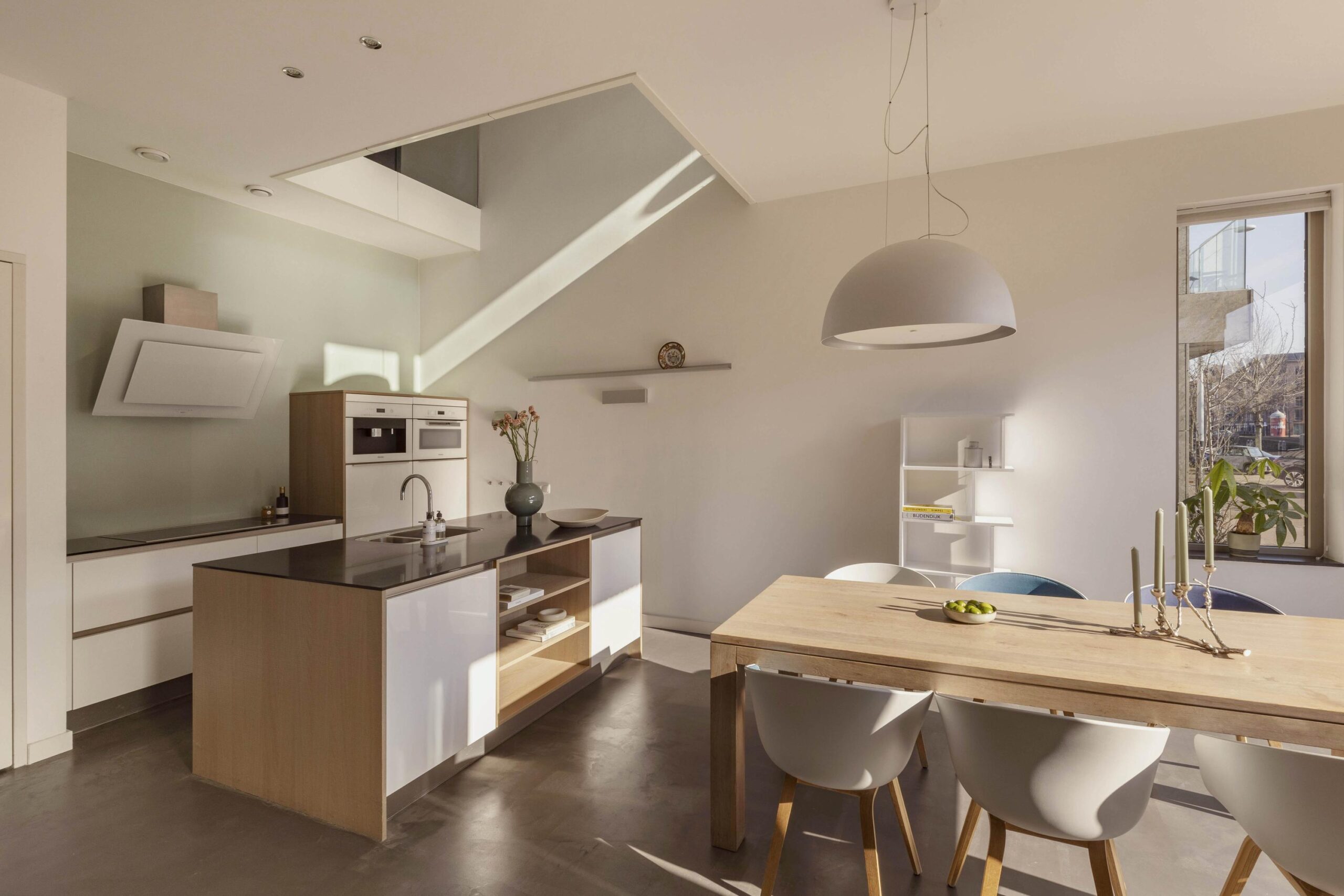 Entrance via the ground floor. The hallway provides access to the dining area with open kitchen. This bright living space is characterized by a ceiling height of approximately 3.20 meters and a large glass façade with folding glass doors that can be fully opened, allowing abundant natural light and creating a seamless connection with the outdoor space.