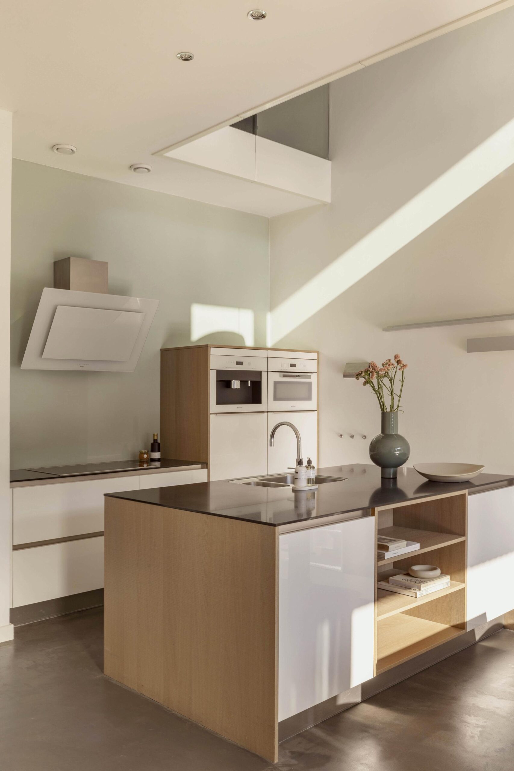 The open kitchen features a kitchen island with composite countertop and high-end Miele built-in appliances, including an induction cooktop, combi oven, coffee machine, dishwasher, refrigerator, freezer and a Quooker tap.