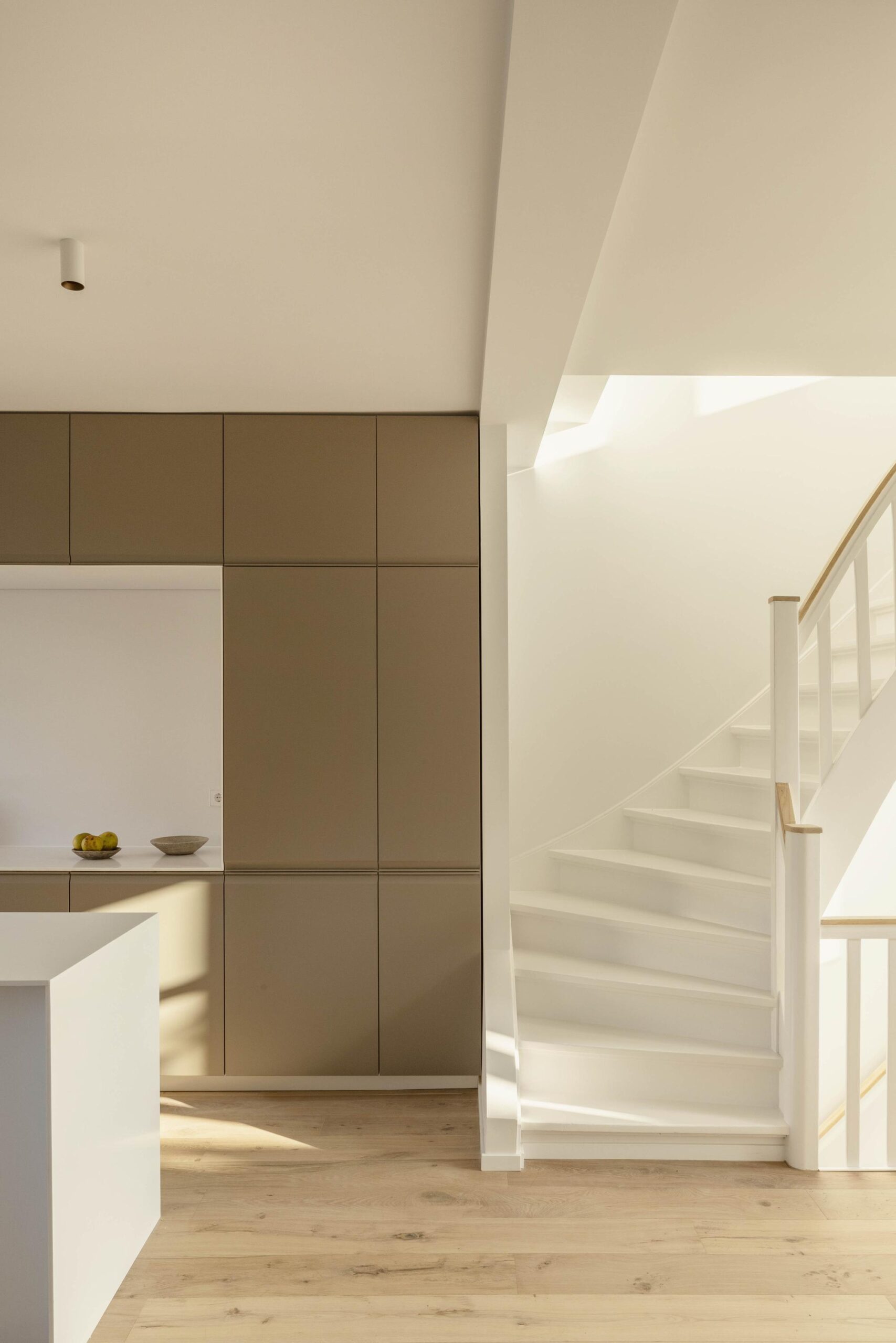 Centrally positioned is the dining area, with an adjacent open-plan kitchen. Finished in soft, natural tones, the kitchen features a central island with bar seating, an induction hob with integrated extractor, a Quooker, and a range of built-in appliances. At the rear, the south-facing balcony overlooks the courtyard gardens and enjoys sunlight from late morning through to the evening.