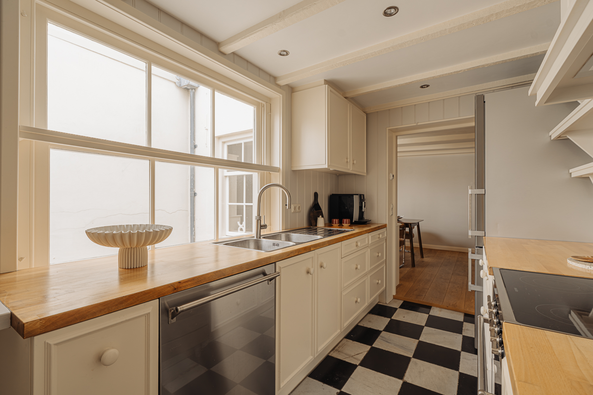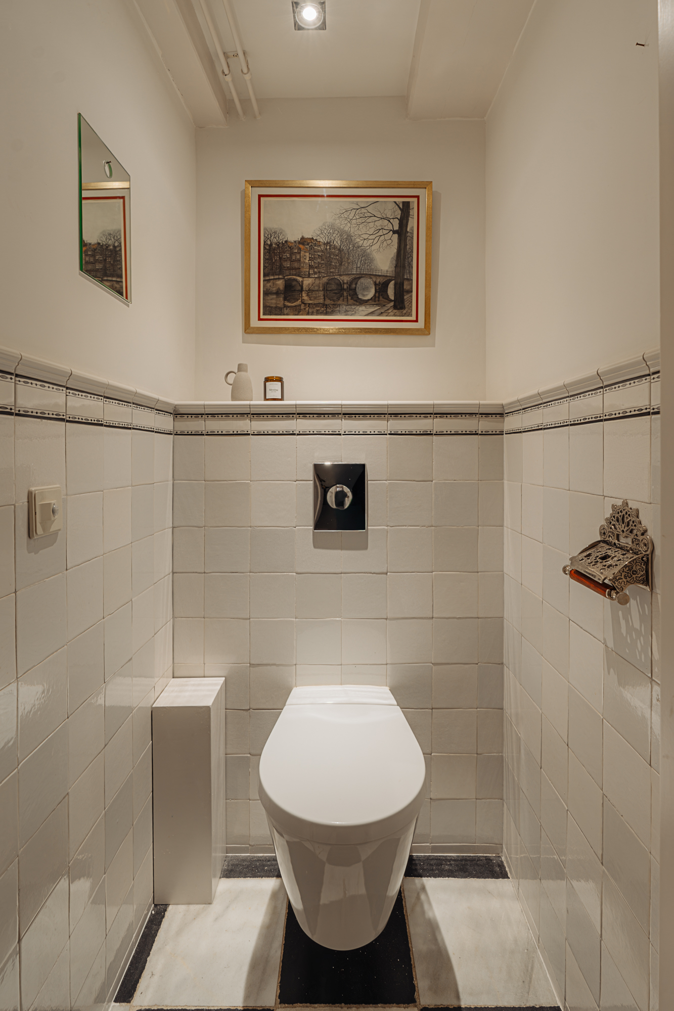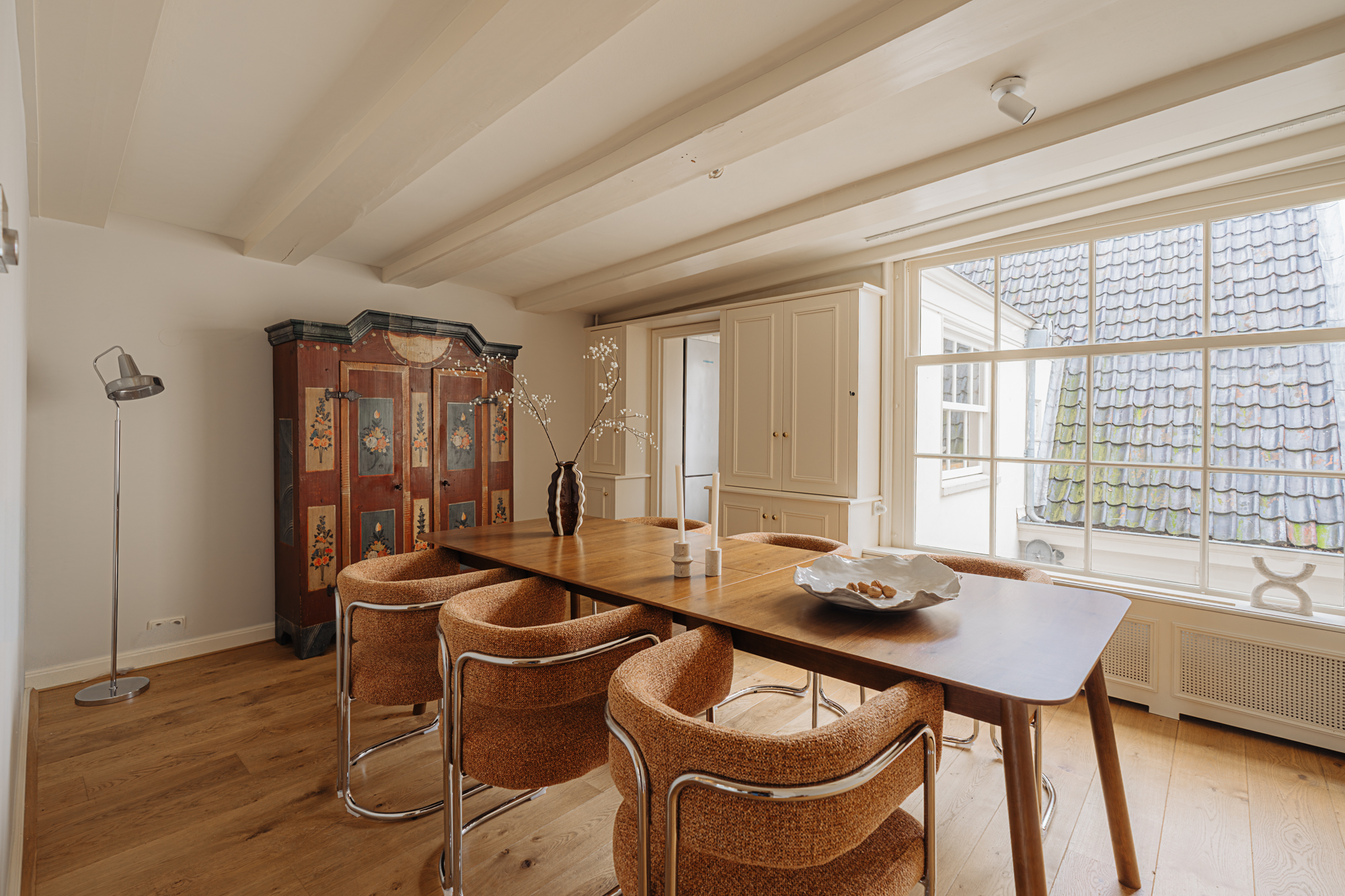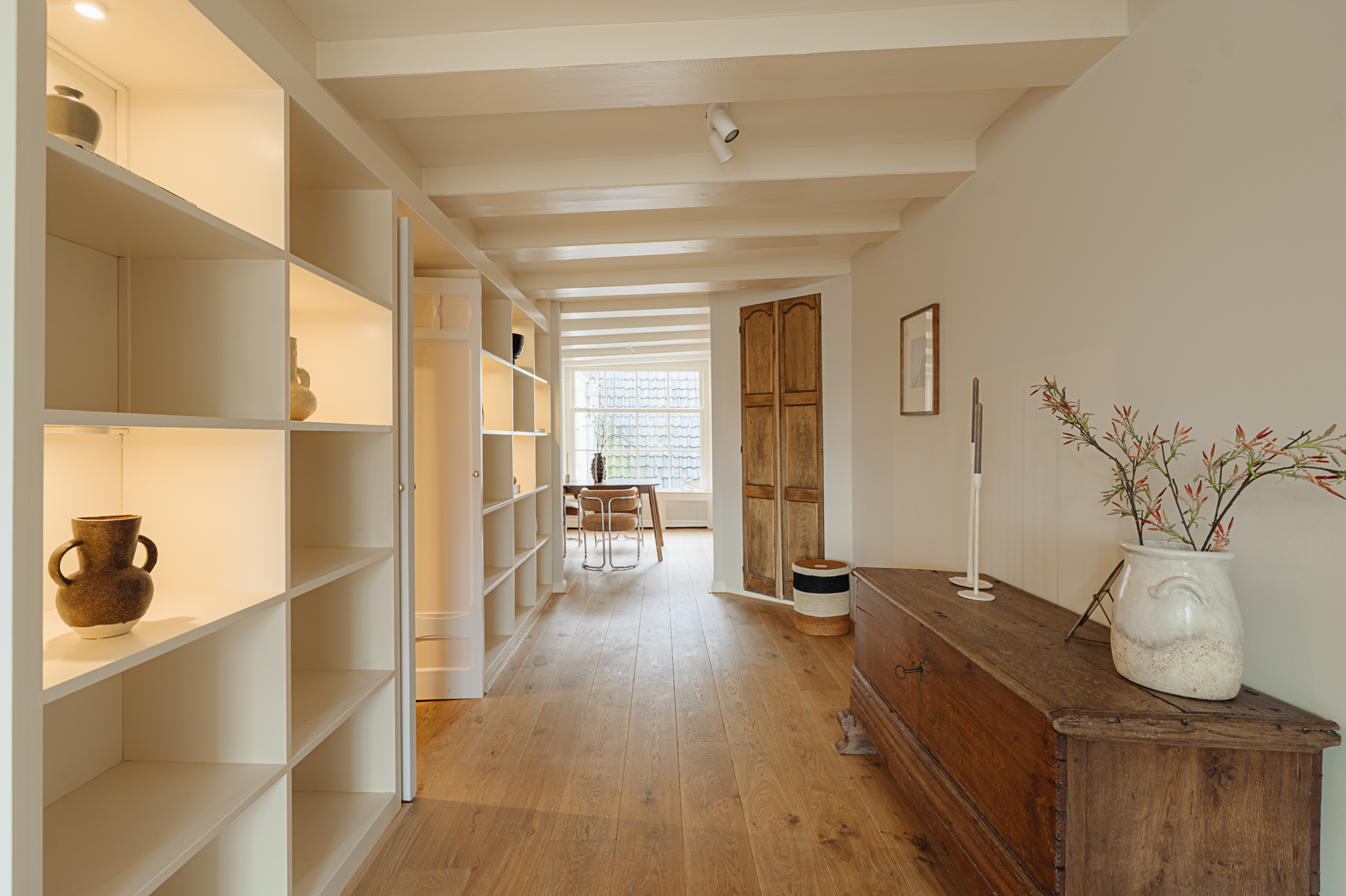 A spacious entrance with cloakroom, guest toilet and fountain leads to the living floor. At the front you’ll find the three window wide living room with wooden flooring, exposed beams, antique cast iron stove and an atmospheric view over the canal.