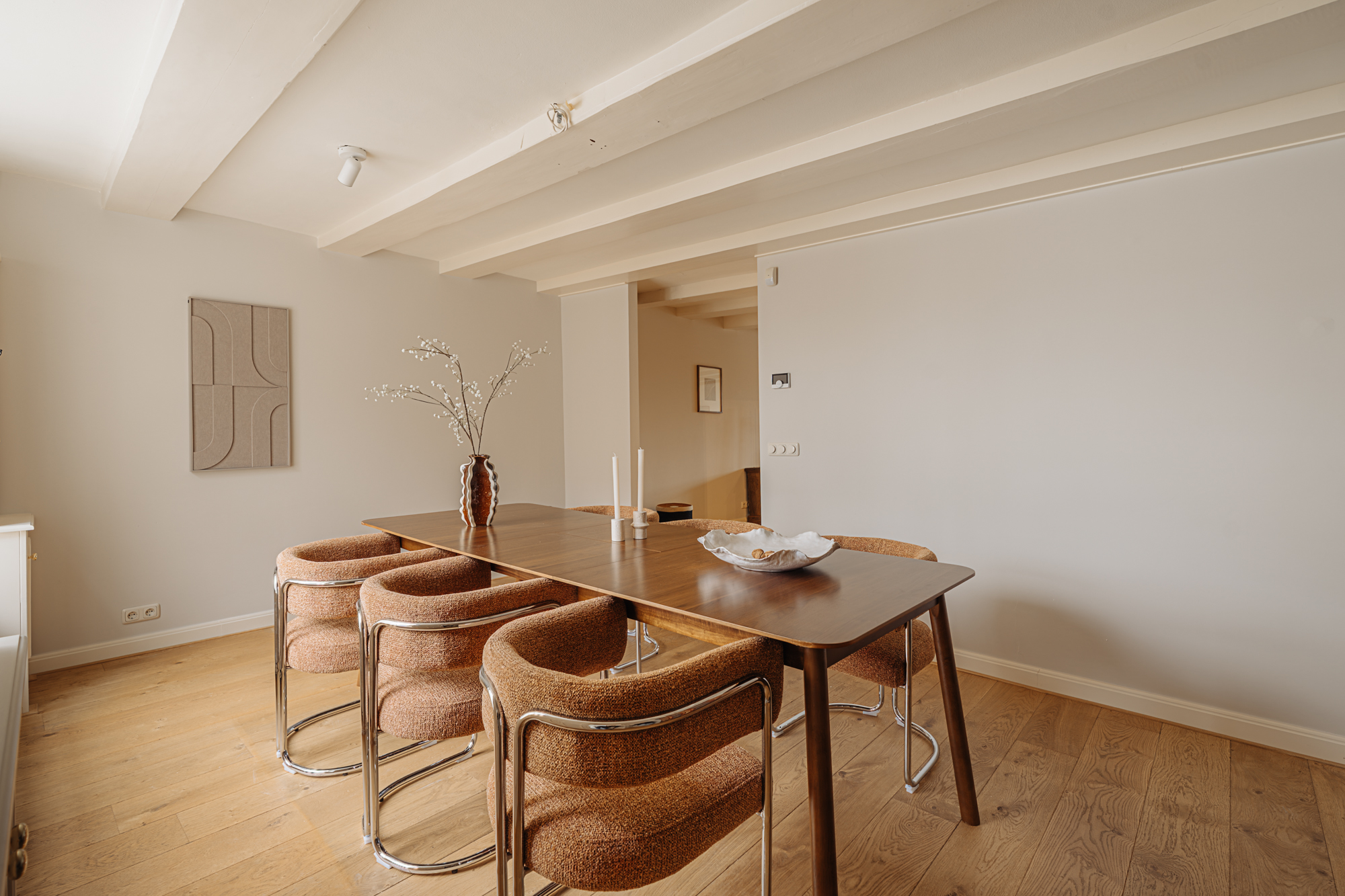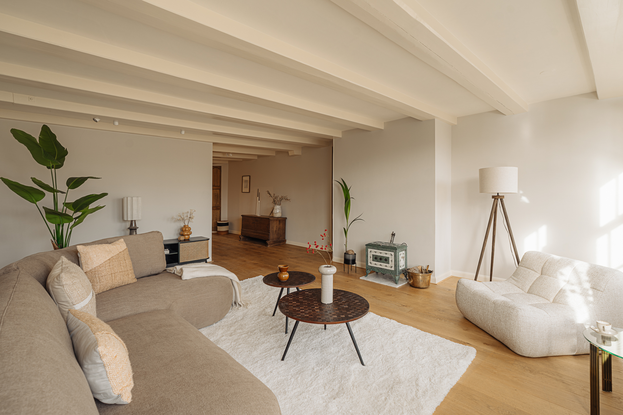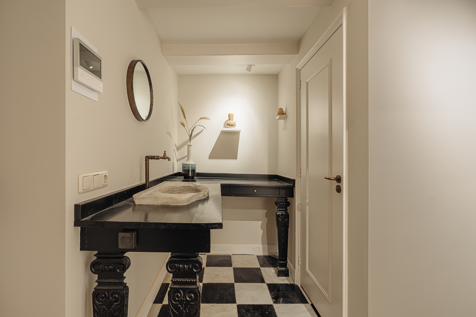 A spacious entrance with cloakroom, guest toilet and fountain leads to the living floor. At the front you’ll find the three window wide living room with wooden flooring, exposed beams, antique cast iron stove and an atmospheric view over the canal.