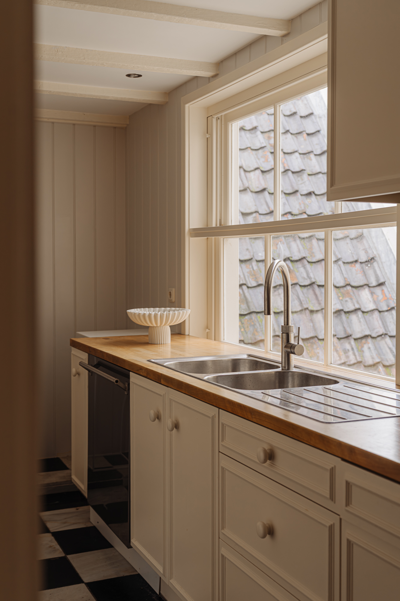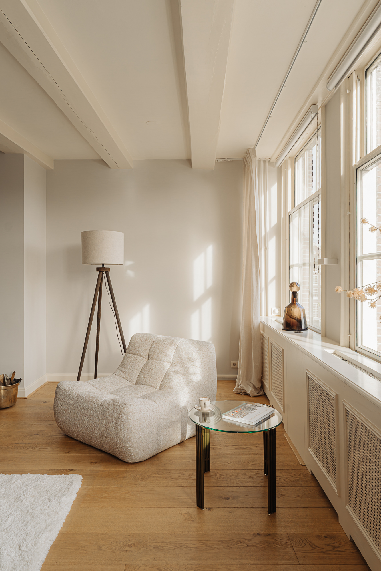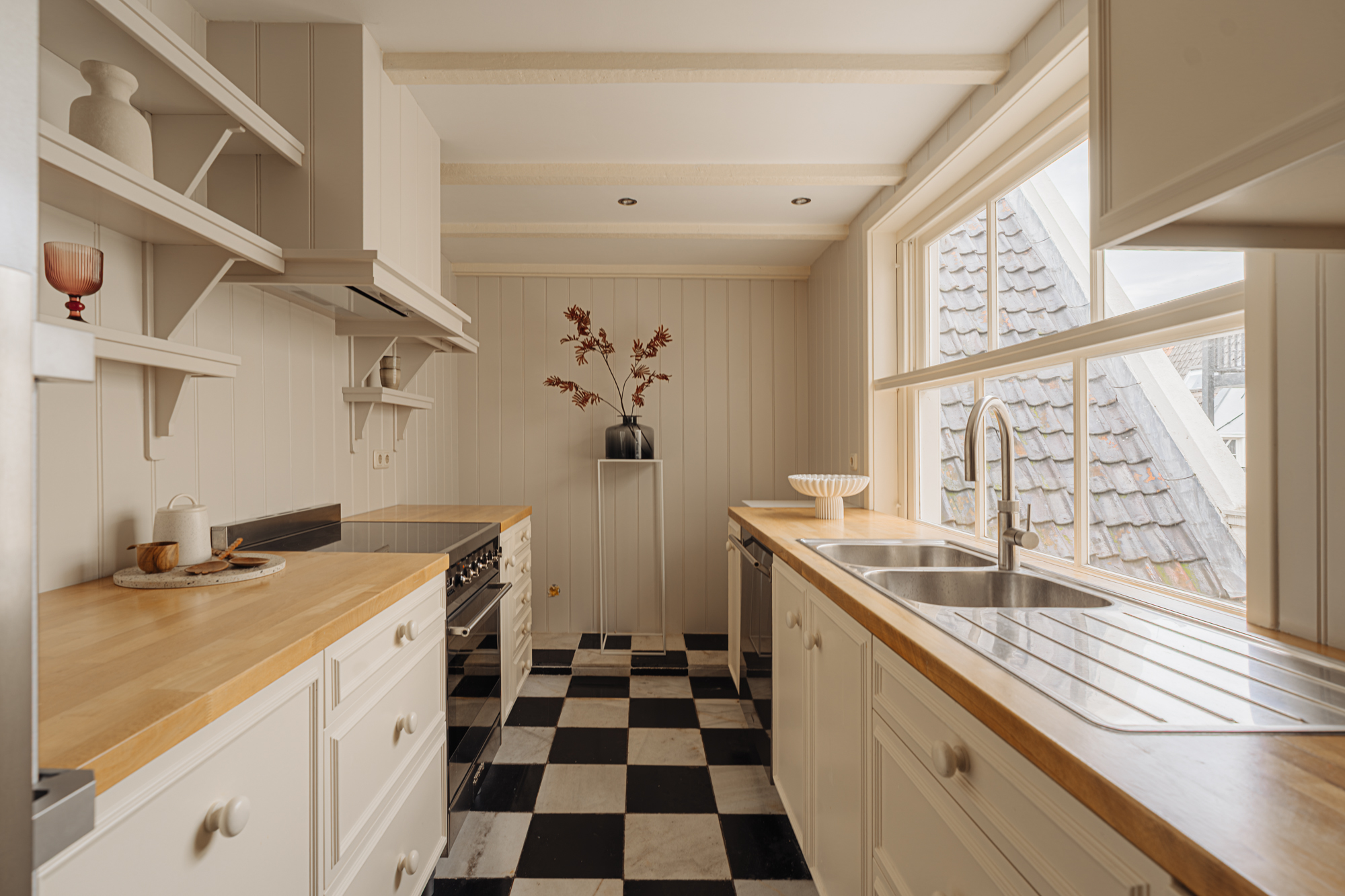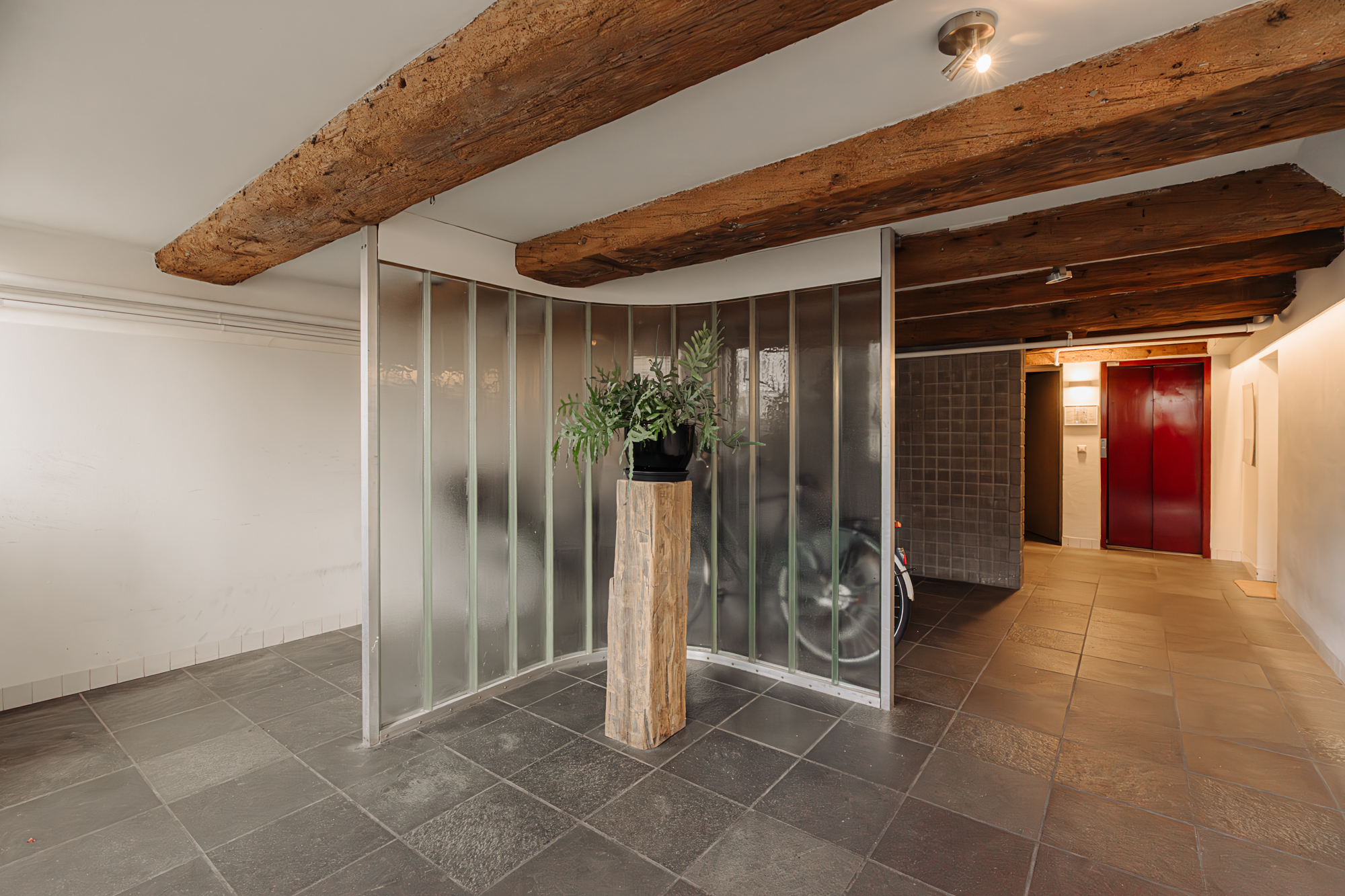 A spacious entrance with cloakroom, guest toilet and fountain leads to the living floor. At the front you’ll find the three window wide living room with wooden flooring, exposed beams, antique cast iron stove and an atmospheric view over the canal.