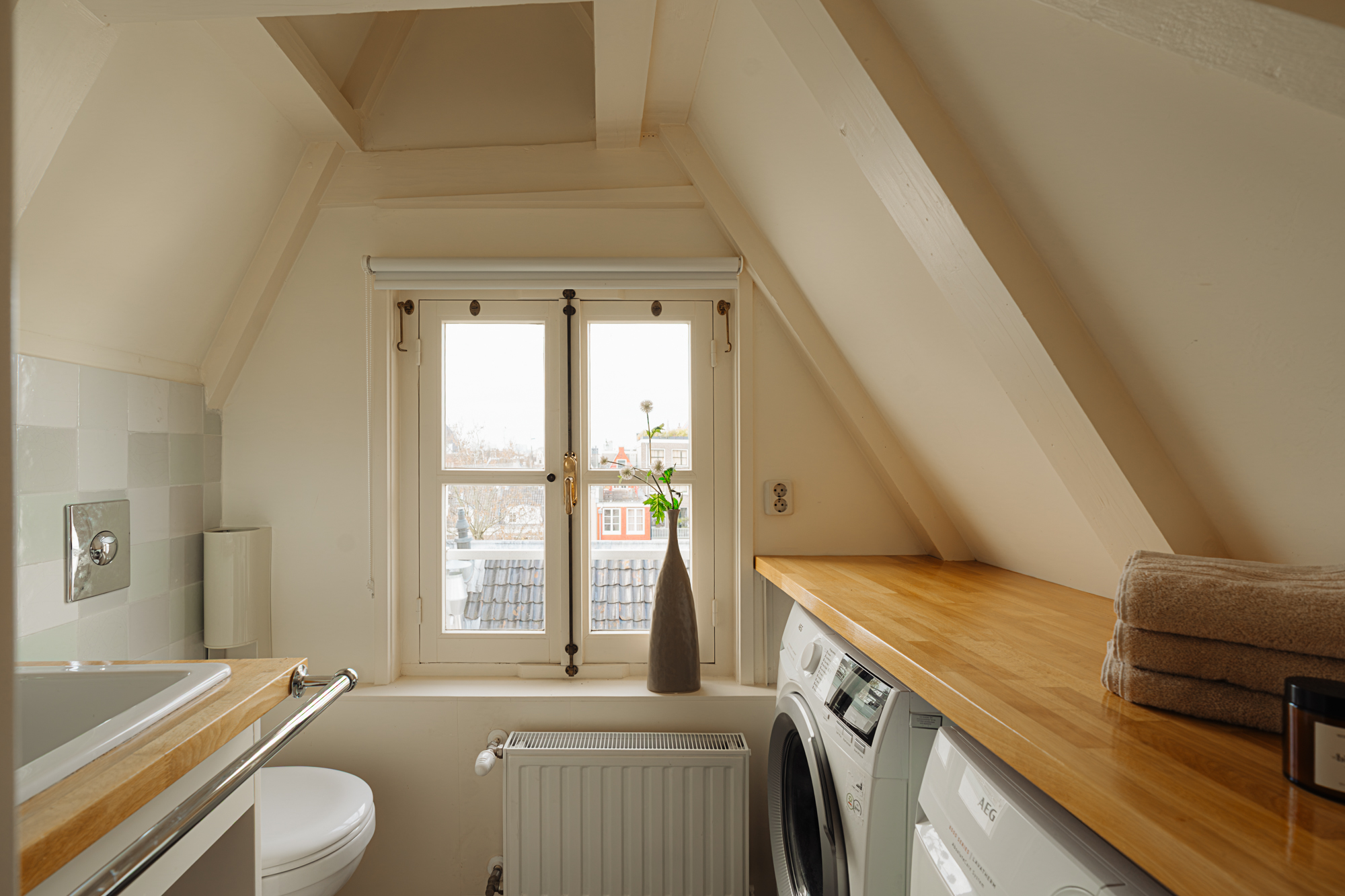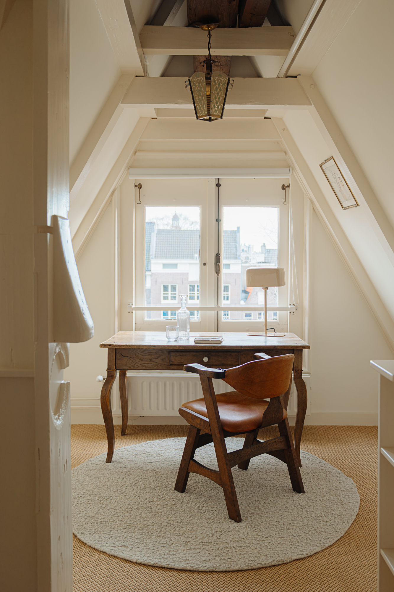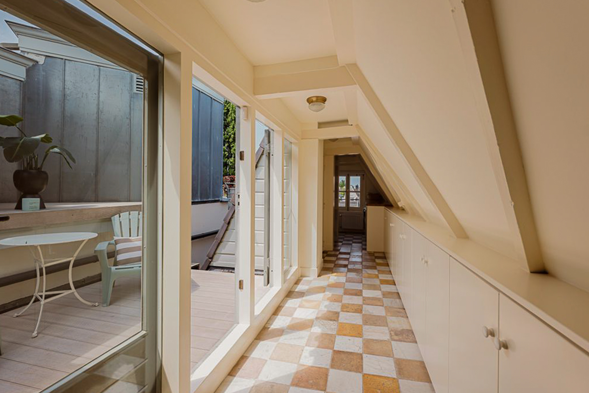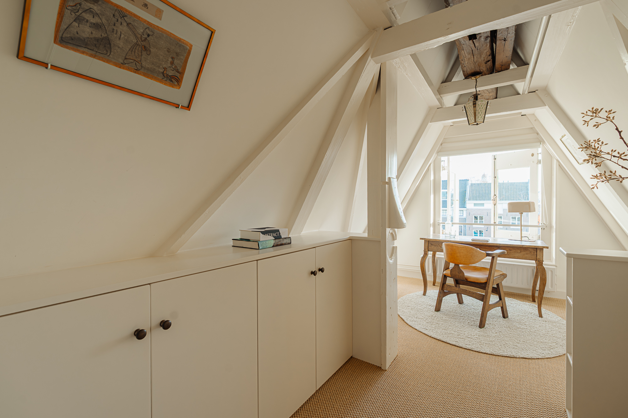 The top floor is suitable as a study, bedroom or guest room and also offers canal views. Here you’ll find the second bathroom, a private terrace and access to a spacious communal rooftop terrace overlooking, among others, the Posthoornkerk and the Noorderkerk.
