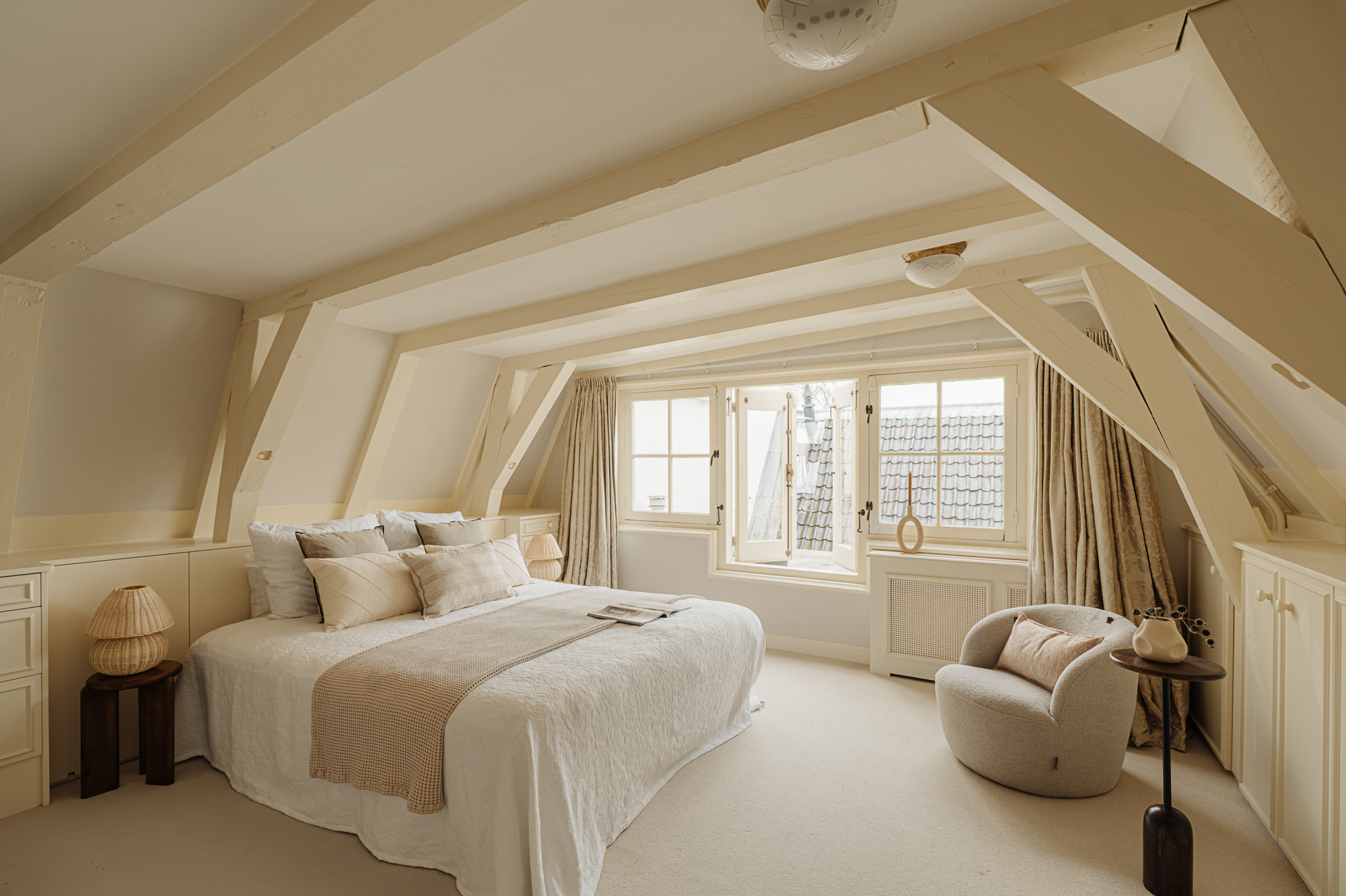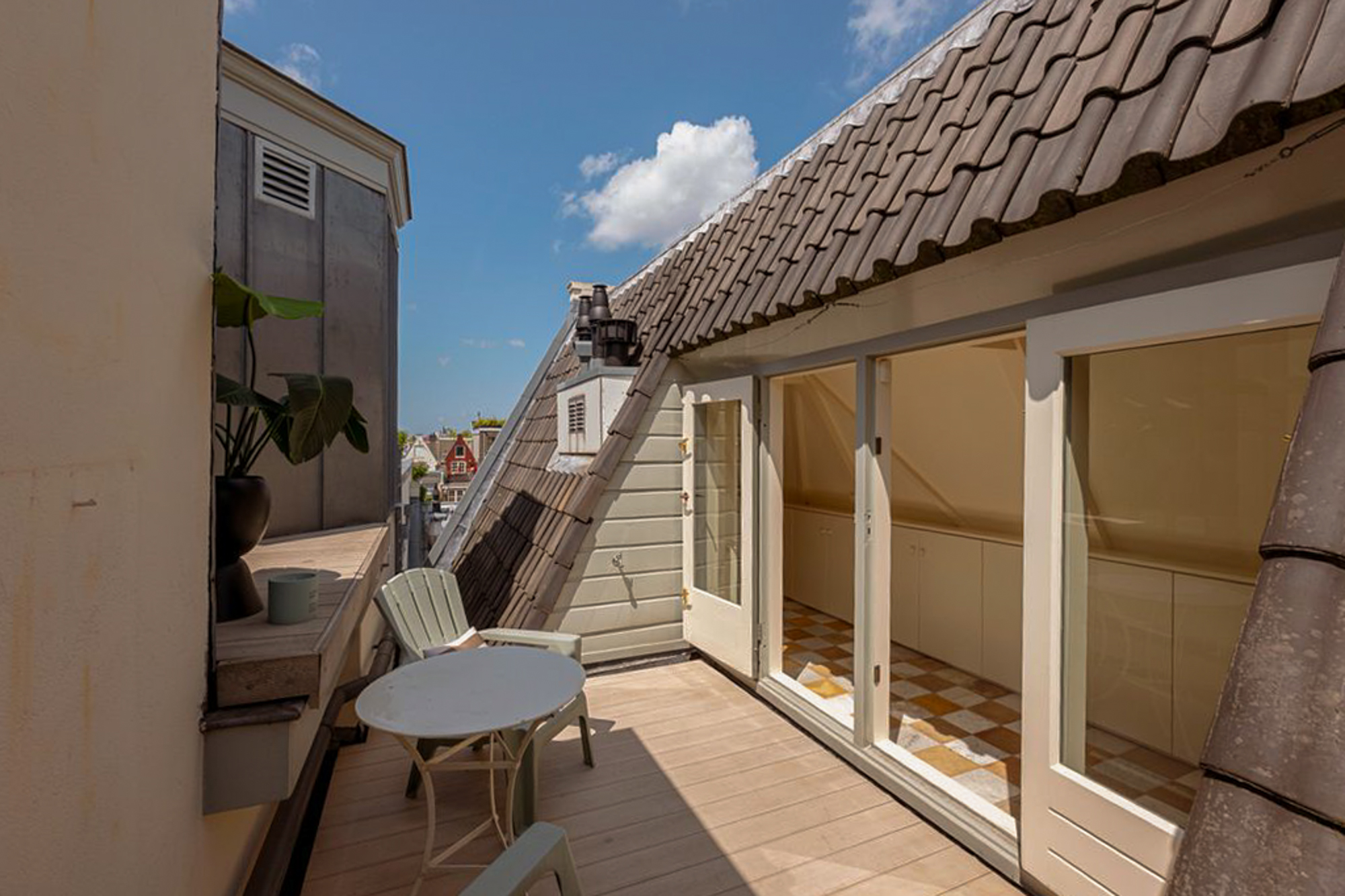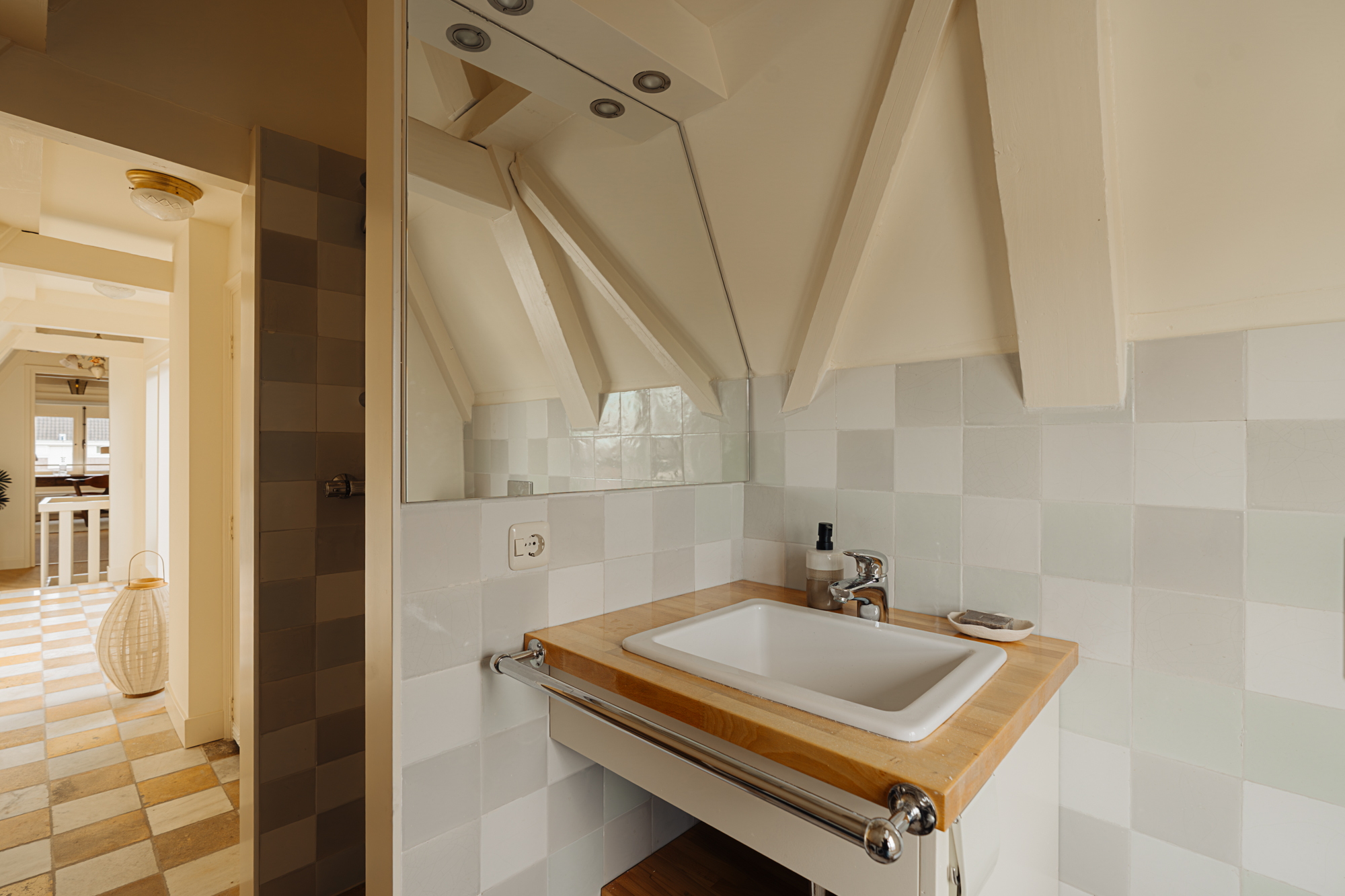 The top floor is suitable as a study, bedroom or guest room and also offers canal views. Here you’ll find the second bathroom, a private terrace and access to a spacious communal rooftop terrace overlooking, among others, the Posthoornkerk and the Noorderkerk.