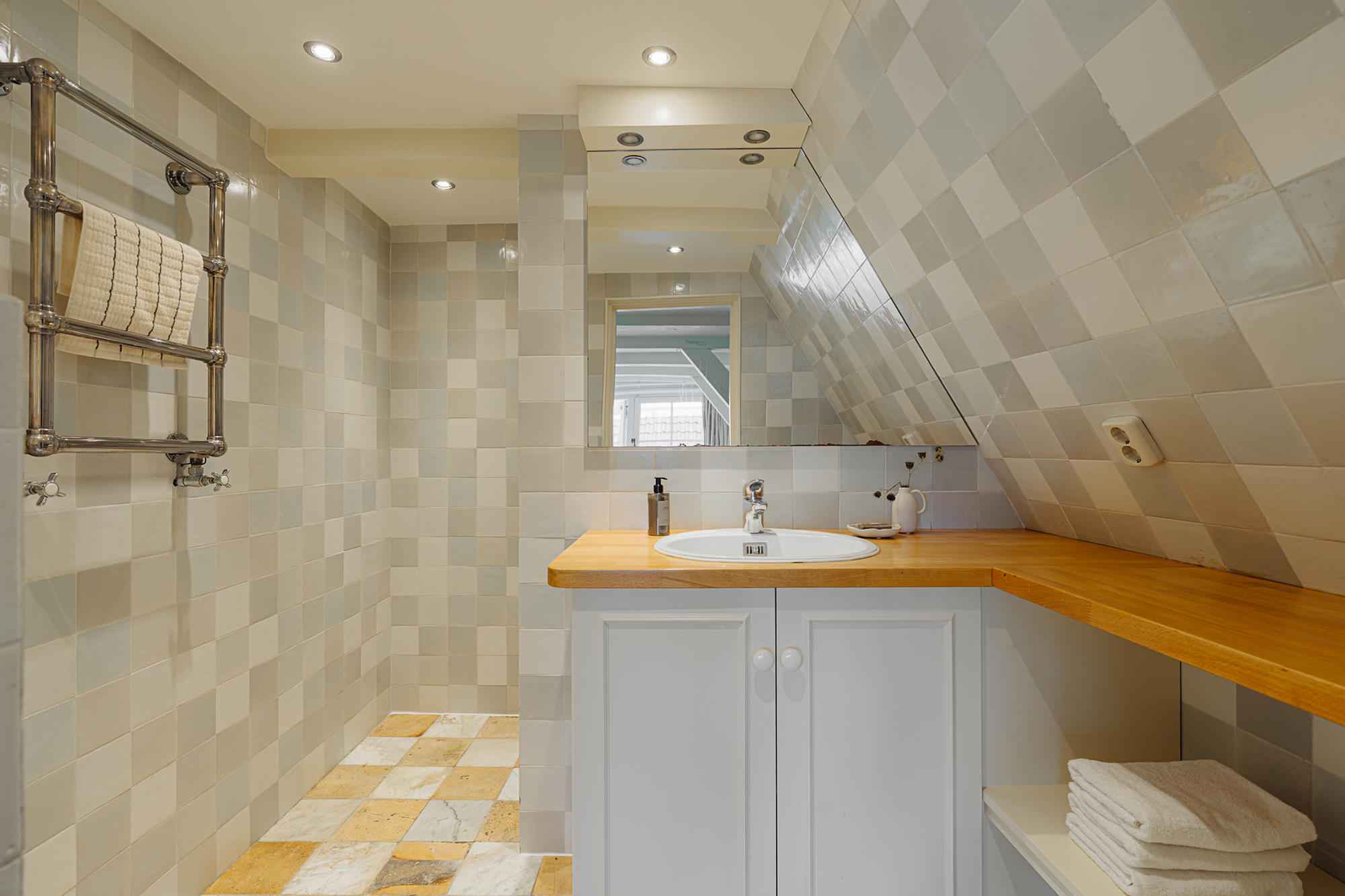 On the fourth floor you’ll find two generous bedrooms, both with visible beams and large custom wardrobes. The rear bedroom features an en suite bathroom with walk in shower, toilet and natural stone flooring.