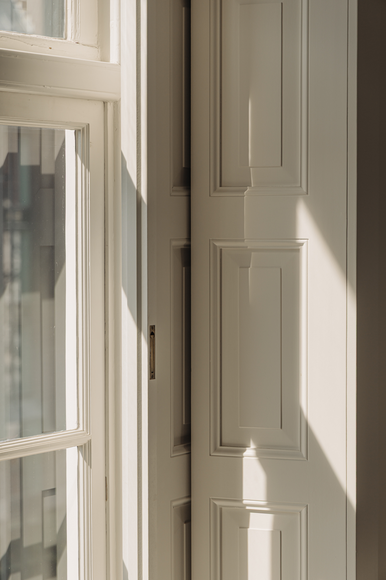 The main living floor, located on the second level, opens into a spacious hallway leading to the elegant lounge at the front. Ceilings over three metres high, classic wooden shutters, and expansive windows fill the space with natural light and grandeur. Overlooking the beautiful courtyard gardens of the canal block, the living room can be subtly divided from the kitchen area with original panelled doors. Wide oak floorboards and bespoke steel-framed doors add to the high-end finish throughout.