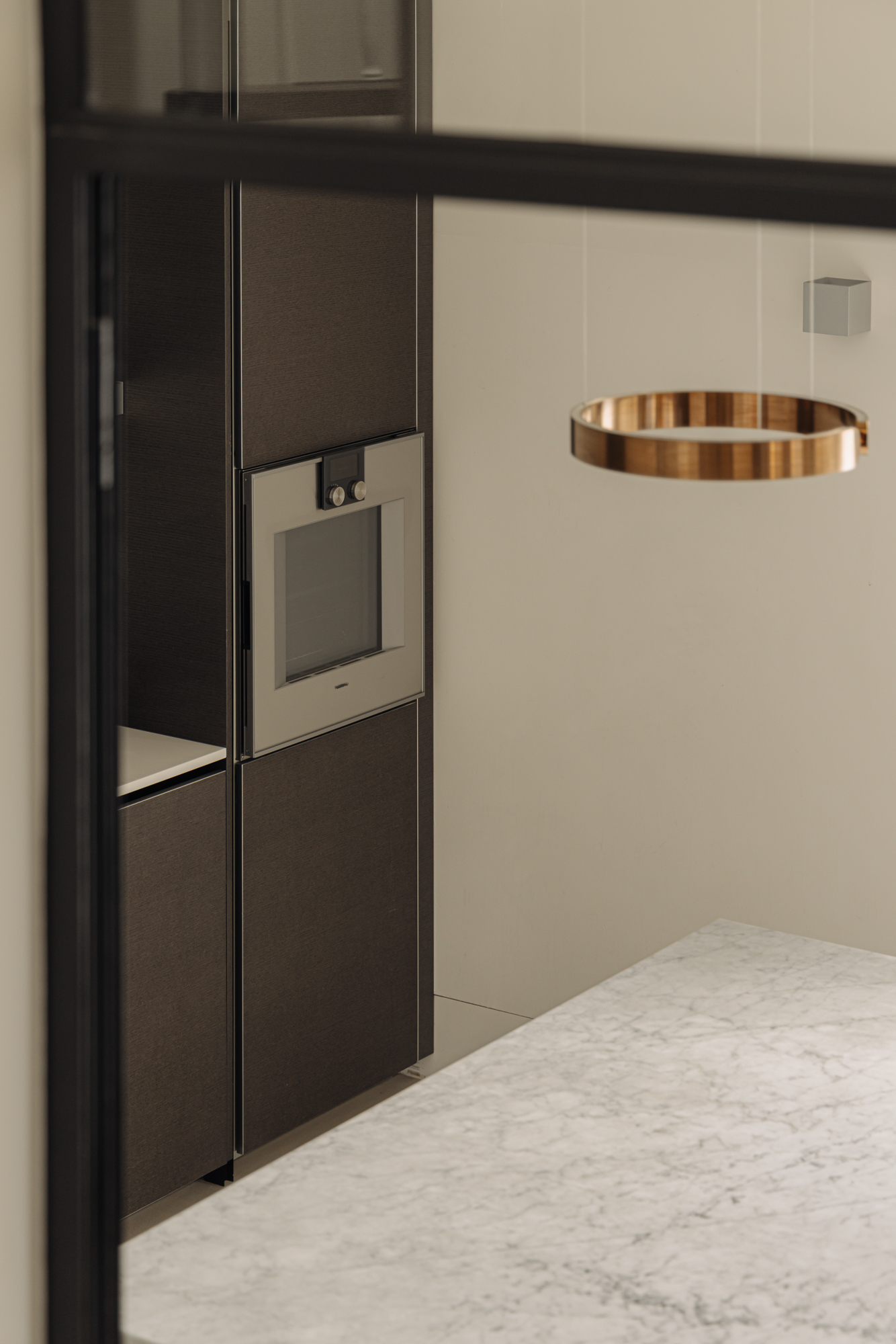 To the rear is the dining area and open-plan kitchen, executed in calm, earthy tones and centred around a generous island with a breakfast bar. The sleek, minimalist design by studio Molteni Dada is fitted with top-of-the-line Gaggenau appliances, subtly integrated to ensure clean lines and functionality. An attic area next to the kitchen offers extra storage space, alongside a designated laundry area with washer and dryer connections. A separate toilet is located off the central landing, while a large skylight above the staircase enhances the space with additional daylight.