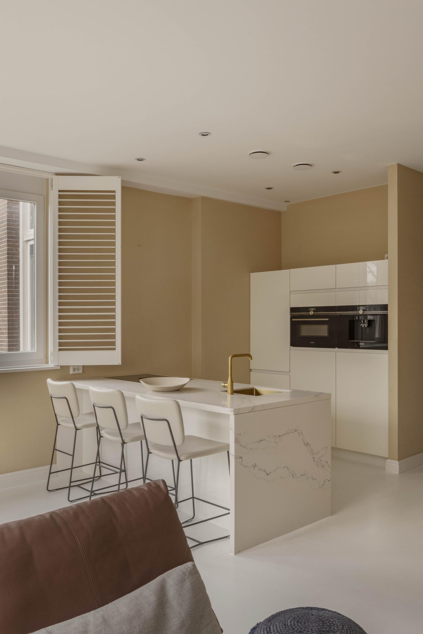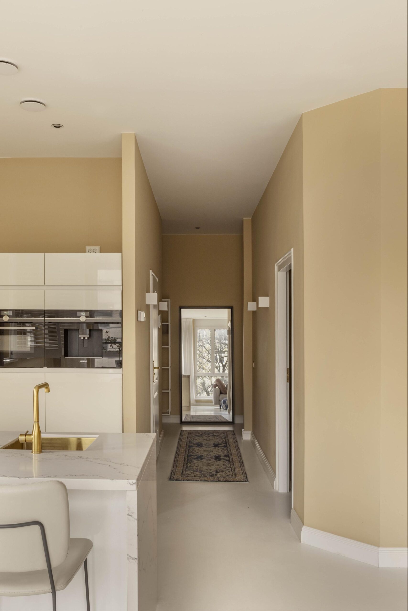 At the rear, the bright living room boasts nearly 3-metre-high ceilings and impressive windows that flood the space with natural light, enhanced by its corner position with views over the beautifully kept inner gardens. The open-plan kitchen is fitted with modern built-in appliances and designed with an eye for detail.